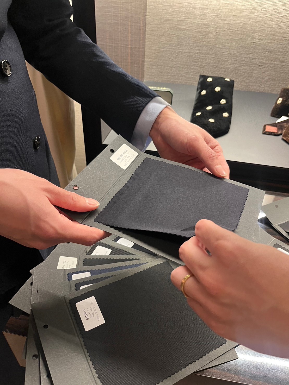 オーダータキシードを仕立てるうえでサイジング以外に最も重要になる部分が生地の選定です。生地によってタキシードの光沢感や着心地の柔らかさ、耐久性が異なるため、お二人のパーティーコンセプトやご新郎様のライフスタイルに合わせて最も適した生地をお選びいただけます。