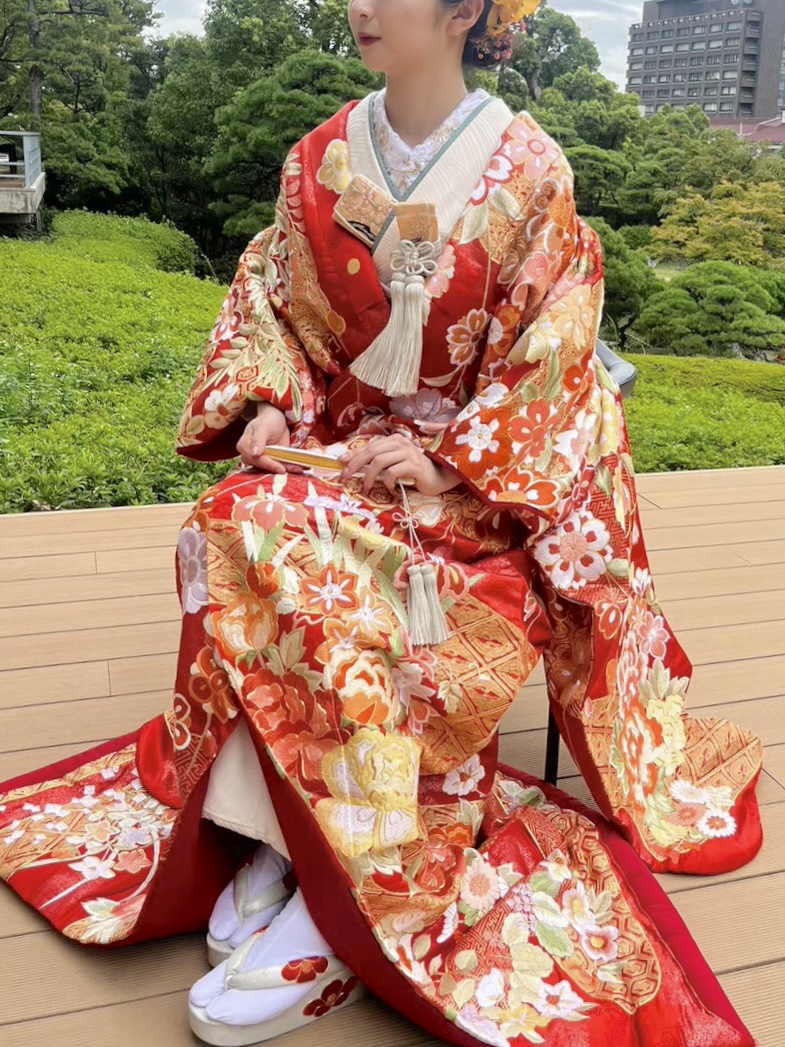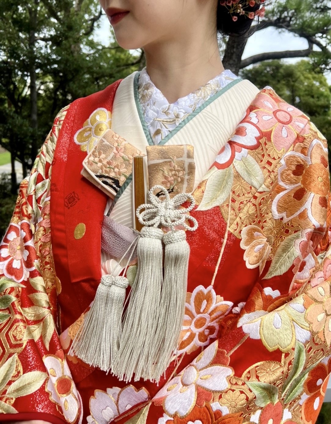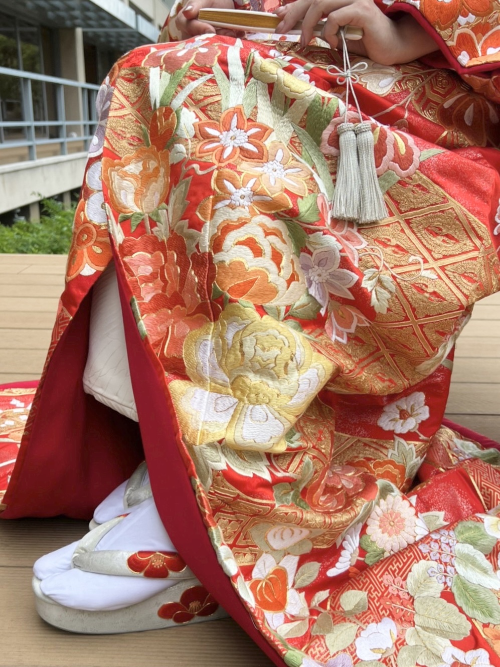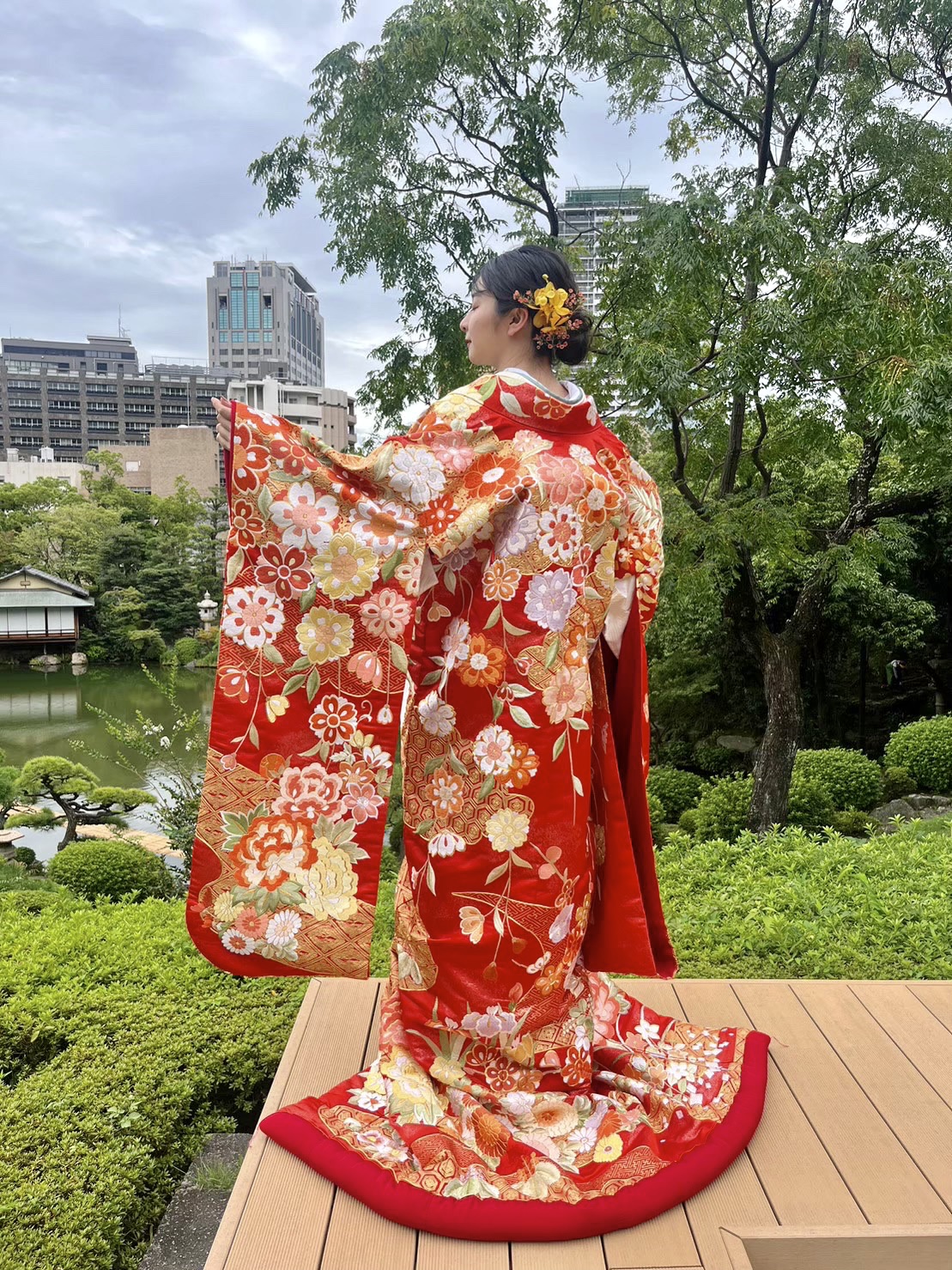 色打掛の歴史は遡ること600年前の室町時代。古くは上流階級の女性が”打ち掛けて羽織る”着物であり多くの女性が一度でも袖を通したいと憧れる衣装でした。金糸や銀糸などを使った刺繍物や、生地に優美な織物を織り込んだ織物や、生地に描かれた文様に彩色した友禅物など、熟練した職人の伝統技術が冴える格式高い艶やかな姿は現代でも支持のある人気の着物です。今回ご紹介させていただくのは鮮やかでありながらも、その色はとても上品で美しく、絶妙な赤色の雪幻百花絵図の色打掛。赤は生命や太陽を象徴する神聖な色の象徴であり、古くから魔除けの力があるとされてきました。また純白の白無垢やウェディングドレスから赤色の色打掛へお色直しすることで生まれ変わりを意味し、縁起物と考えられているのです。そんな赤地の上には様々な色とりどりの牡丹や藤、桜などの日本を代表する四季折々の花々が満開に咲き誇った絹糸の刺繍がたっぷりと施され幸福感を感じさせます。また、花々だけでなく菱形に文様化された鶴菱や、亀甲などのおめでたい吉祥文様、そして雪幻のような繊細な金の箔が細かくあしらわれています。日本の伝統技が贅沢に施されている重厚感溢れる色打掛だからこそ、長い歴史と風情のある相楽園の花嫁にお召いただきたい一着です。