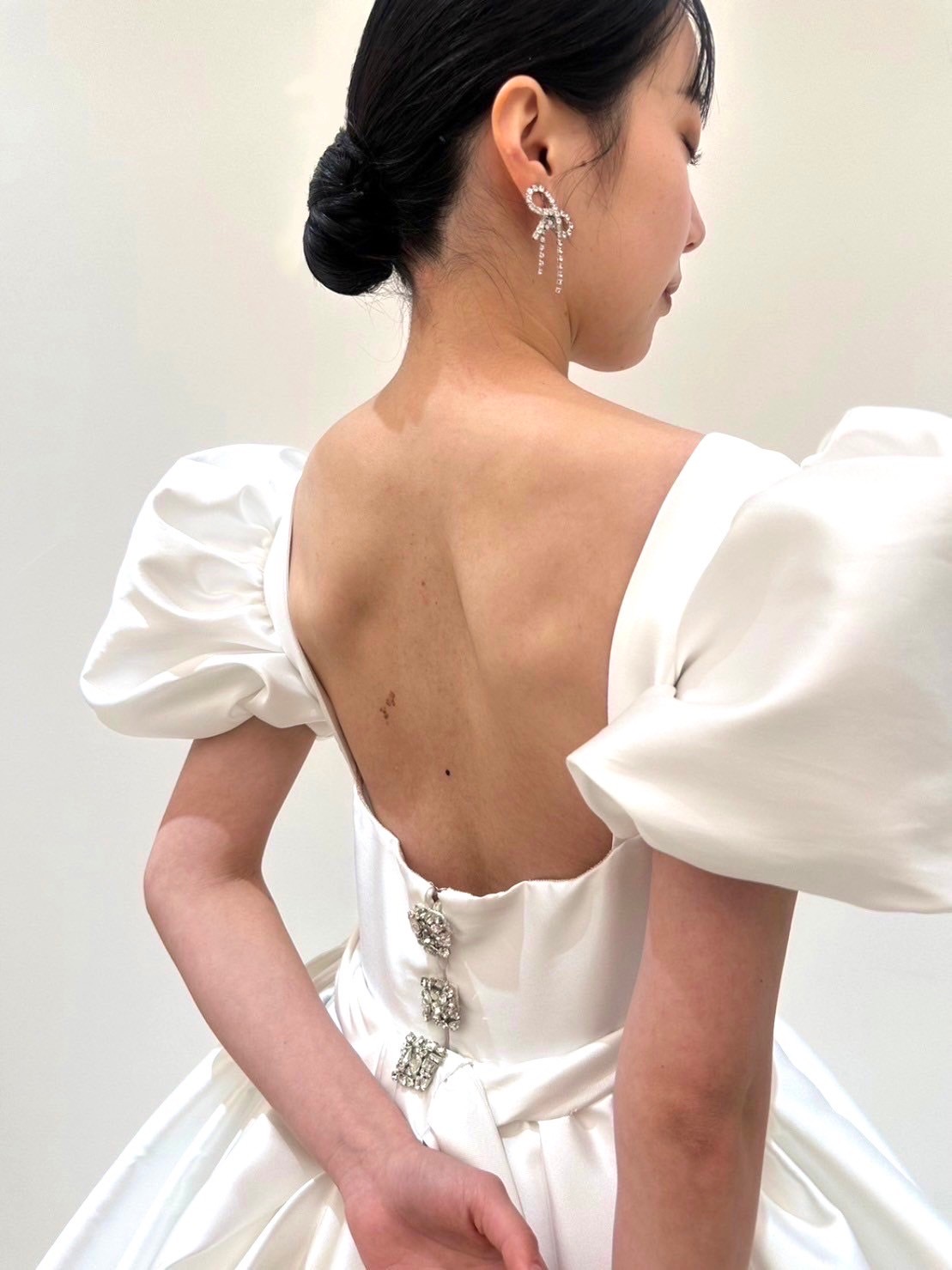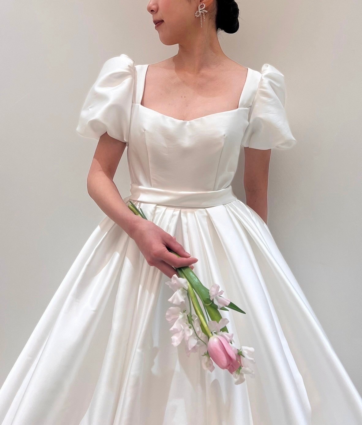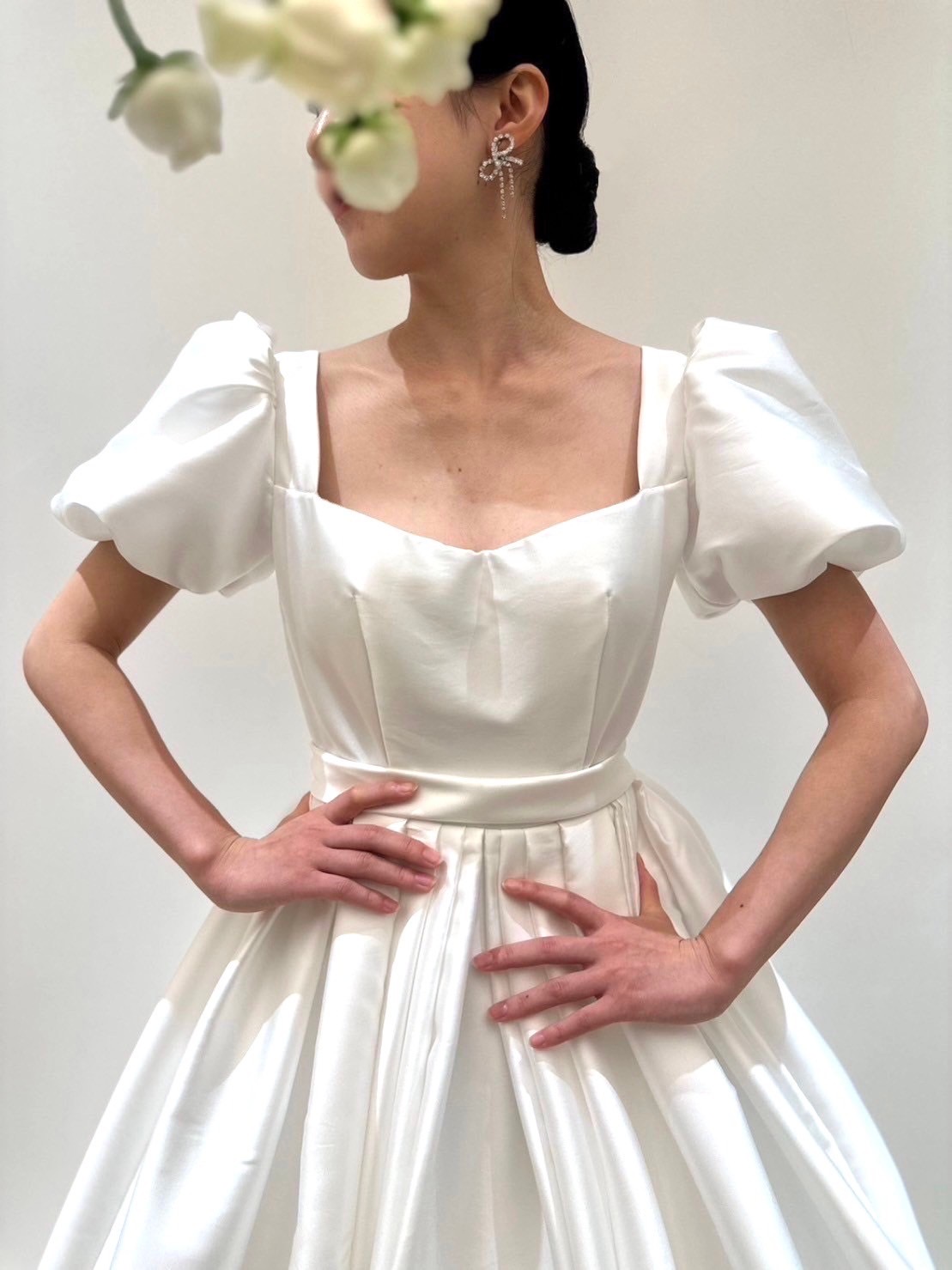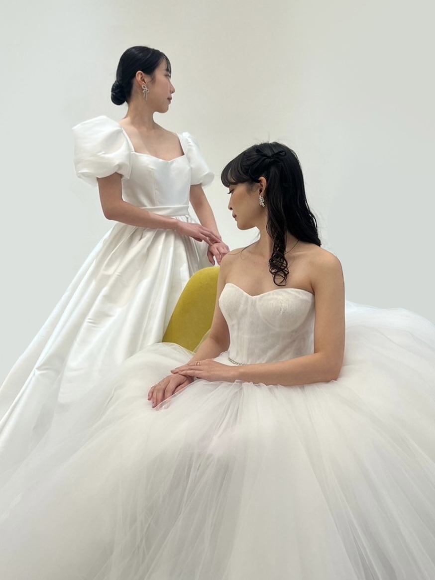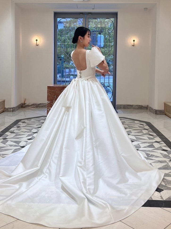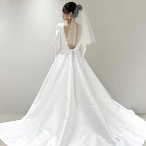 MINGと名付けられたボックスプリーツからなるボリュームたっぷりのプリンセスガウンにエアリーなパフスリーブ、光沢感ある最上級のミカドシルクで主役らしい存在感を引き立ててくれ、まさにおとぎ話から飛び出たプリンセスかのようなドリーミーでドラマティックな1着。どの時代でも憧れられるようなプリンセスラインのドレスは身に纏った瞬間に自然と背筋が伸びるようなそんな幸福感を感じさせてくれることでしょう。ウエストの細かくたたまれたタックが美しい丸みをおびたエレガントなシルエットを作り出し、パニエを入れずともプリンセスラインのボリュームを叶えて主役感を引き立たせます。胸元のスクエアカットはリーム アクラのアイコニックでもあり、デコルテラインをすっきりと綺麗に見せてくれます。バックスタイルには華やかさを添えるシルバービジューが施され、花嫁の美しさをより際立たせます。耳元にはトレンドのリボンモチーフのイヤリングを合わせ、ヘッドアクセサリーはあえて使用せずにミニマムなヘアスタイルに。フェミニンな印象になりすぎず、女性らしい洗練された印象にしてみてはいかがでしょうか。