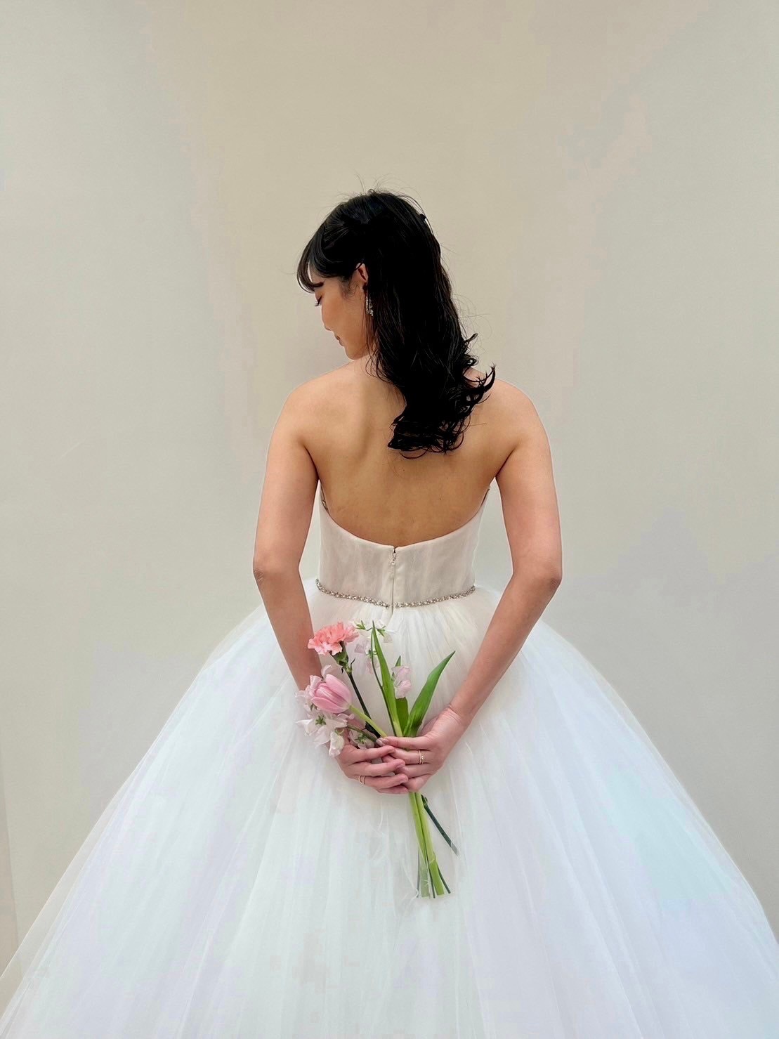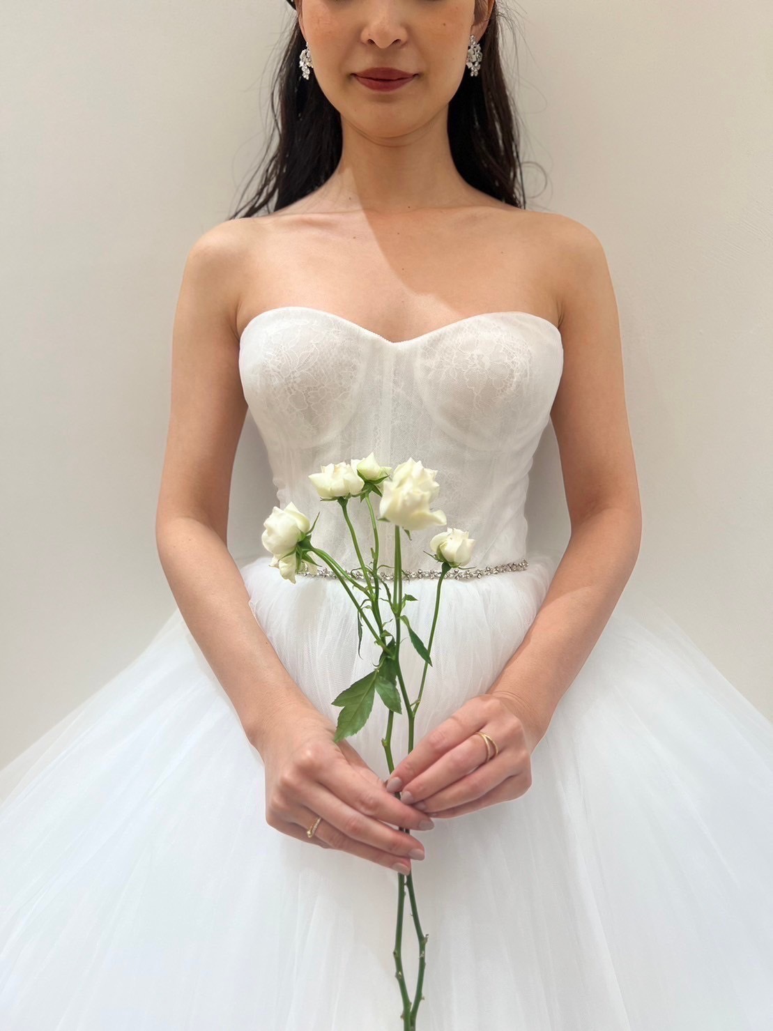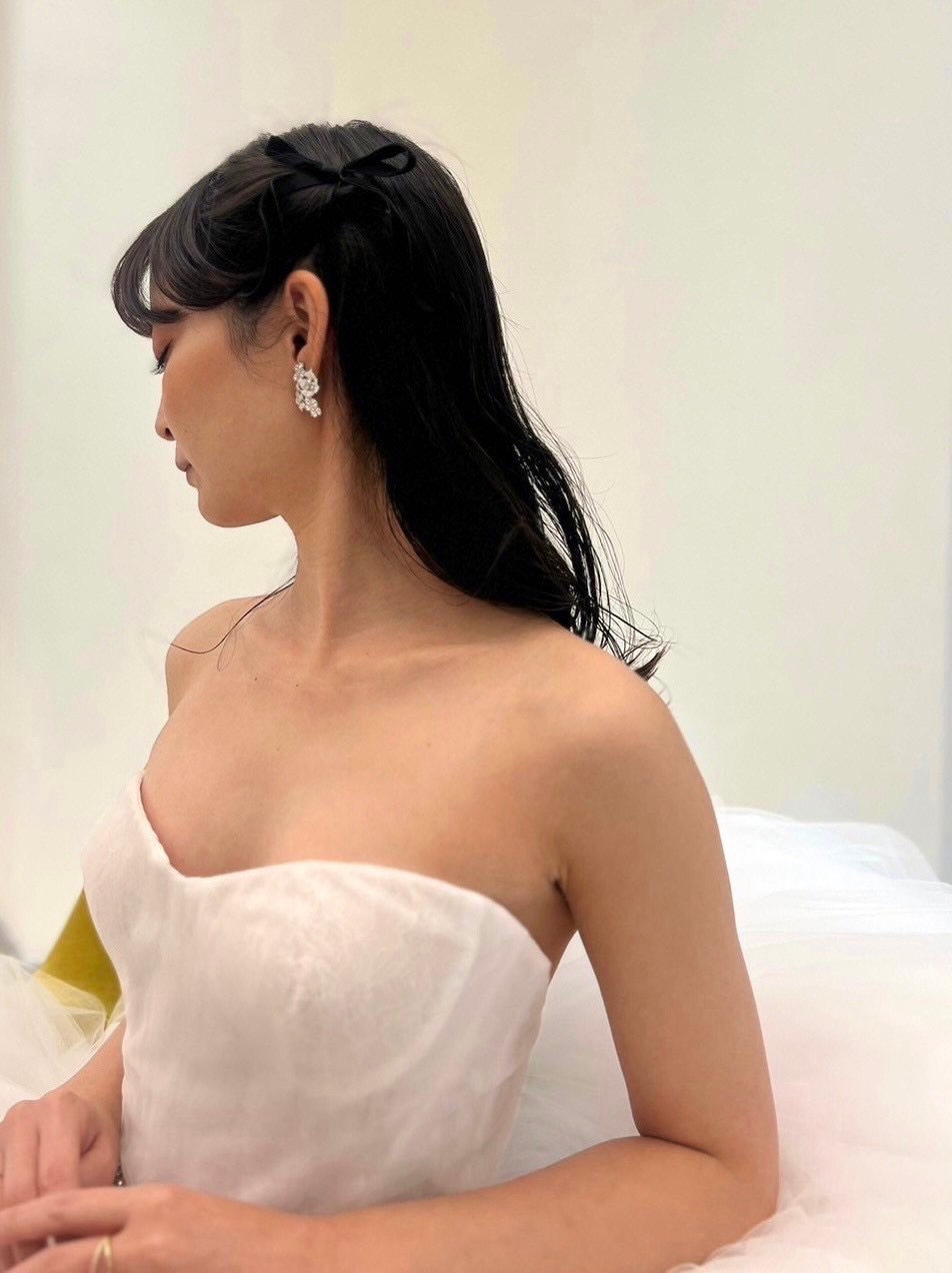 ARIANAと名付けられたチュールたっぷりのプリンセスガウンのドレスはspecial design for TREAT。それは、ザ トリート ドレッシング、そして日本の花嫁に向けてデザインチェンジを施したスペシャルなデザイン。日本の花嫁に向けてアメリカンスリーブ仕様だった胸元のデザインをよりドレスらしさを演出するため、ビスチェのデザインに変更しお届けすることとなりました。花嫁の憧れをぎゅっと詰め込み、ザ トリート ドレッシングでしかお召しいただくことができない特別感たっぷりの一着。シルク素材を用いたチュールが何層にも重なり創り出されることで、ふわっと柔らかく広がり、ボリュームたっぷりでありながらとても軽い着心地が叶うため、お式当日も普段のご自身らしくリラックスしてお過ごしいただけます。胸元には繊細なシャンテリーレースがあしらわれており、可憐で清楚な印象に。ウエストにはビジューが施されていることで、甘すぎない華やかさを叶えていただけます。細部までこだわり抜かれたディテールは、リーム アクラだからこそ叶えることのできる特別な一着です。耳元にはフラワーモチーフのイヤリングを合わせ、ヘアスタイルはハーフツインテールにブラックのベロアリボンをプラス。シンプルなデザインのドレスだからこそ、アクセサリーやヘアスタイルで遊び心を覗かせ、花嫁の愛らしさを演出してみてはいかがでしょうか。
