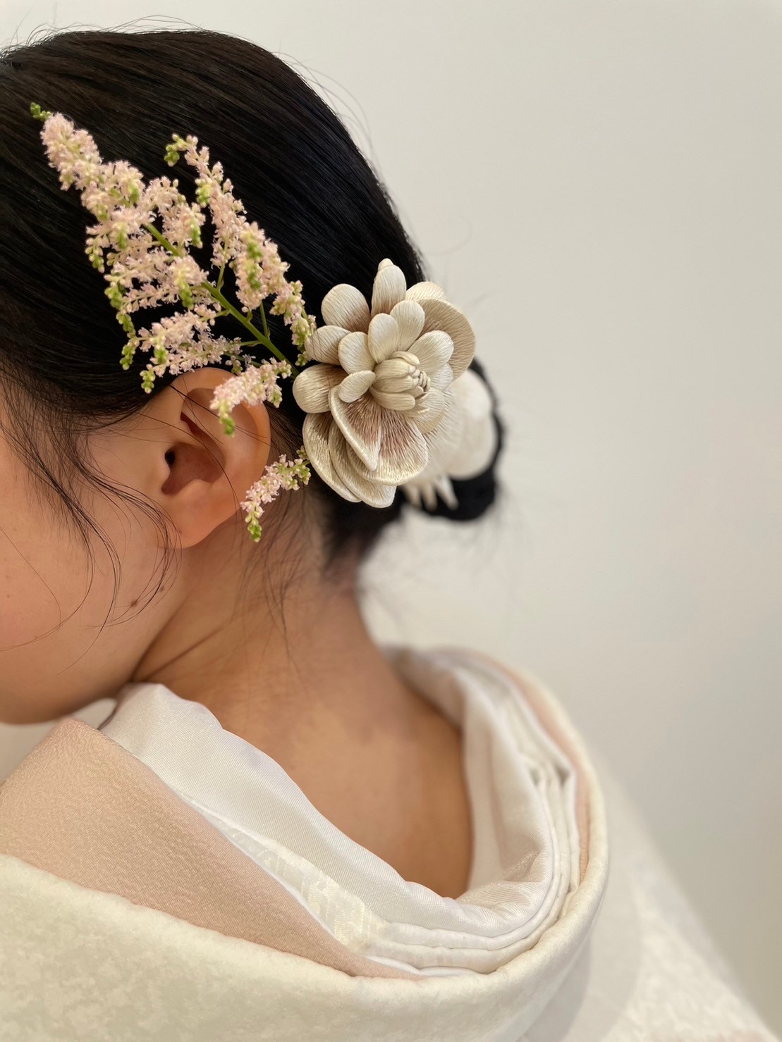 群馬県桐生の柔らかな絹糸を使い、伝統的な横振り刺繍によって生まれたエミタカザワの刺繍花。今回、皆様に心からご紹介したいと思う髪飾りの数々が再入荷いたしました。お選びいただいた白無垢や色打掛に合うよう色味は白、銀、金、黄色をメインに買い付けを行っています。作品一つひとつが手作業で施され、恵美さんご自身の日常から生まれたインスピレーションを形どった架空のお花の名前が付けられた作品たち。そんな刺繍花は、どれをとっても息を呑むほど儚く繊細で惹きつけられる魅力があります。晴れの日を迎える花嫁に添えた瞬間、花嫁の持つ美しさや白無垢自体の色味、柄行きは引き立たせながらもまるで地に咲く本物の花ように凛と咲き誇ります。今回のコーディネートでは、生花と合わせて二種類の刺繍花を重ね付けいたしました。幾重にも織られた仕立ての緻密さがあるからこそ、華美になりすぎることなく愛らしさと品のある華やかさを実現します。