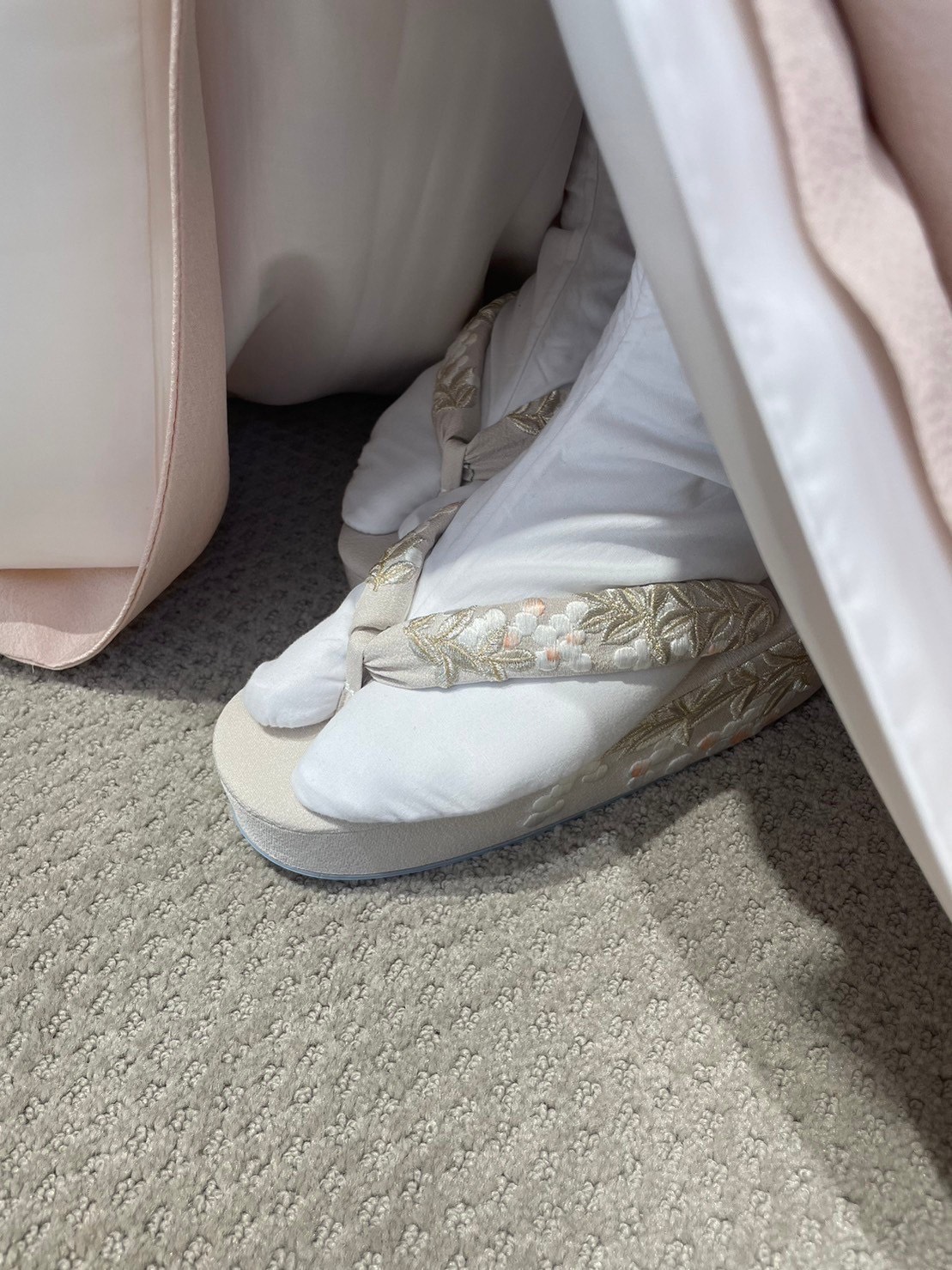 白無垢の柔らかな桃色に合わせお小物も桃色と金色中心に暖色系でまとめ、華やかでモダンなコーディネートに。掛下には白無垢の桃色に近い色味をセレクトし、明るく女性らしい雰囲気を演出しています。新芽が芽吹き出す春の前撮り、挙式を予定されている花嫁にもおすすめのコーディネートです。また花嫁道具である箱迫、懐剣と歩みを進めるたびに覗く草履は淡い灰色を合わせ、帯揚には薄紫色をセレクト。あえて白無垢の桃色に似通った色味を使うことで、統一感はあるもののこなれ感が出てモダンな印象になります。白無垢が控えめな色使いだからこそ、コーディネートによってさまざまな表情を見せることができ花嫁それぞれの美しさを楽しんでいただけるのです。
