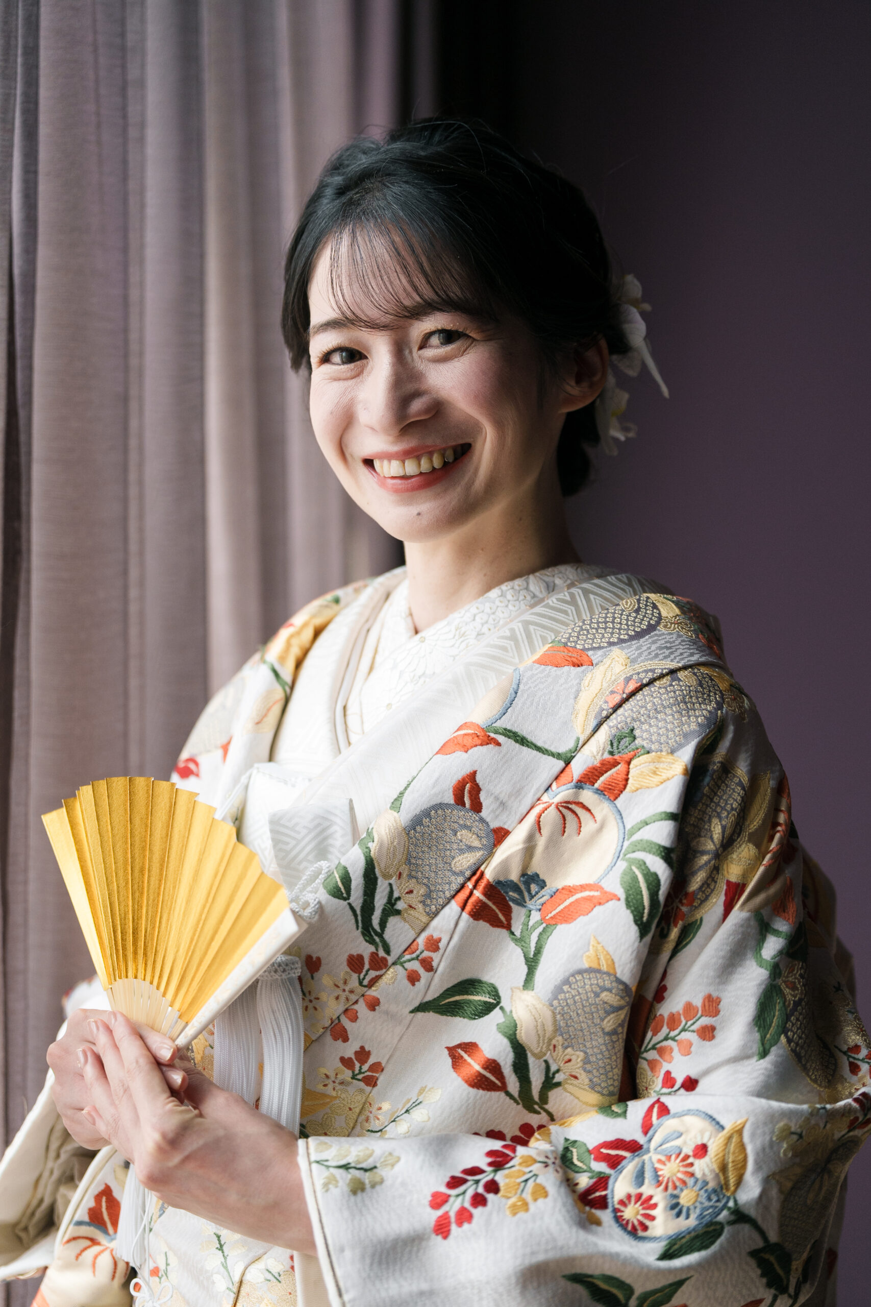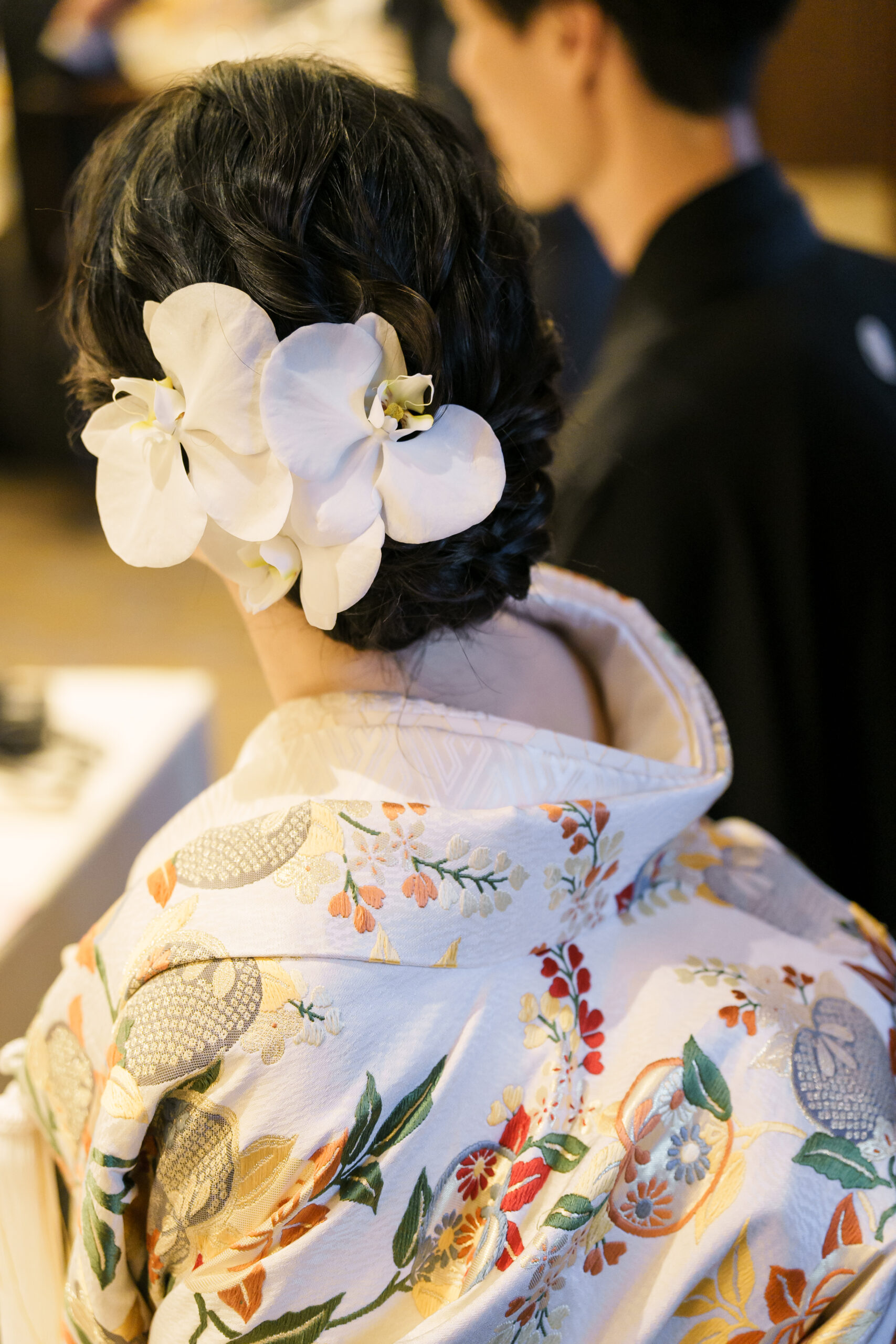 そんな特別な1日にご新婦様が選ばれたのは、澄みきった白地に彩られた橘と桐の花が咲き誇る上質な色打掛。上皇后美智子様が愛用されていた袋帯の絵柄をザ トリート ドレッシングの為に色打掛として作られた特別な1着なのです。王道な色合わせはあえて使わず、澄んだ白地は正絹の素材の美しさを引き出します。長寿の意味を持ち古来よりお祝い事の際に用いられてきた橘は、暖色を基調としながらも深みのある藤色や御空(みそら)色で描かれ、ご新婦様の上品かつ可憐な雰囲気をより印象深く引き立たせます。こちらの色打掛が入荷した際、真っ先に、凛とした雰囲気の中にも周りを明るく幸福感に包みこむようなご新婦様のお顔が浮かんだのを覚えています。挙式での胸元のお小物は清楚にすべて白色をセレクト。笑顔がやわらかいご新婦様の雰囲気に合わせて白地に細やかな金刺繍がアクセントの半衿をあわせました。金色の小ぶきの色と掛け合わせ、重ね衿は金色の七宝柄を取り入れました。髪飾りには「幸福が飛んでくる」という意味合いを花言葉に持つ純白の胡蝶蘭を。お小物は明るい白色と金色に統一し華やかさを出しつつも、聡明なご新婦様の魅力と、色打掛の高貴な柄行が引き立つような色合わせで美しさを最大限に演出します。