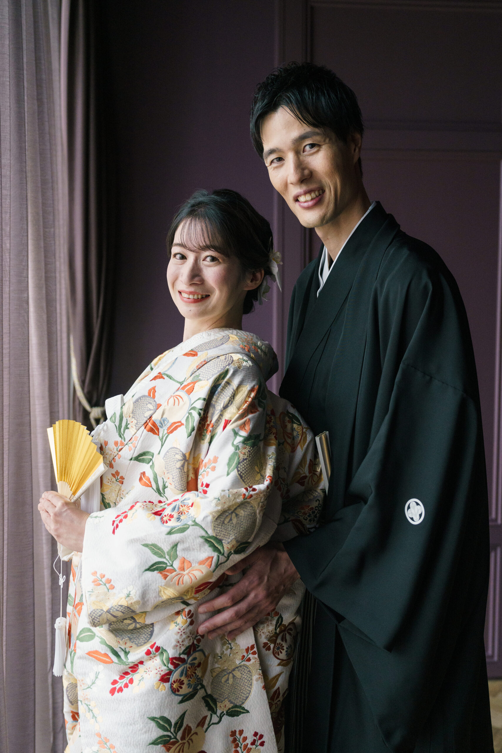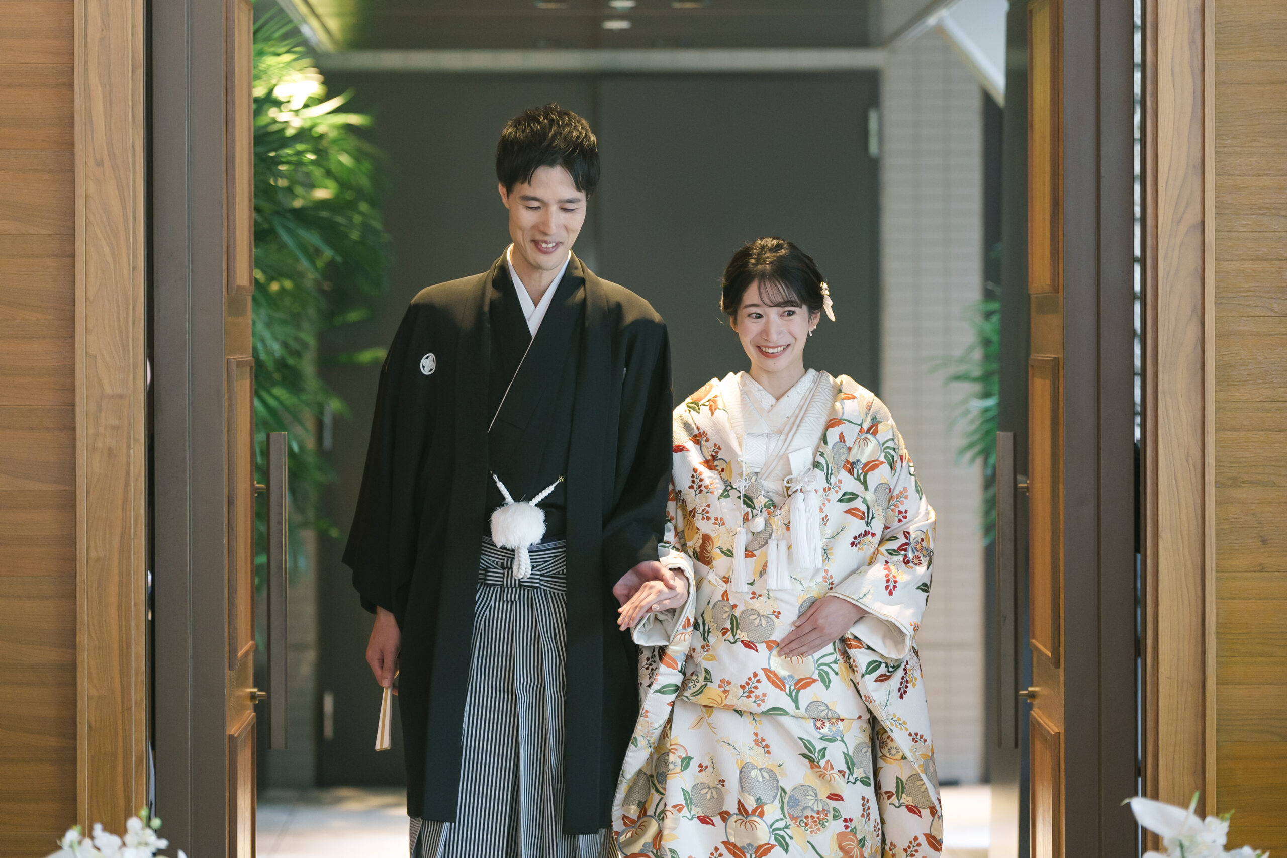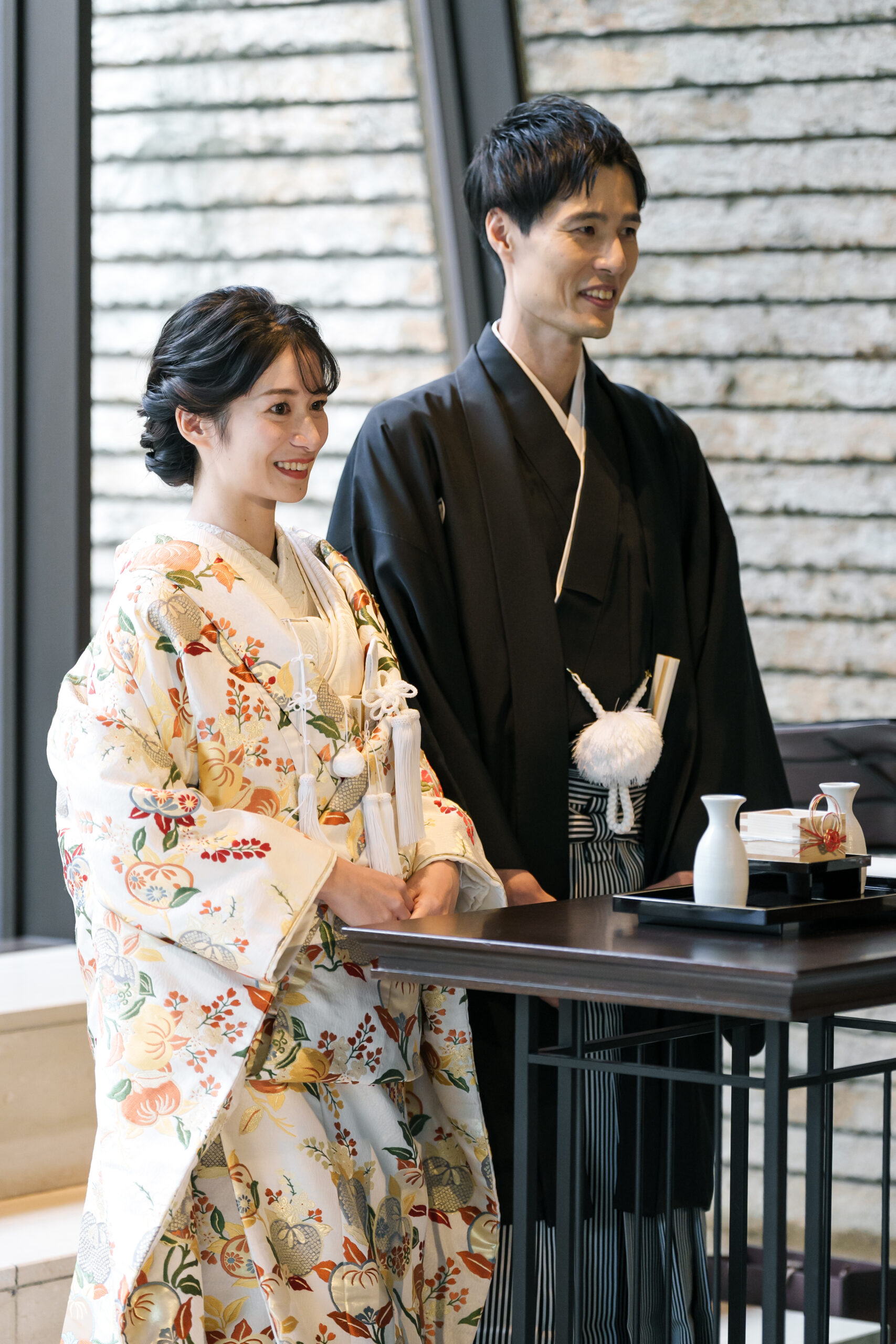 夏の日差しがやわらぎ、オリエンタルホテル神戸に秋風が心地よくそよぐ10月、大切な方々が温かく見守る中、お二人の最良の1日が和装人前式で執り行われました。日本の伝統文化である和装の中でも、ご新婦様が選ばれた色打掛は婚家の人になるという意味合いが込められており、お祝い事にも相応しく古き良き時代から愛され続け、現代でも格式が高い正礼装として扱われています。ご新郎様も男性の正礼装である黒の紋付羽織袴をお召しになられました。人前式はゲストの前で誓いの言葉を述べて愛を誓う形式で、招いたゲストが証人になりお二人の未来を祝福し、会場は幸福感たっぷりのひとときに包まれました。ゲストを巻き込んで感動と今までにない新鮮さを感じてもらえるよう、お二人らしい素敵なオリジナリティ溢れる挙式スタイルを叶えられました。150年の歴史を紡ぐオリエンタルホテル神戸のチャペルは天然素材の木と大理石で造られており、その神聖なチャペルで日本の伝統文化である和装を身に纏うことは人生の節目である日に相応しいのではないでしょうか。