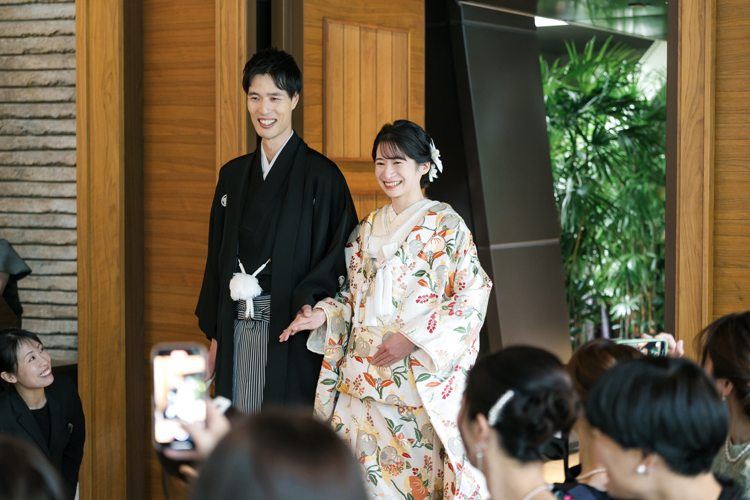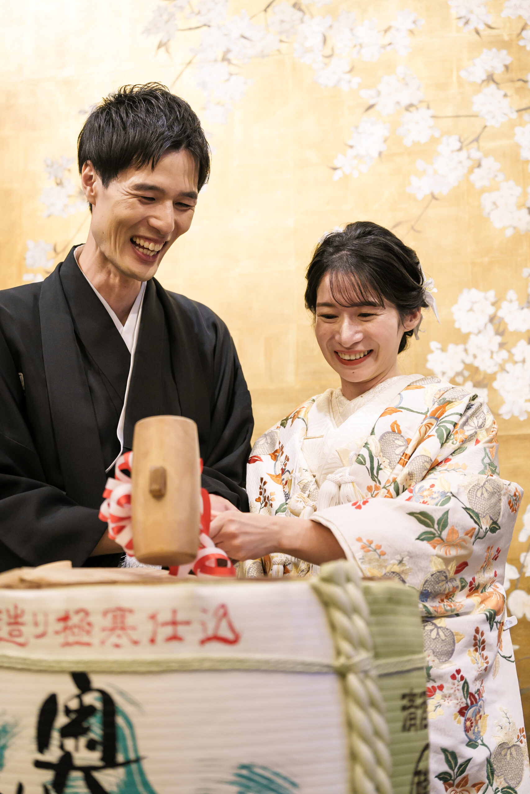 ダークブラウンを基調としながら大きな窓を持ち、上質で開放的な空間が広がるザ ロイヤル ボールルーム ウエスト。お二人の背景には日本の国花である桜の金屏風が広がり、趣を感じられる披露宴会場はお二人の和装姿をより美しく引き立てます。ご新婦様の胸元のお小物はやわらかな白金にチェンジし、挙式とは異なる披露宴のシーンにそっと華を添えます。演出にもこだわられたお二人は、披露宴内で鏡開きを行われました。酒樽の蓋の丸は夫婦円満を表現しており、それを開くことによって「二人で未来を開いていく」という素敵な意味が込められています。鏡開き後の日本酒は皆様に祝杯として配られ、オリエンタルホテル神戸こだわりの料理とともに嗜まれゲストにとって非日常を感じられる記憶に残る時間となったのではないでしょうか。