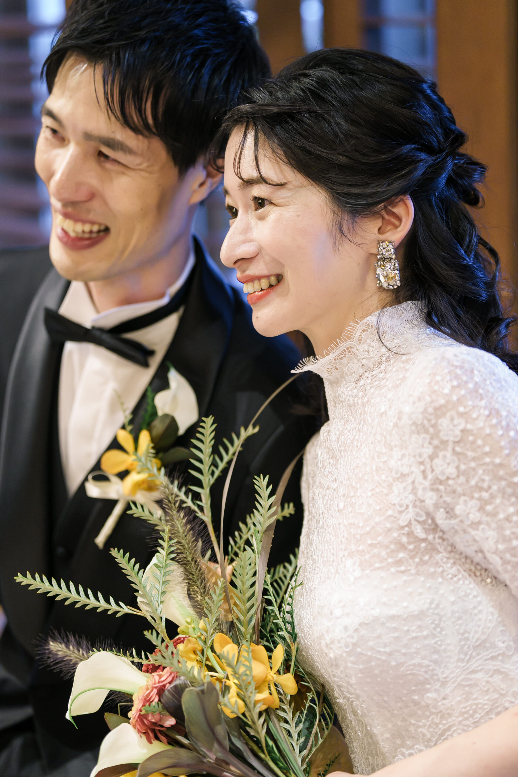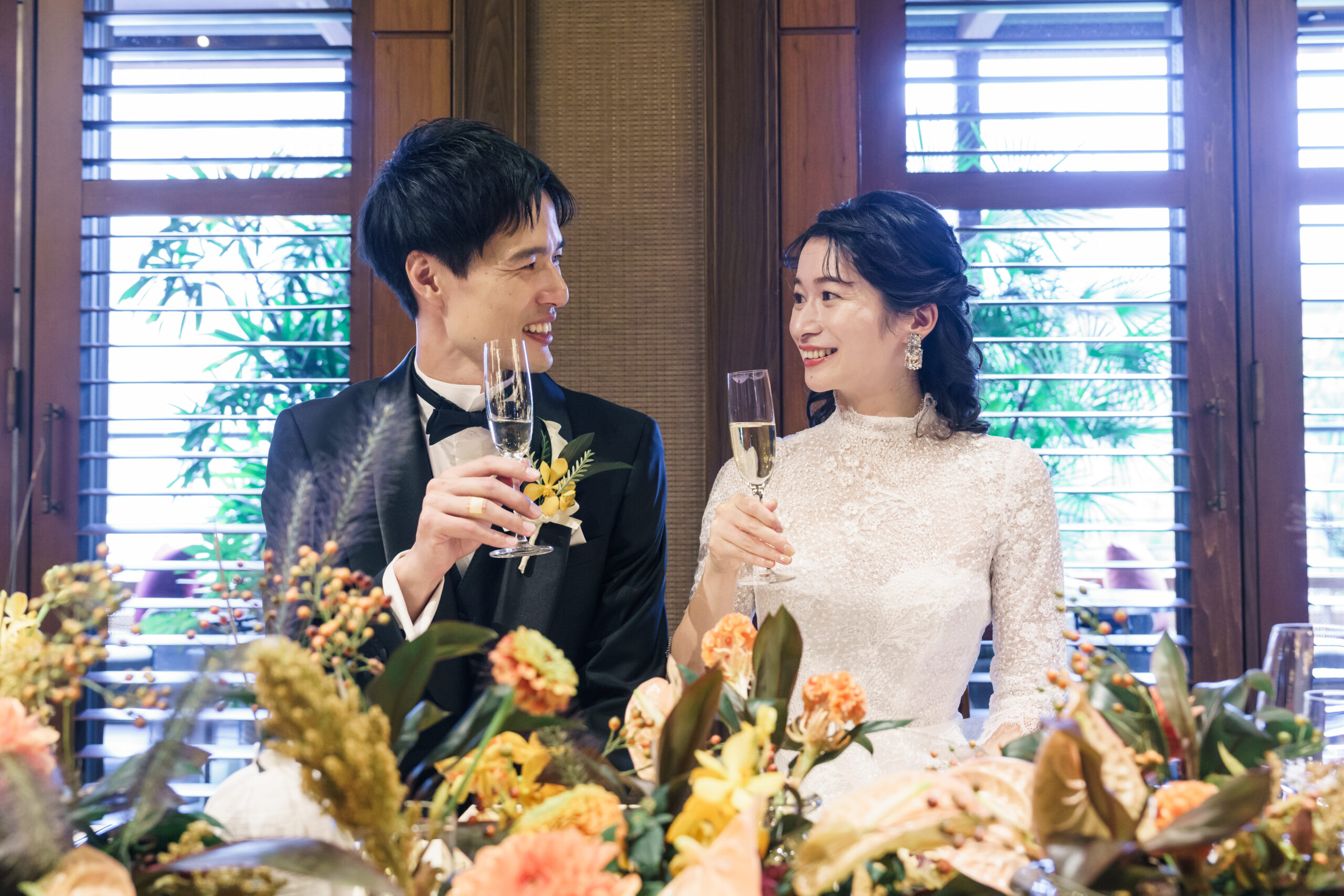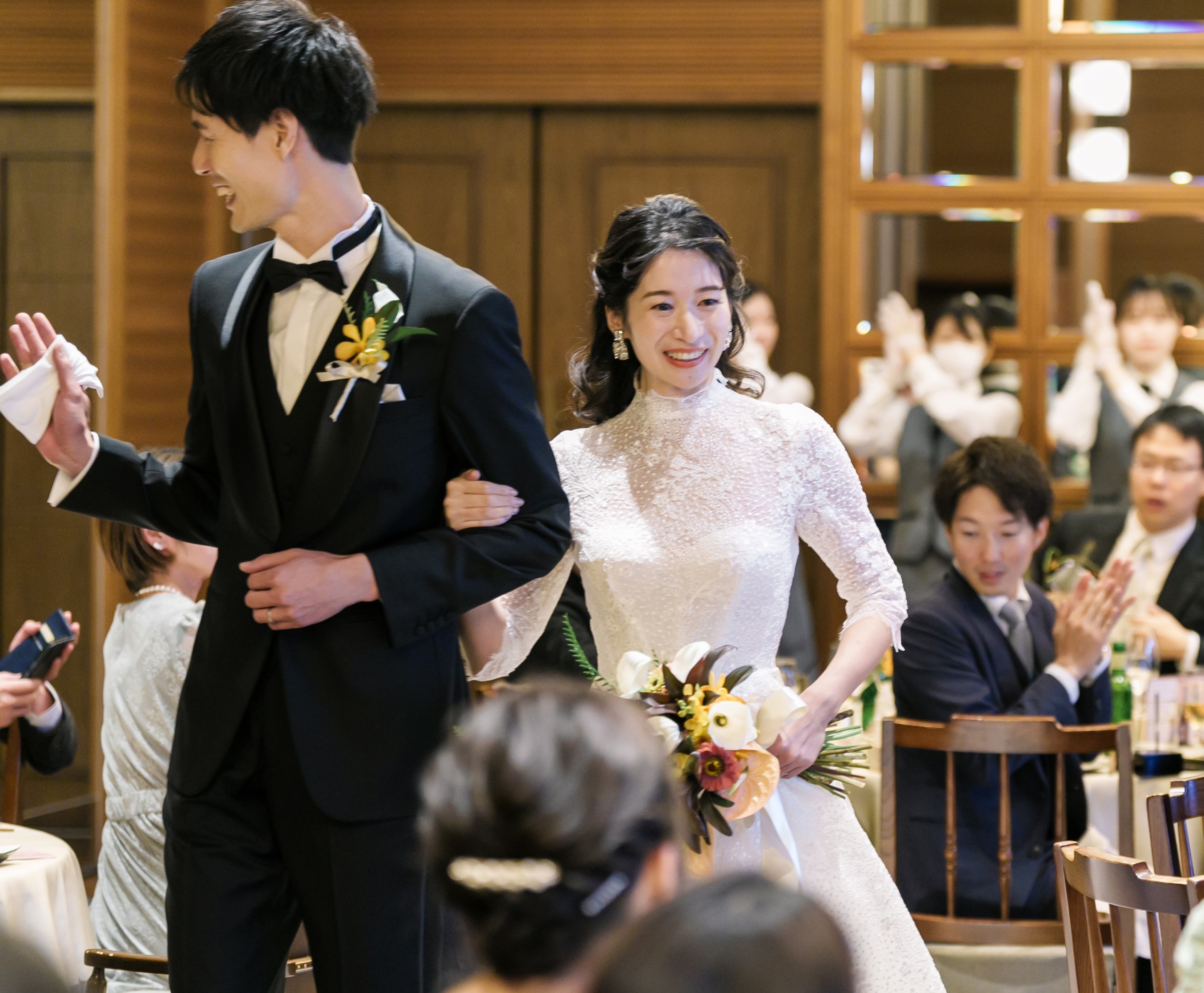 あたたかな歓談もお色直しの時間に移り変わり、お色直しからはウェディングドレスとタキシードをお召しになられ、がらっと雰囲気を変えて楽しまれました。ご新婦様は世界中の花嫁からも愛され続けているニューヨークのブランド、Reem Acra(リーム アクラ)のウェディングドレスを選ばれました。”Hollywood Collection”というコレクションテーマから発表されたこちらのウェディングドレス。女性なら誰しもが憧れた、古くから愛されるハリウッド映画のロマンティックなシーンやラブストーリーからインスピレーションを受け、Reem Acra(リーム アクラ)から花嫁への愛に溢れたコレクションでした。ショートスリーブにハイネックというクラシカルなデザインの中にリーム アクラでしか生み出せないロマンティックで上質なインド刺繍が、優美で笑顔が愛らしいご新婦様にぴったりです。またお身体の曲線美に沿うAラインはご新婦様のスタイルの良さを存分に引き立て、透明度の高いインド刺繍は肌の白いご新婦様により一層の透明感をもたらします。こちらのドレスには、シルバーにゴールドがプラスされたエレガントなスクエア形イヤリングを合わせた高貴さが漂うコーディネートに。きっと、その姿にゲストの皆様も魅了されたことでしょう。そんなご新婦様の隣に立つご新郎様はオーセンティックなブラックのオーダータキシードをお召しになられました。オーダーされたタキシードは男性の嗜みとして本質にこだわっていただきながらも、高身長なご新郎様のお身体にぴったりとフィットしパーティシーンでも負荷が掛からず、和やかな雰囲気に包まれながらリラックスして過ごされました。