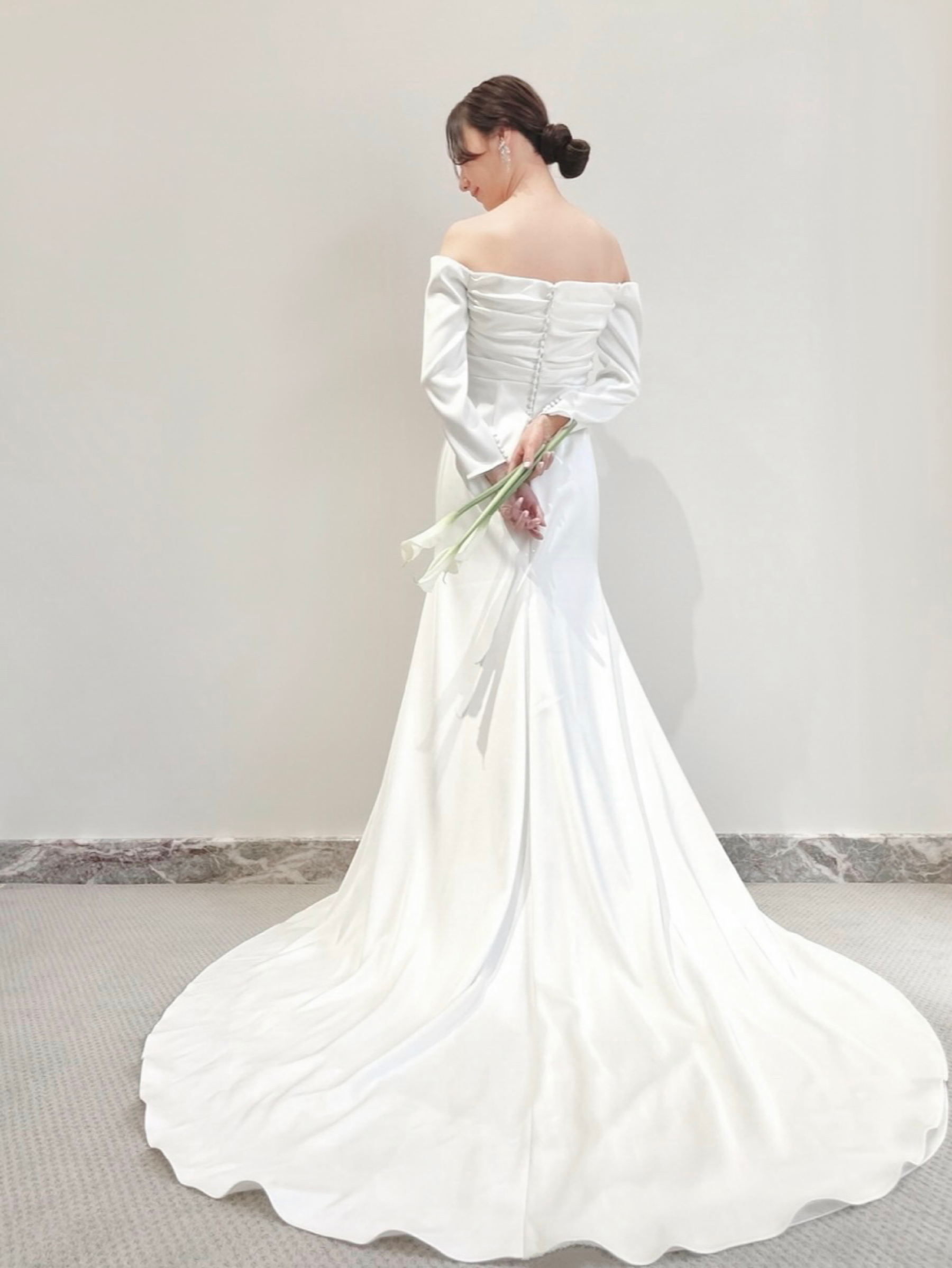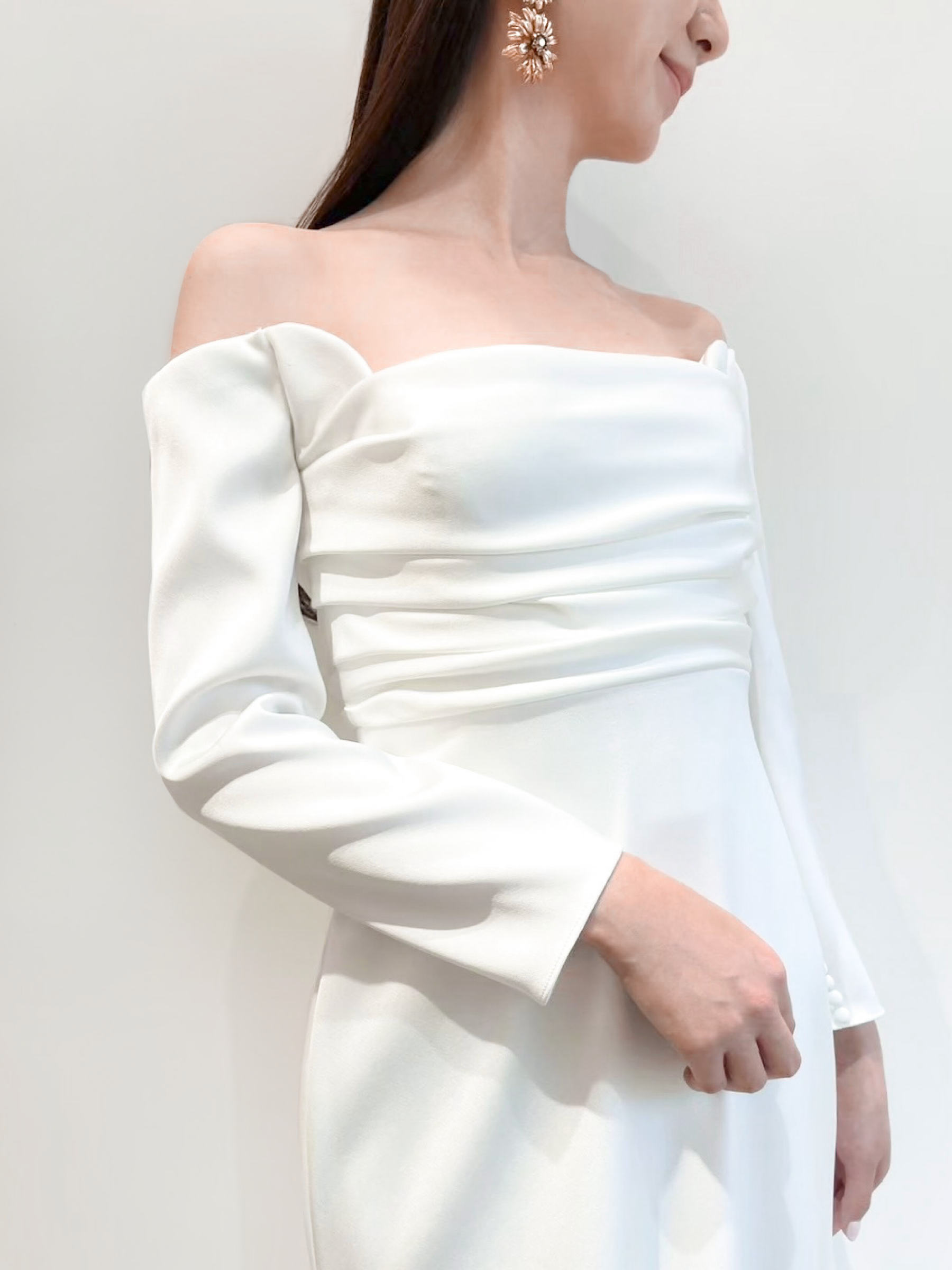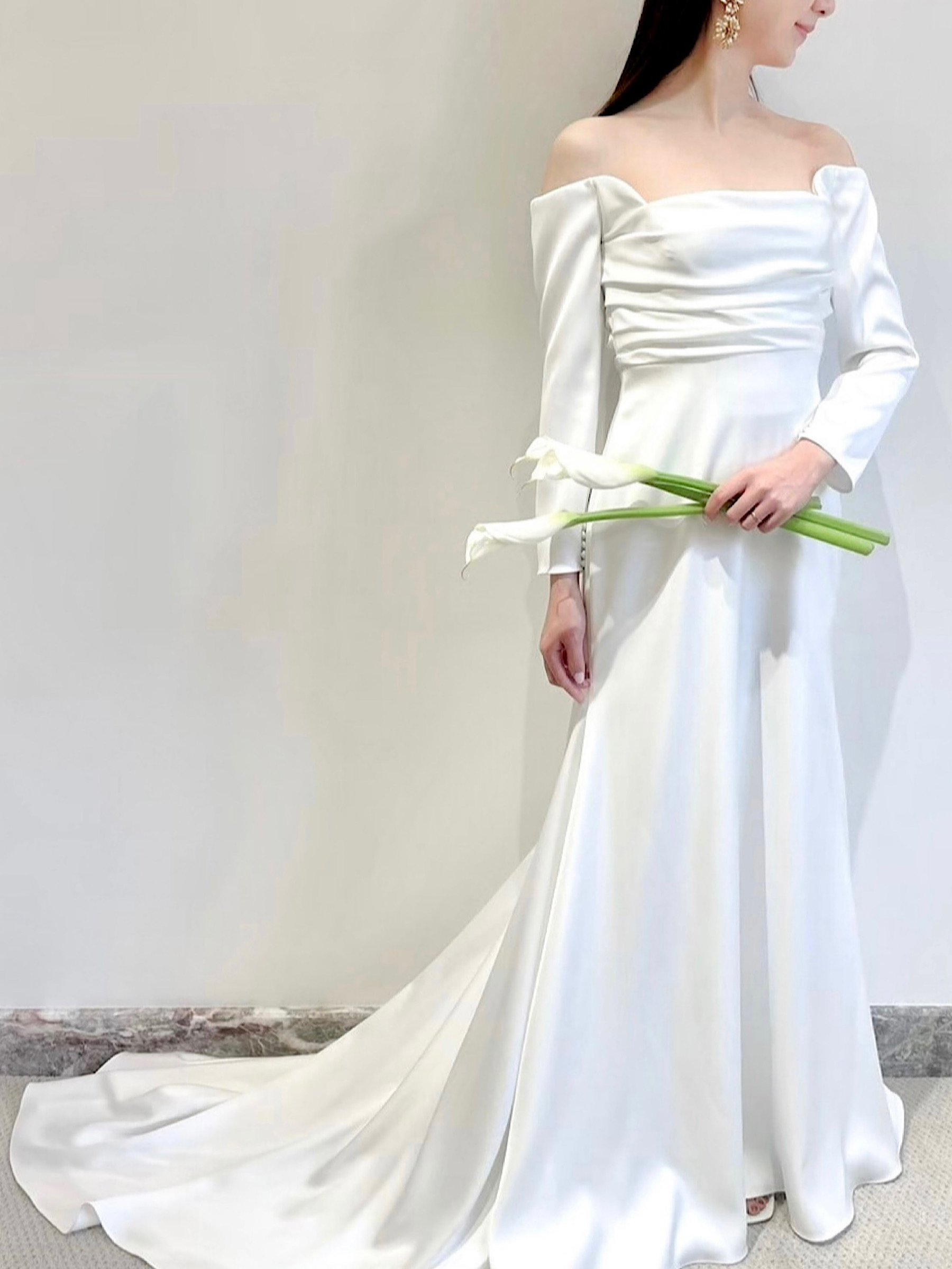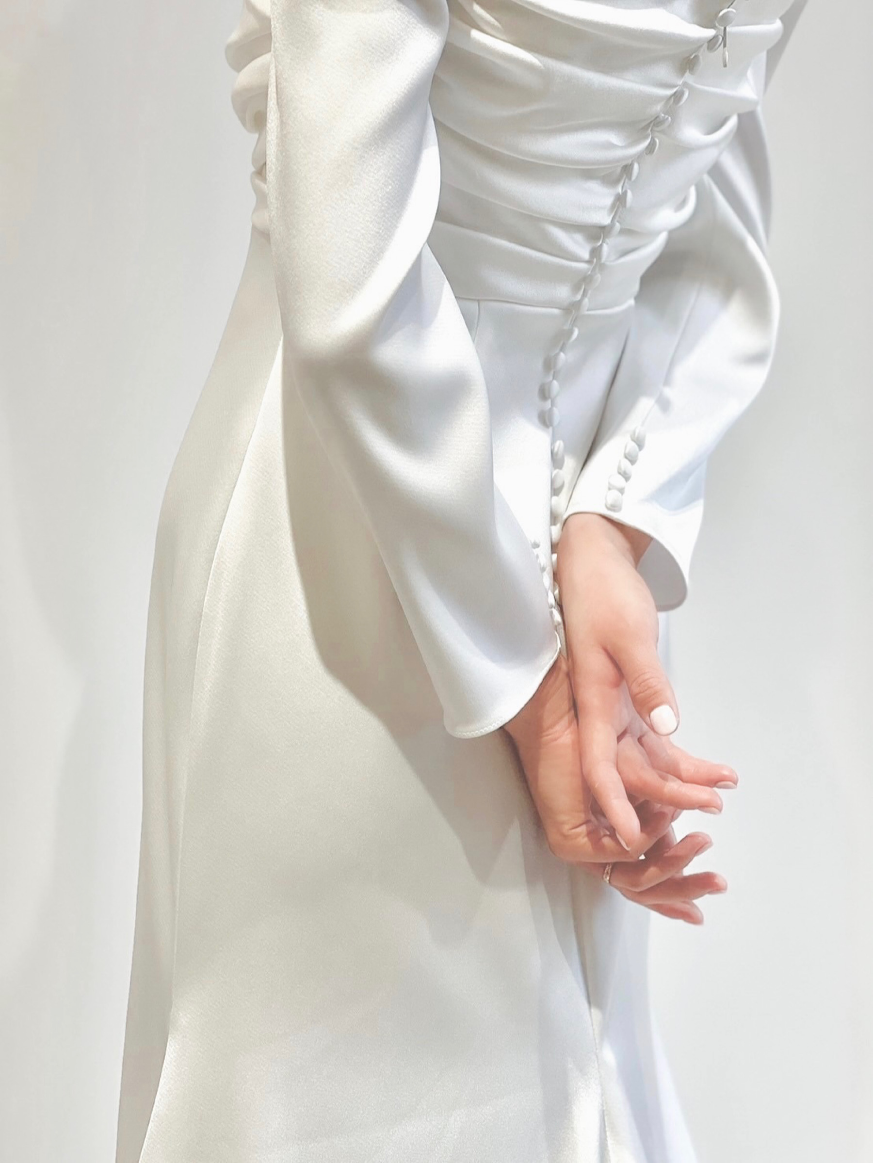 今回の新作ウェディングドレスは、ミニマルなシルエットのスレンダーライン✖ロングスリーブのレラ ローズらしい一着。ドレープが描くすっきりとした美しいスレンダーラインのシルエットは、花嫁のしなやかさを演出します。裾に向かって贅沢に広がる上質なサテンクレープは、自然光を纏うことでなめらかで艶のある光沢を生み出します。なびくように広がるトレーンは、チャペルに佇む花嫁のうしろ姿を華やかに演出し、気品に溢れたオーラを放つことでしょう。バックスタイルとロングスリーブの袖口に施された幸せの象徴とも言われるくるみボタンは、レラ ローズのシグネチャーとも言えるもの。背中からヒップにかけては大胆にあしらうことで優美な印象を。袖元にはあえて内側にさりげなくあしらうことで、花嫁の仕草を愛らしく魅せてくれるかのよう。上半身にはハンドプリーツが入ることであたたかみがプラスされ、決してシンプルにはなりすぎず、程よいファッション性が生まれるのです。クラシックな装いの象徴でもあるロングスリーブとデコルテ周りのダイナミックなカッティングは、結婚式ならではの特別感と女性らしい気品溢れる雰囲気のどちらをも叶えていただけます。