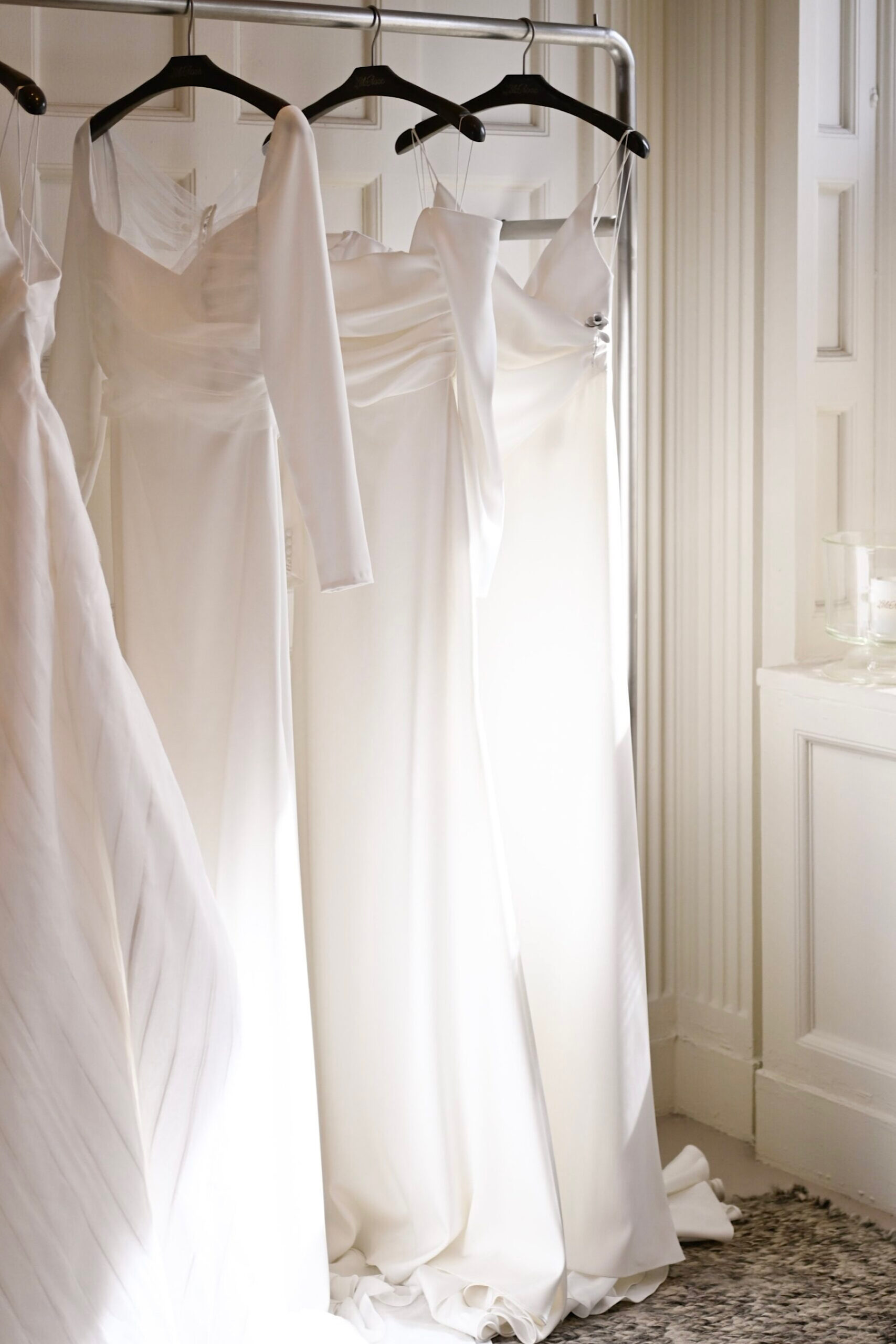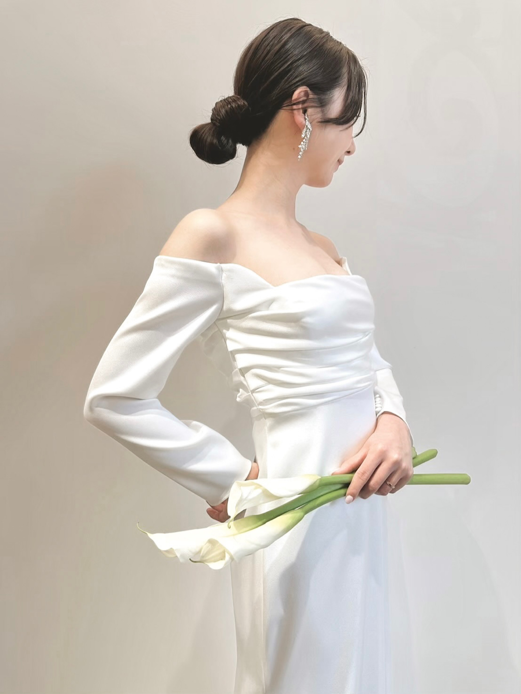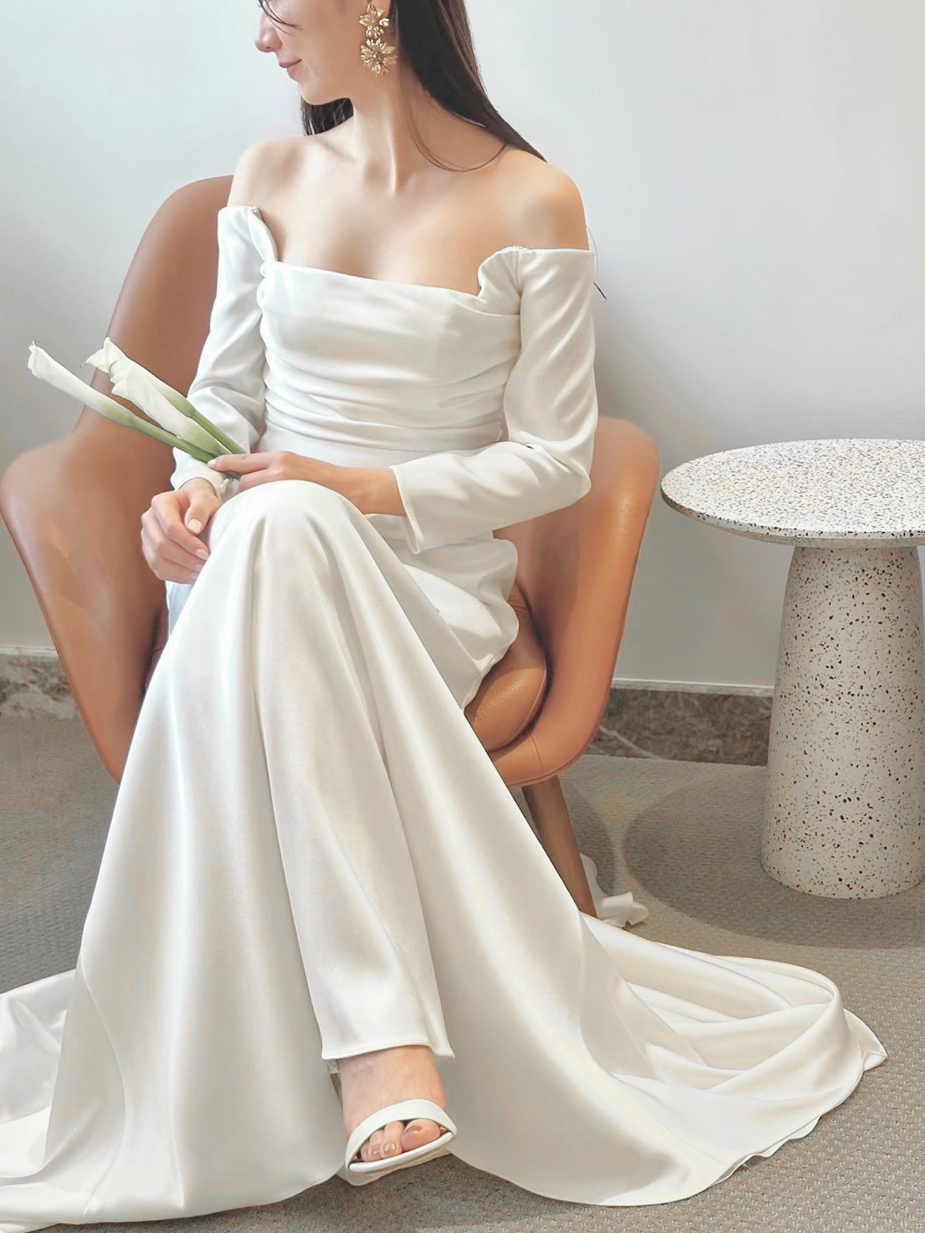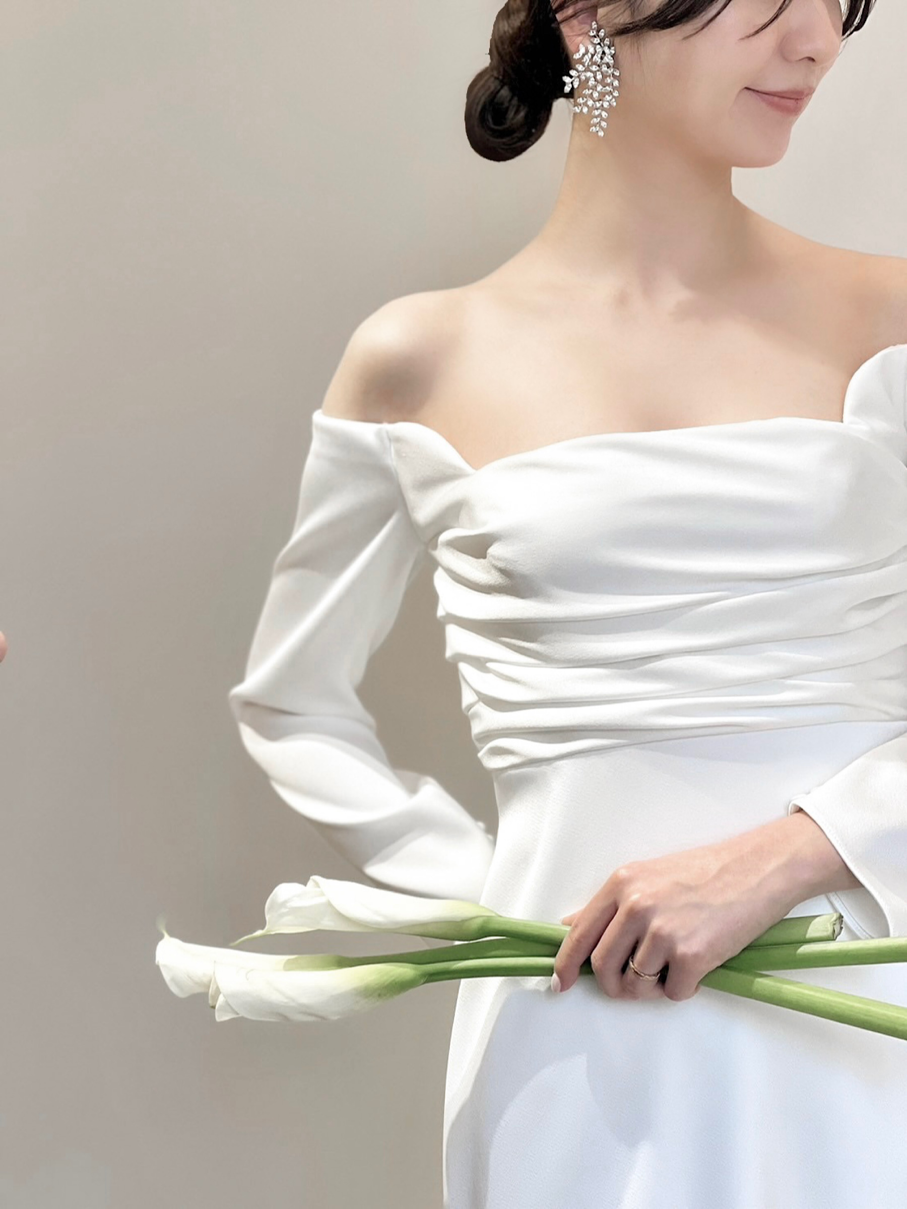 今回の新作ウェディングドレスは、ミニマルなシルエットのスレンダーライン✖ロングスリーブのレラ ローズらしい一着。ドレープが描くすっきりとした美しいスレンダーラインのシルエットは、花嫁のしなやかさを演出します。裾に向かって贅沢に広がる上質なサテンクレープは、自然光を纏うことでなめらかで艶のある光沢を生み出します。なびくように広がるトレーンは、チャペルに佇む花嫁のうしろ姿を華やかに演出し、気品に溢れたオーラを放つことでしょう。バックスタイルとロングスリーブの袖口に施された幸せの象徴とも言われるくるみボタンは、レラ ローズのシグネチャーとも言えるもの。背中からヒップにかけては大胆にあしらうことで優美な印象を。袖元にはあえて内側にさりげなくあしらうことで、花嫁の仕草を愛らしく魅せてくれるかのよう。上半身にはハンドプリーツが入ることであたたかみがプラスされ、決してシンプルにはなりすぎず、程よいファッション性が生まれるのです。クラシックな装いの象徴でもあるロングスリーブとデコルテ周りのダイナミックなカッティングは、結婚式ならではの特別感と女性らしい気品溢れる雰囲気のどちらをも叶えていただけます。