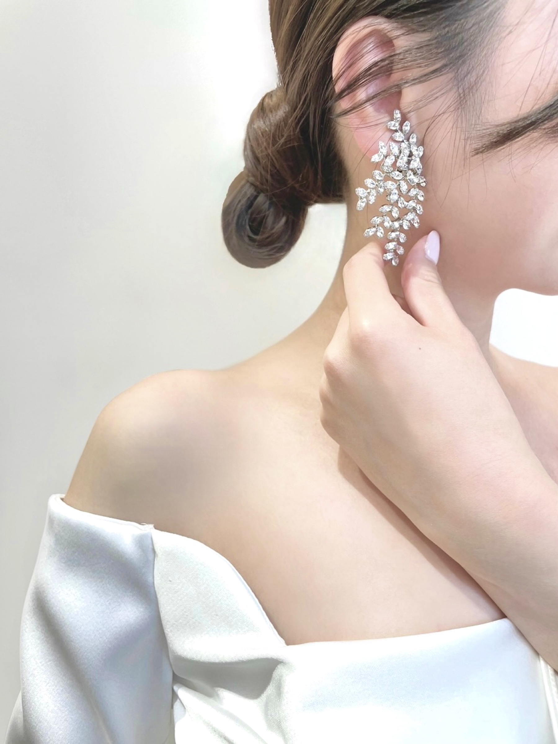 特別な一日を過ごすためにセレクトするものは、衣裳だけではありません。ウェディングドレスがクリーンで都会的なデザインであれば、それに合わせるアクセサリーやブーケ、シューズ選びももっとあなたらしく楽しんでいただけるはず。挙式はタイトなアップのヘアスタイルにシルバーのスワロフスキーが贅沢なJennifer Behr(ジェニファー ベア)のイヤリングを合わせて、洗練されたクールな印象に。パーティーシーンではゲストの皆様とリラックスしていただけるように、ルーズなダウンスタイルにアンティーク調のOscar de la Renta(オスカー デ ラ レンタ)のゴールドイヤリングを合わせて。挙式とはまるで違う披露宴入場の姿に、ゲストの皆様もきっと驚き喜ばれるはず。こだわりを持って選んだウェディングドレスには、足元のシューズにまで妥協のないトータルコーディネートをしていただきたいのです。フランス産の上質なレースを使用したポインテッドトゥのデザインのシューズは、女性らしさや華やかさの中にも抜け感とアクセントをプラスしてくれます。春や夏の結婚式であれば、あえてサンダルのデザインでリラックス感と同時に感度の高いスタイリングもおすすめです。今回ご紹介しているブライダルシューズHAAVE(ハーヴェ)は「夢」から名付けられており、どんな花嫁の夢も、なりたいお姿もすべて叶えたいという想いが込められてます。お二人が誓いを交わす神聖なバージンロード。その一歩を歩み出すシューズは、花嫁に自信をもたらしてくれるものであってほしいのです。―素敵な靴は、あなたを素敵な場所へと連れて行ってくれる―というフランスの言い伝えのように、結婚式から始まり歩んで行く未来、花嫁を幸せな場所へと導いてくれる特別な一足となることでしょう。