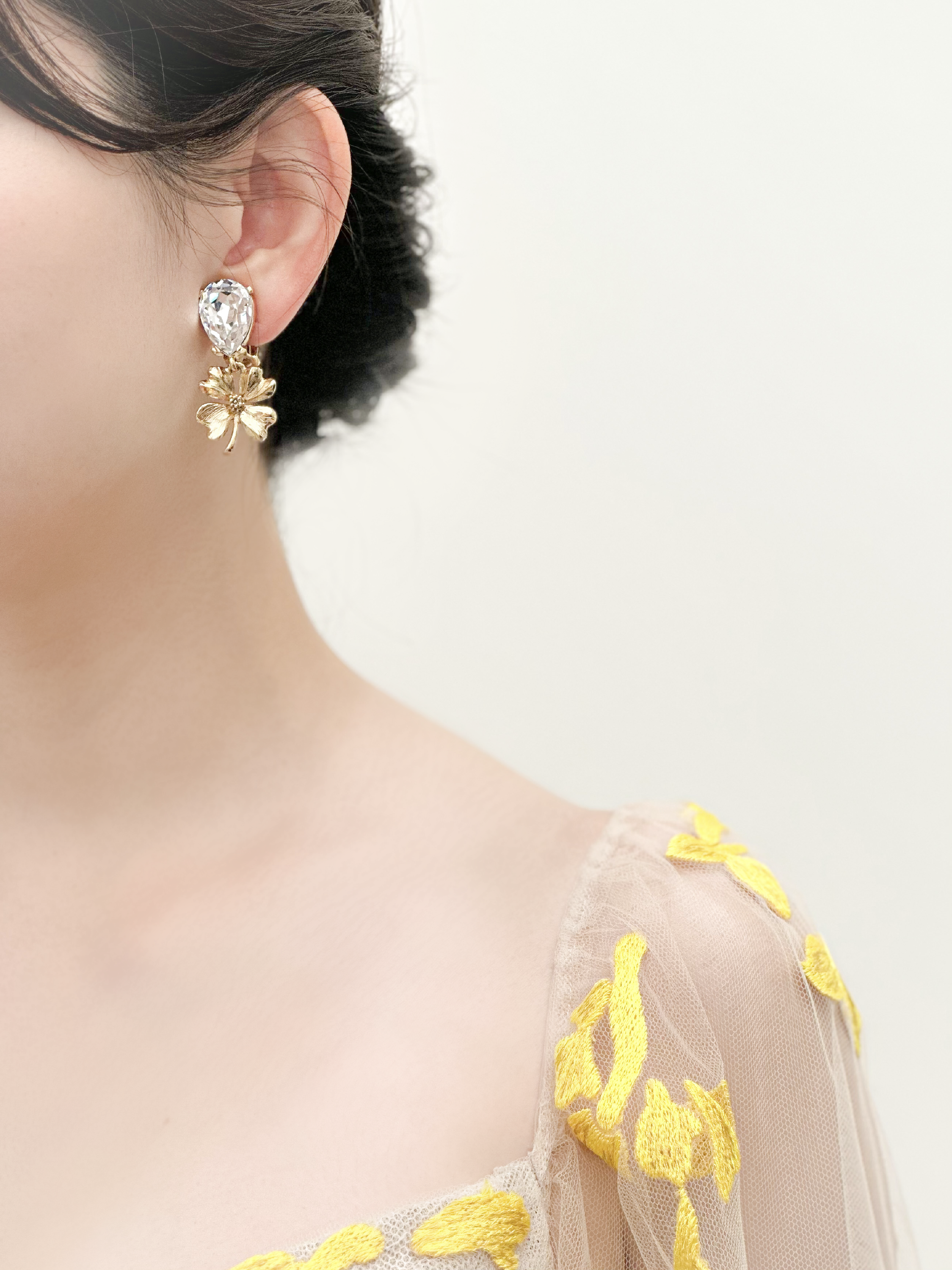 大粒のクリスタルがお顔を明るく照らし、幸運をもたらすクローバーのモチーフは花嫁のお守り代わりになることでしょう。