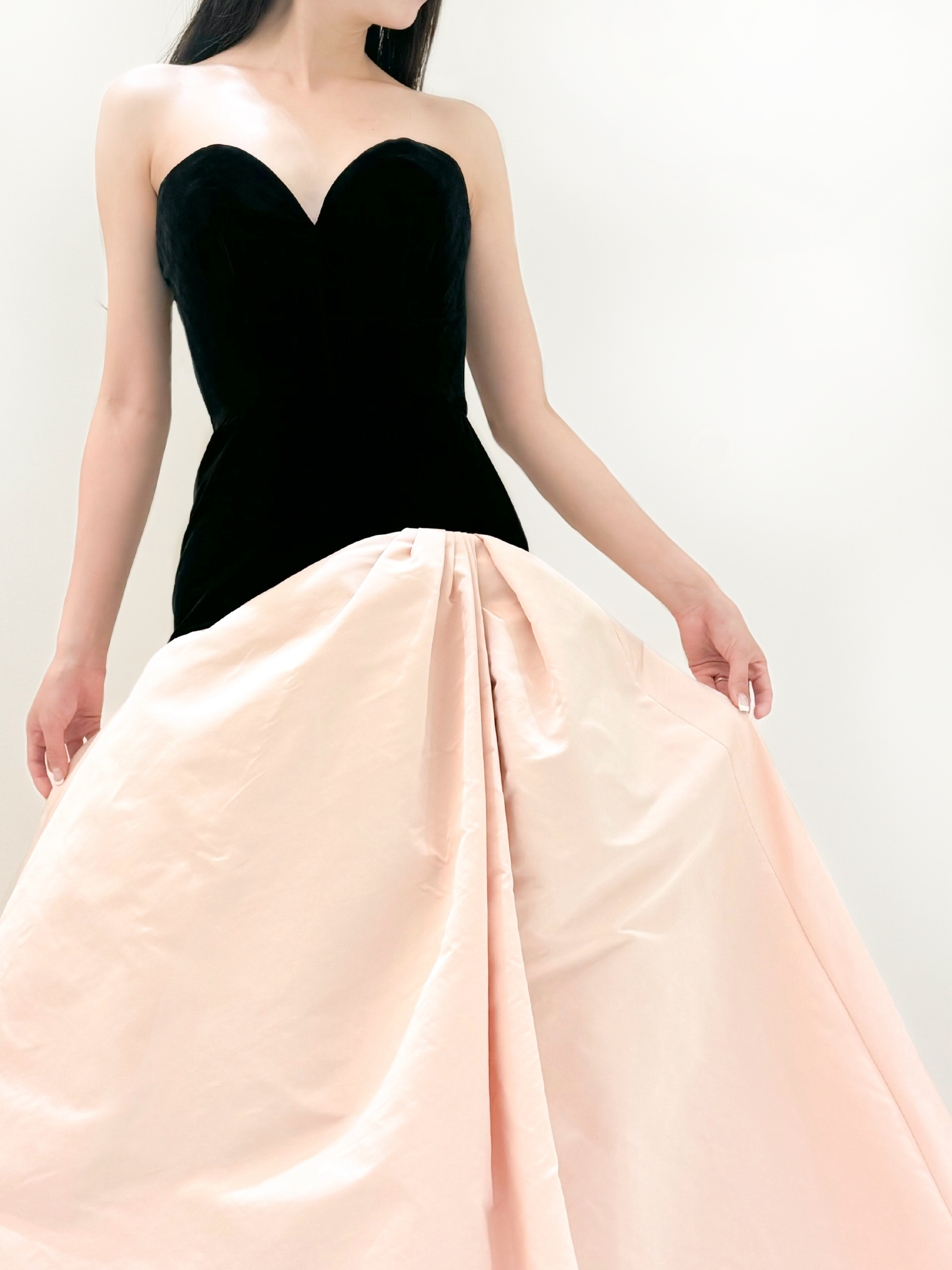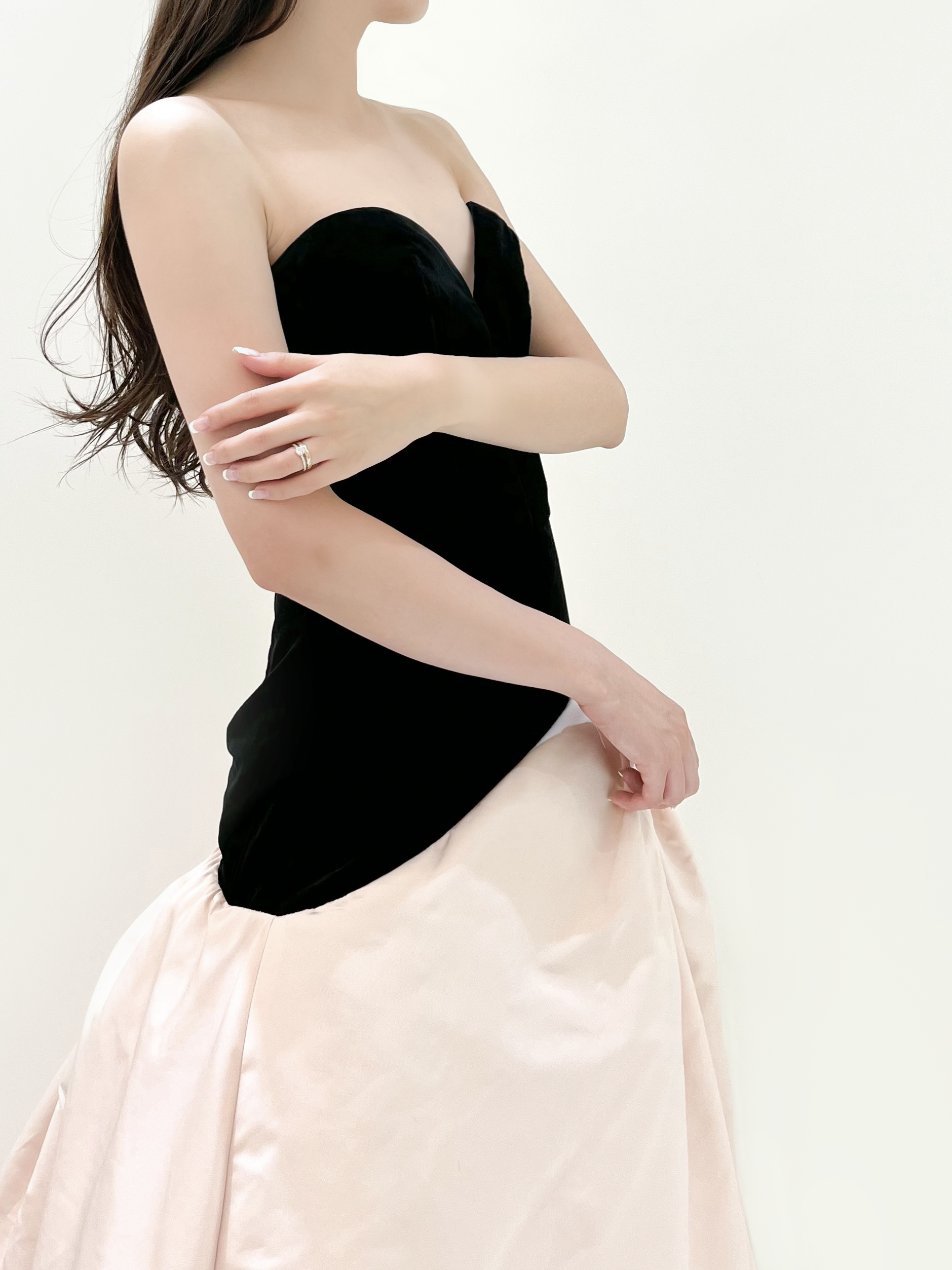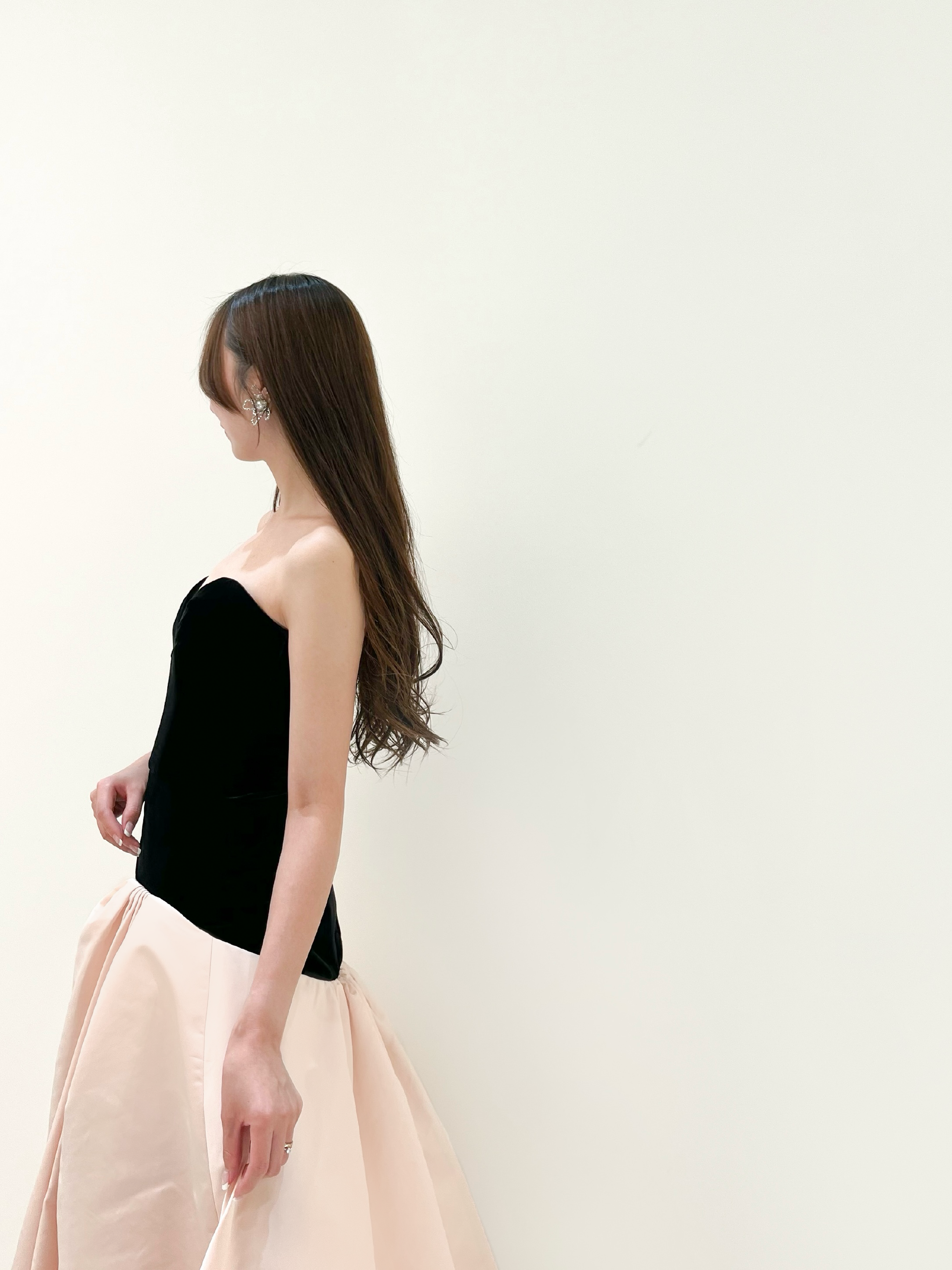ブラックのビスチェ部分はレディ トゥ ウェアらしく、遊び心のあるベルベッド素材でファッショナブルに。