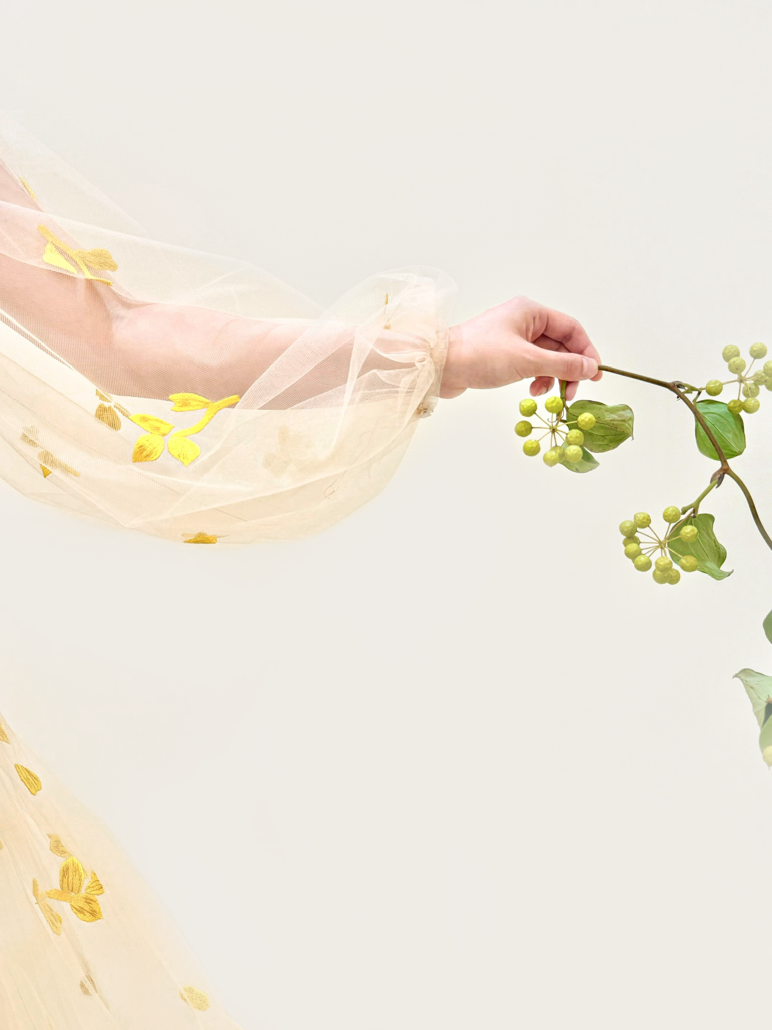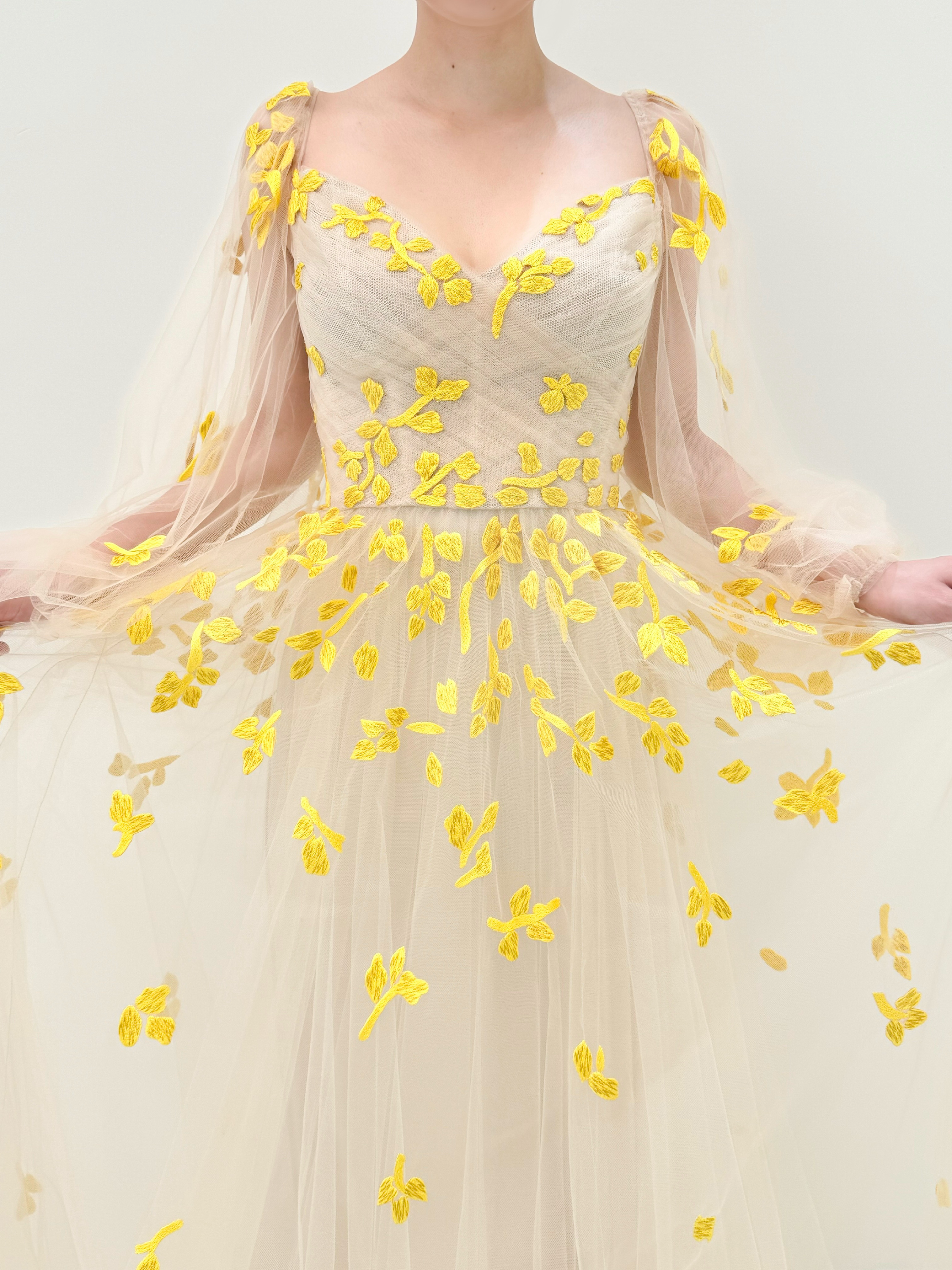 空気をたっぷりと含んだソフトチュールにフレッシュなイエローのフラワー刺繍が施されたカラードレスは、花嫁を可憐な姿へと導きます。