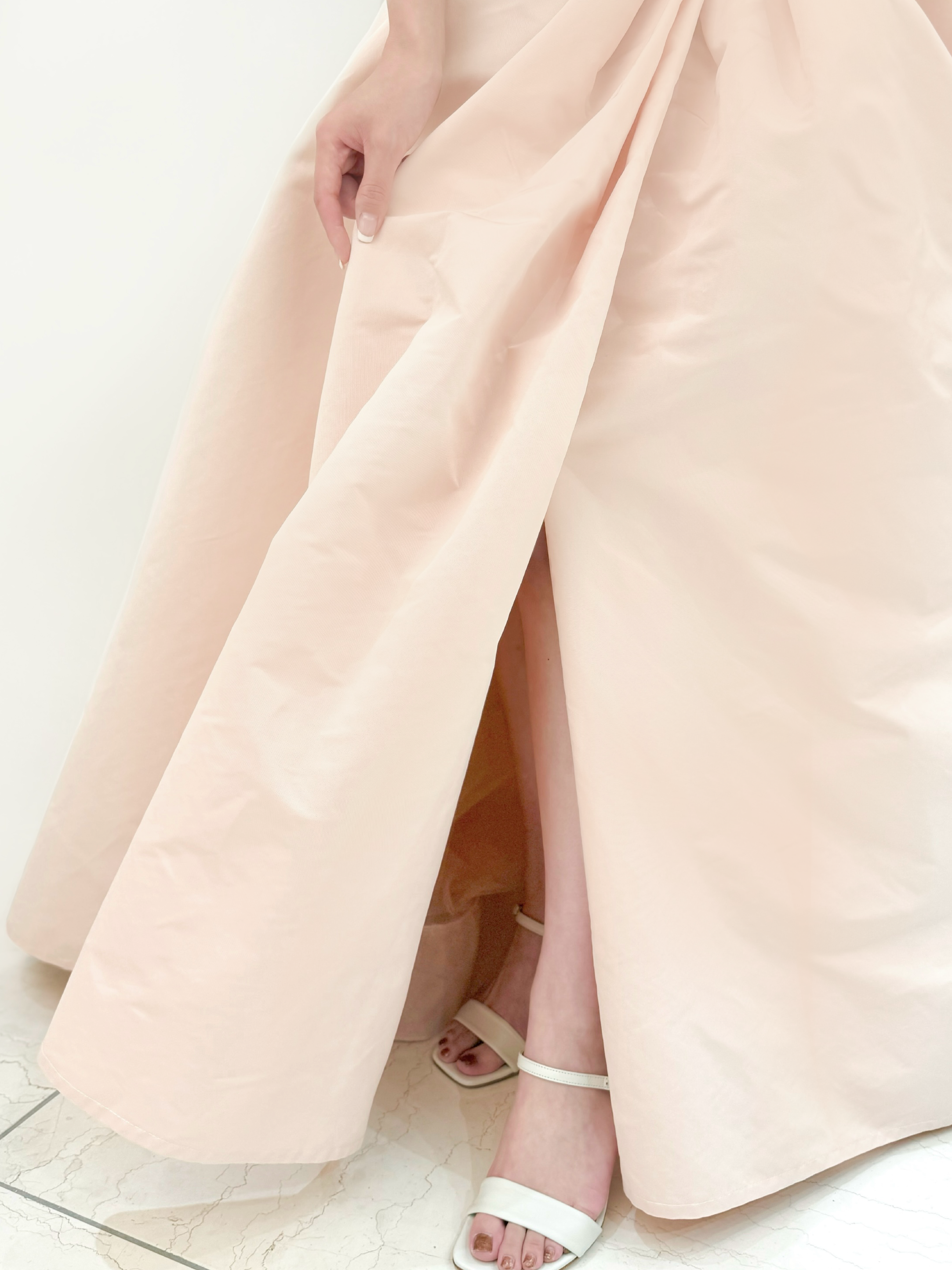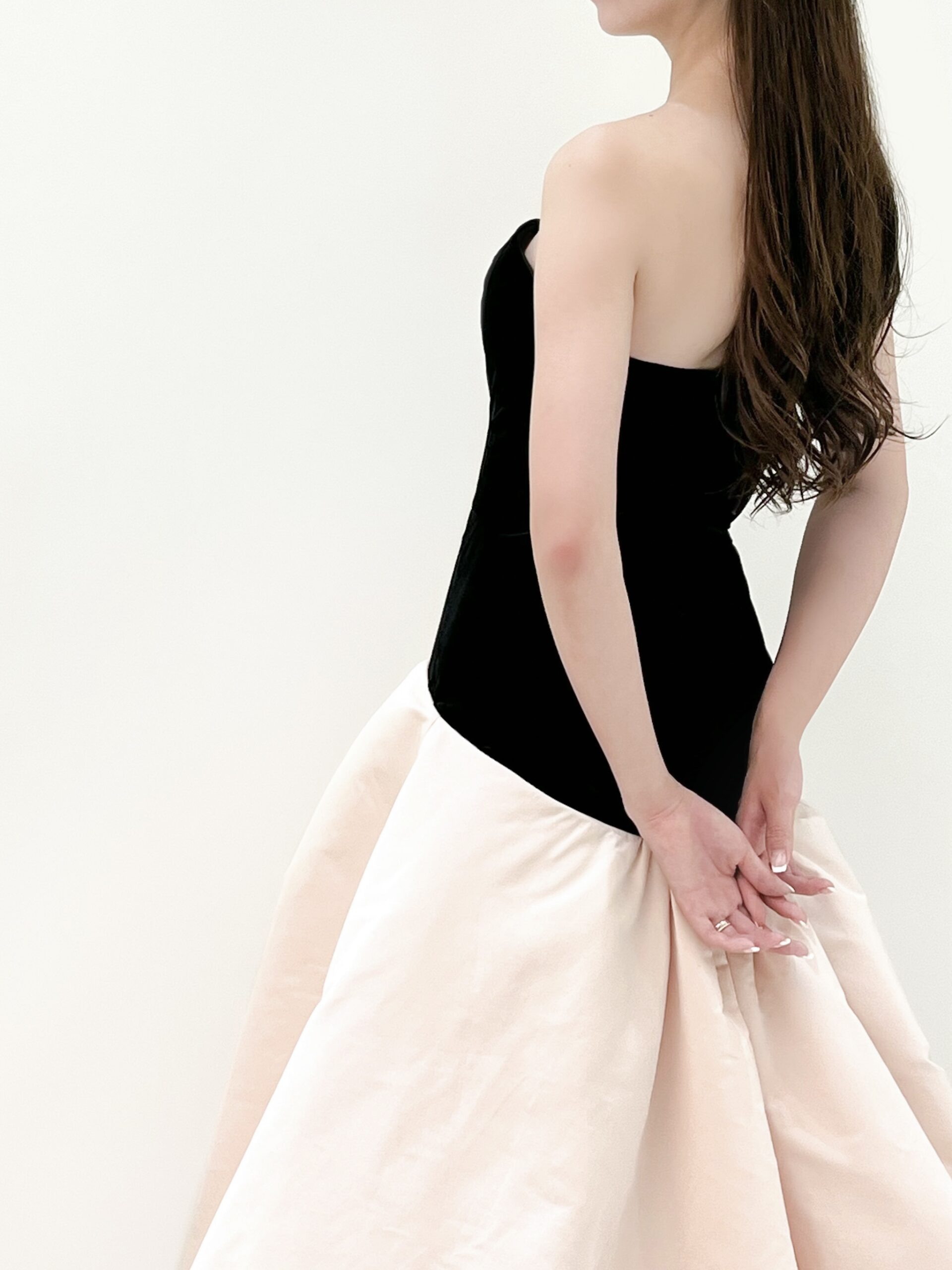 そんなワードが似合うブラック×ペールピンクのバイカラーがロマンティックなこちらのカラードレスも、モニーク ルイリエのもの。
