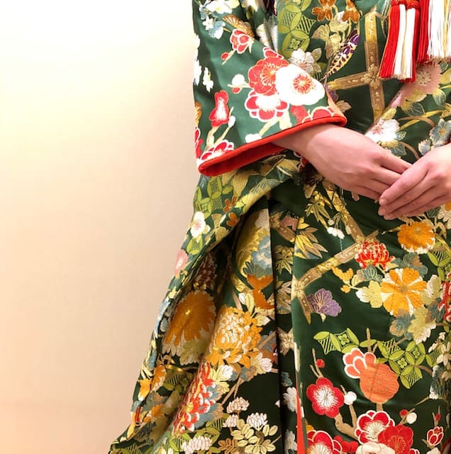 色打掛全体には、四季折々の草花やお式にふさわしい縁起の良い文様が施されております。