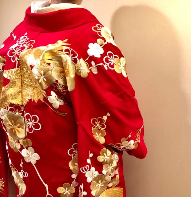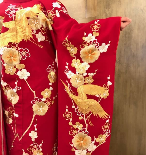 豪華に鶴が舞い、古典的でありながらも梅花のお刺繍が、上品で愛らしい印象に・・・。