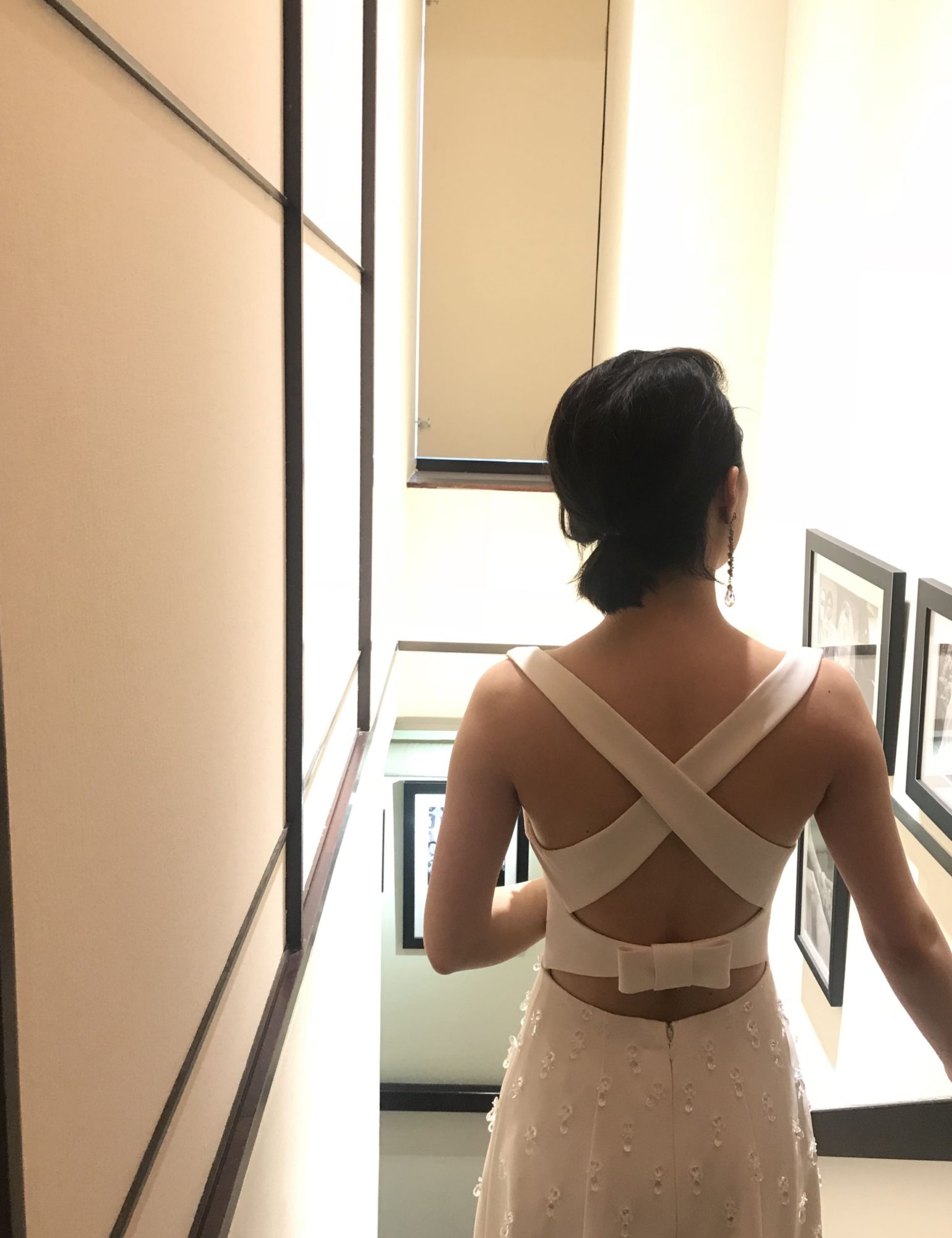 フロントデザインとは対照的な、大胆にカッティングされたバックデザイン・・・。