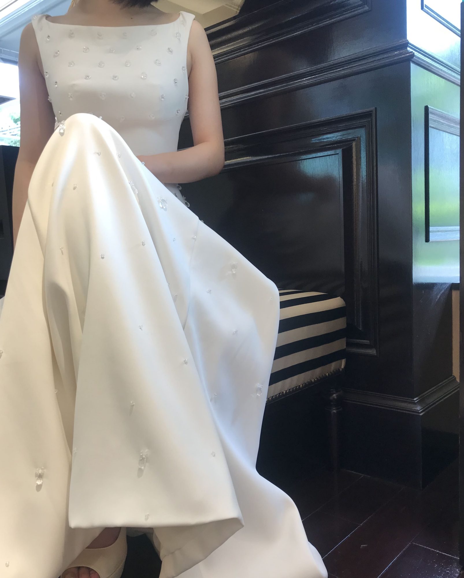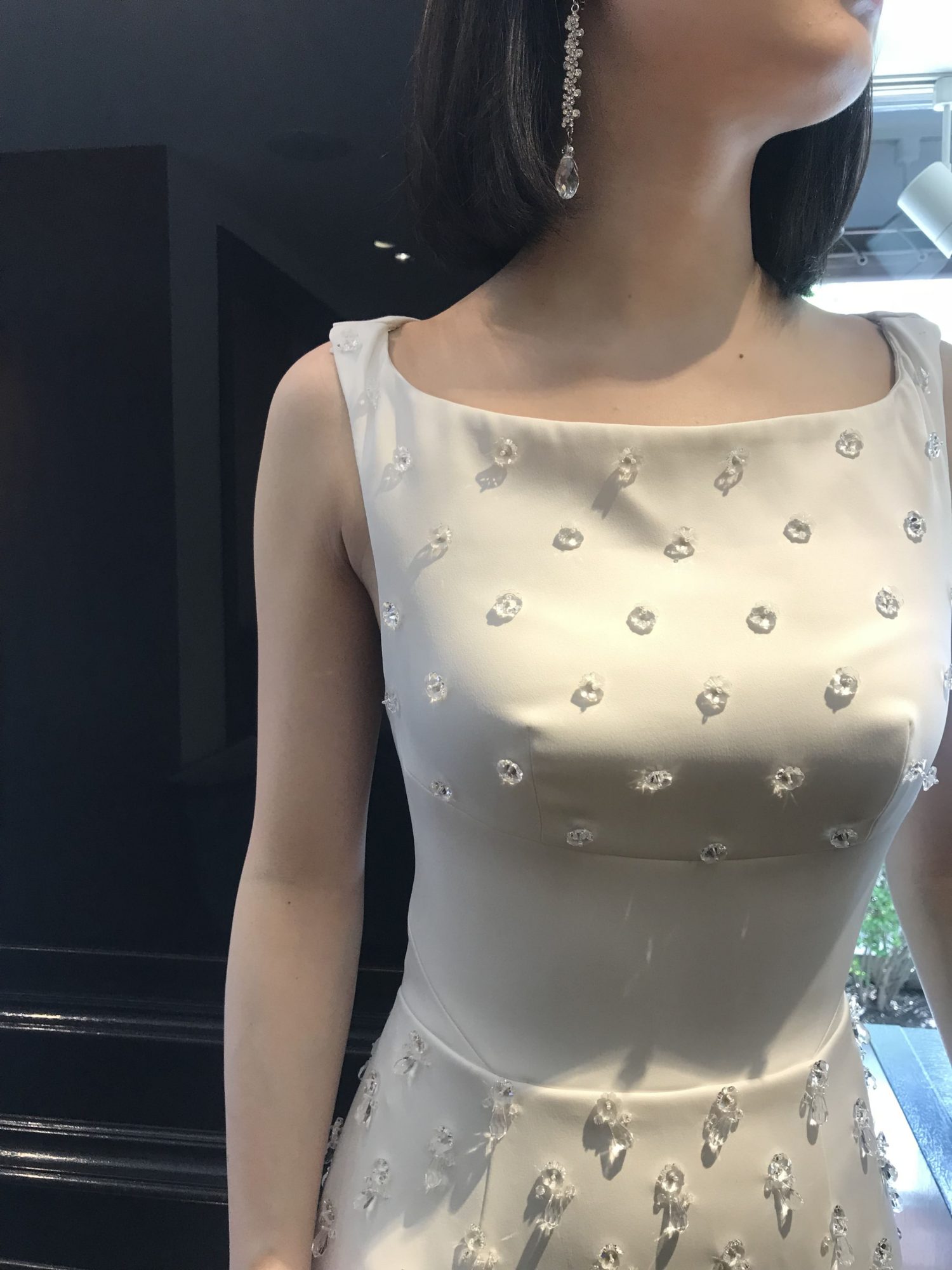 上品なバトーネックに散りばめられたクリアなビジュー。