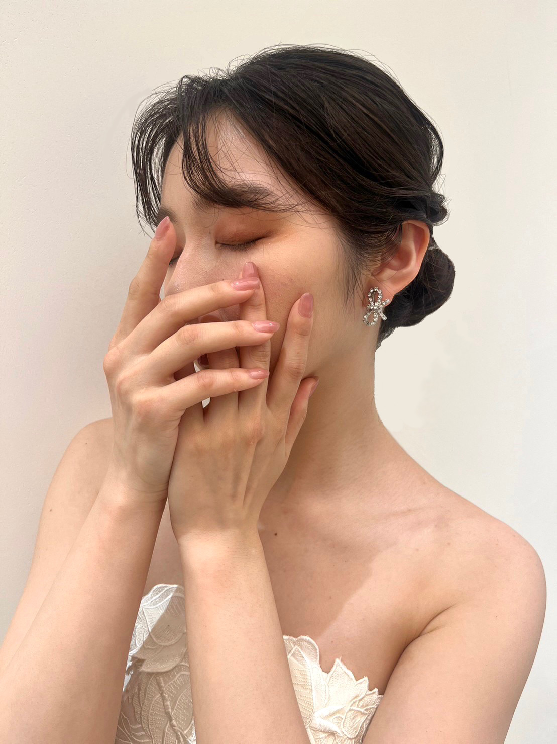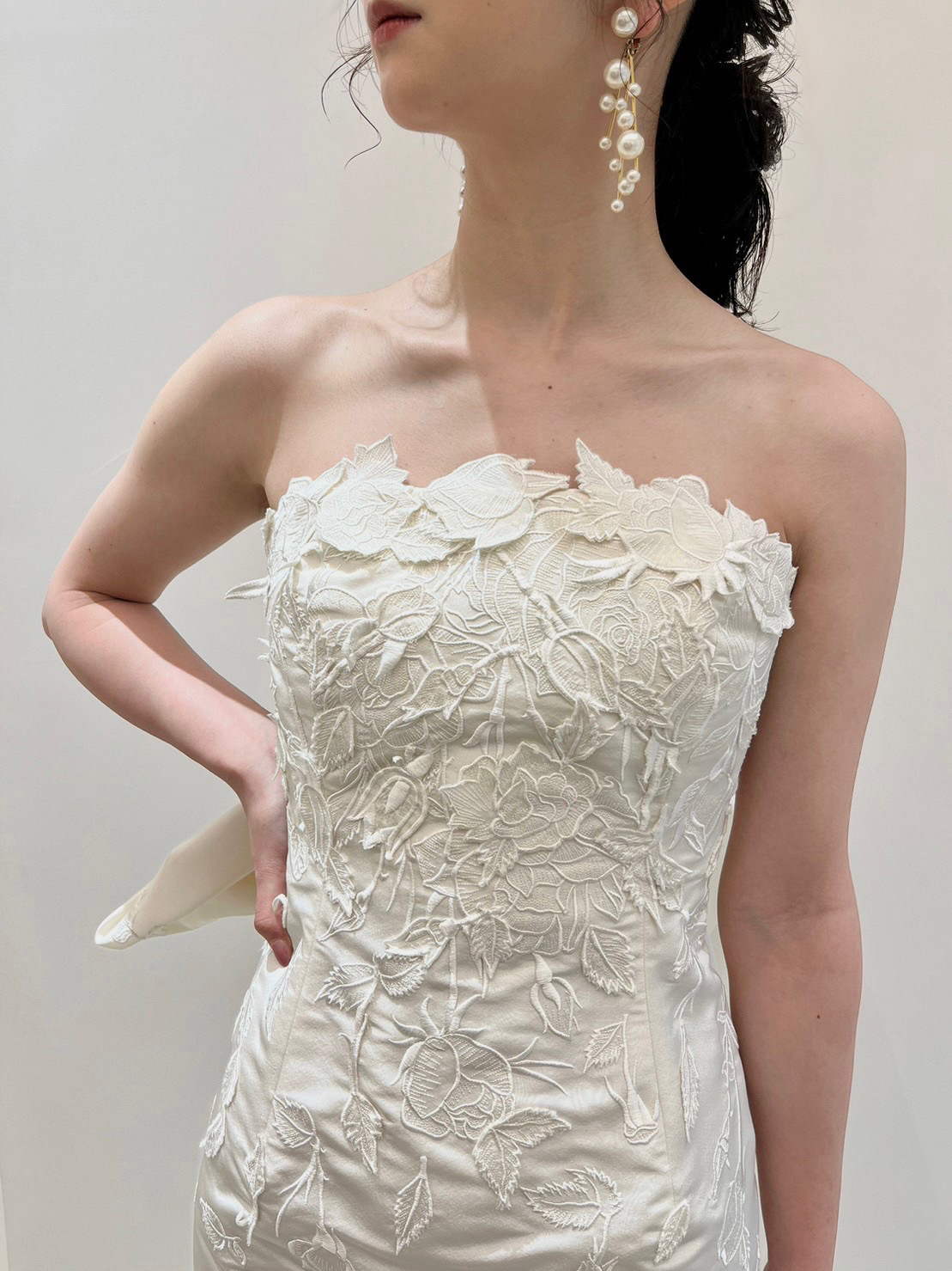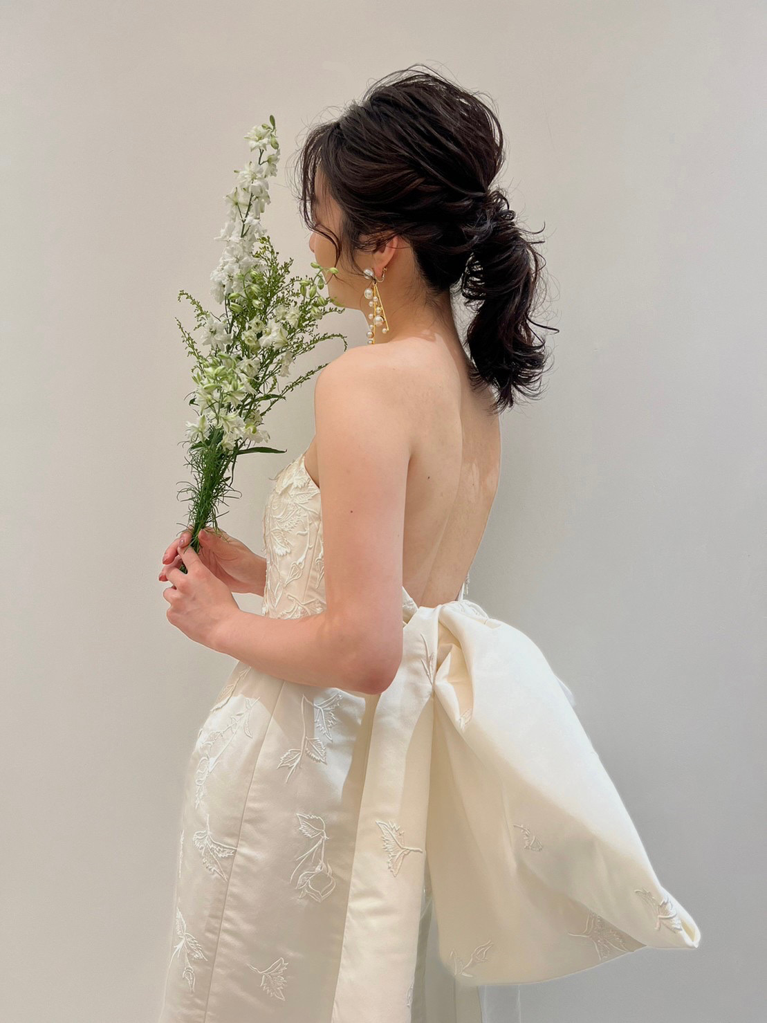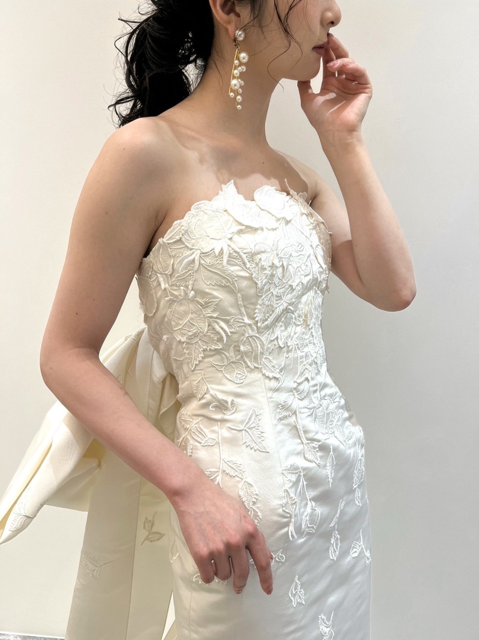 気品漂う存在感あるドレスだからこそ、挙式スタイルは髪型をタイトにまとめ凛としたスタイリングに。イヤリングはコンパクトなデザインで愛らしいリボンモチーフのイヤリングを合わせてほんの少しアクセントを。お二人の愛の誓いを立てる神聖な時間には、シンプルにまとめたスタイリングでより洗練された雰囲気でお過ごしいただくのがおすすめです。披露宴からはふんわりとルーズにまとめたローポニーテールに大振りで華やかなパールのイヤリングを合わせることで、華やかさとリラックス感のあるコーディネートへスタイルチェンジ。ゲストとぐっと距離が近づくパーティーシーンには上品ながらも華やかさのあるアクセサリーをプラスしていただき、1着でも挙式とは大きく印象を変えて楽しんでいただくのも素敵です。