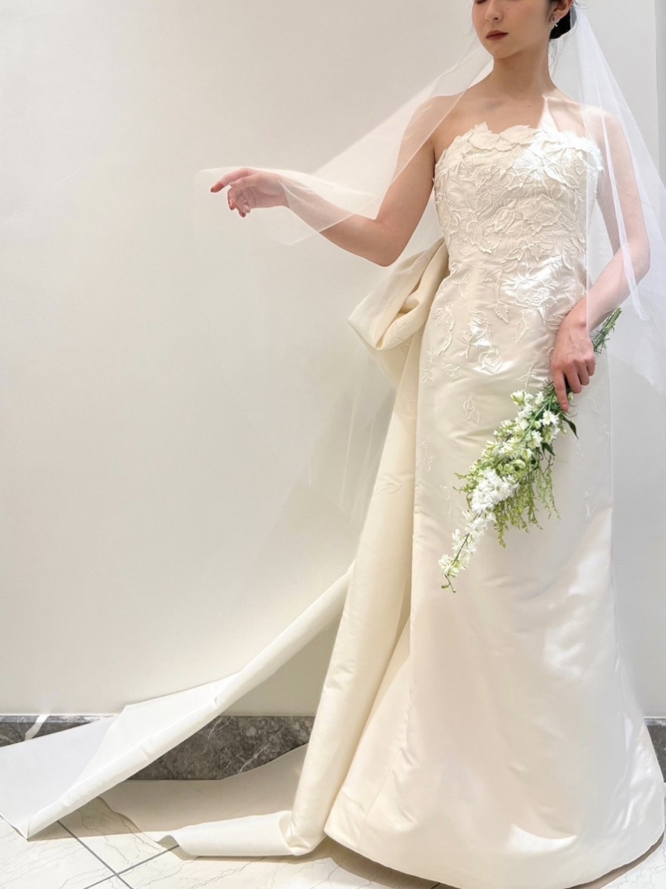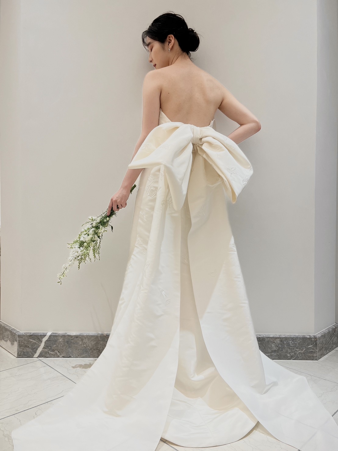 バックリボンの立体感が美しいマーメイドラインのウェディングドレス