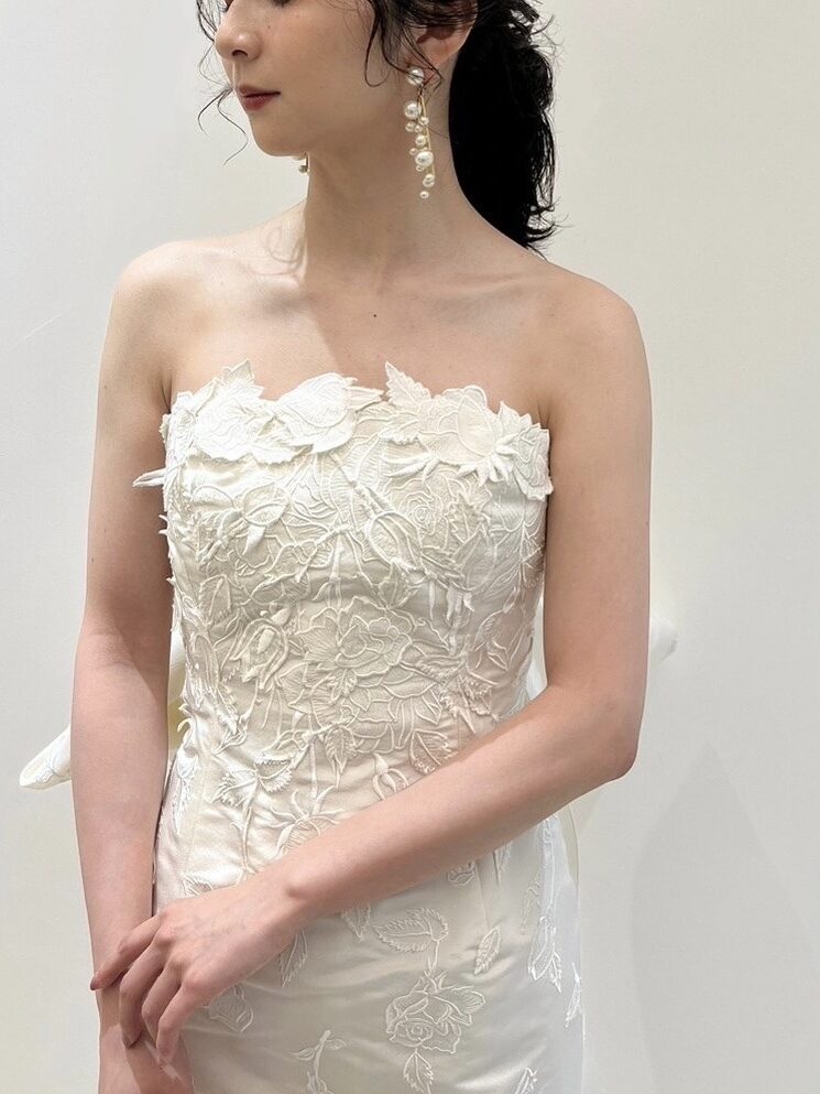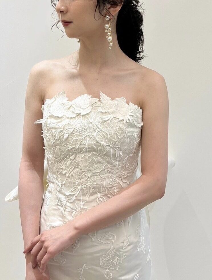 シンプルなフロントデザインから、トレンドでもあるバックリボンの立体感が美しいマーメイドラインのウェディングドレス。上質なシルクミカドを使用したマーメイドラインのドレスはシンプルで洗練されたフロントのシルエットからは全く想像がつかないほどバックコンシャスで大胆なバックスタイルのデザインは、チャペルでゆっくり歩みを進める中で異なる表情を見せ、ゲストもうっとりしてしまうほどの圧倒的な存在感と美しさを放ちます。ビスチェには立体的なカッティング刺繍が施され、スタイリッシュさの中にも花嫁のエレガントさを引き立たせることでしょう。常に女性を美しく感じさせることを信念に、極上の生地を使用し忠実にドレス作りを行ってきたオスカー デ ラ レンタ。長い歴史の中で紡られてきた職人技、完璧なまでのシルエットと美しい仕立て、刺繍や細かいディティールがあるからこそ、シンプルで上品な雰囲気の中にもスタイリッシュさとエレガントさを感じられます。洗練されたデザインの中にデザイナーのこだわりが贅沢に詰め込まれた一着は、ぜひ感度の高い神戸エリアの花嫁におすすめしたいドレスです。