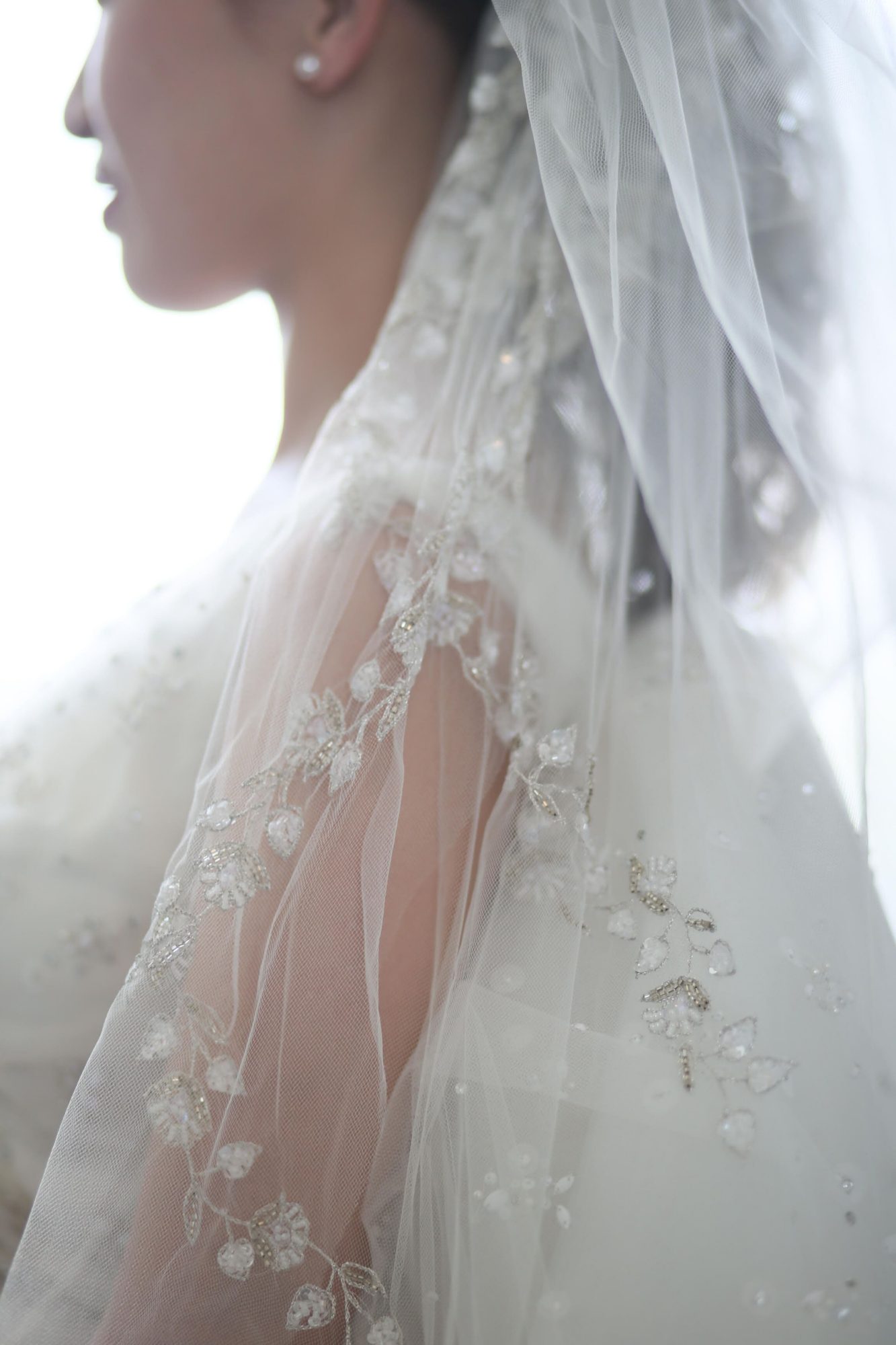 リーフを描いた繊細なビーディングが、贅沢にあしらわれた美しいロングベール。