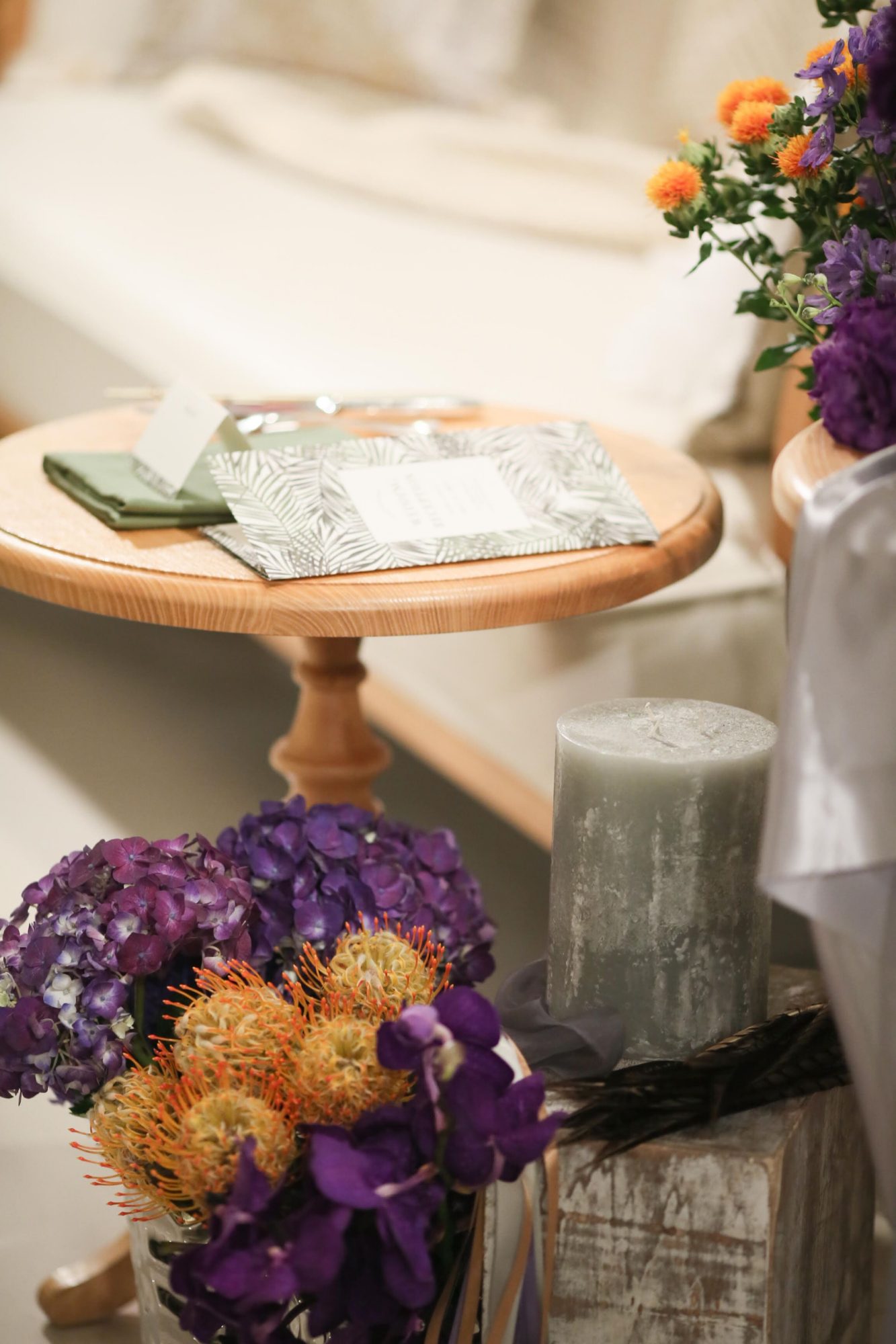 会場の装飾は、紫陽花を基調にPurple、Orange、Silverで統一されたシックな空間に。