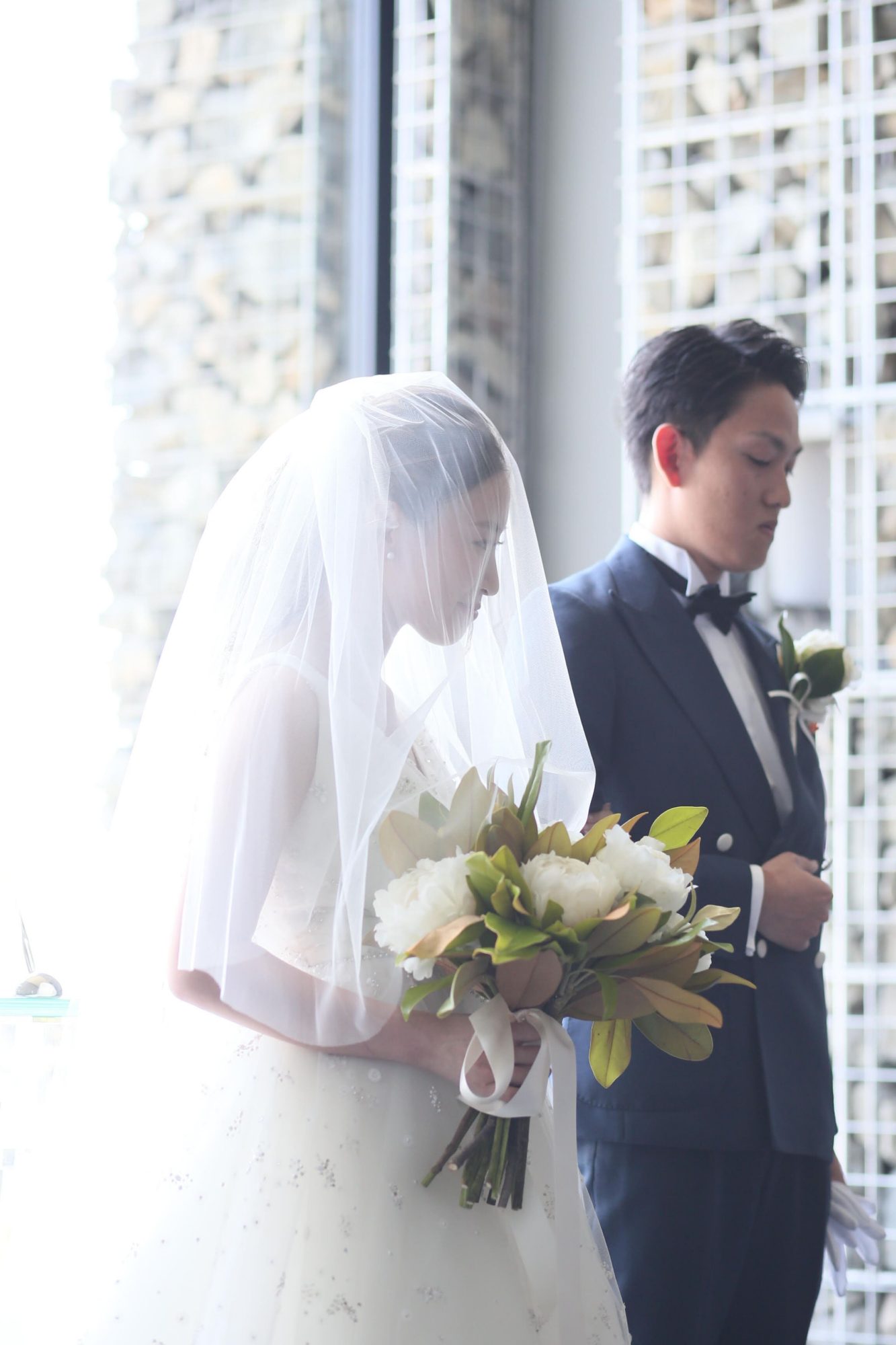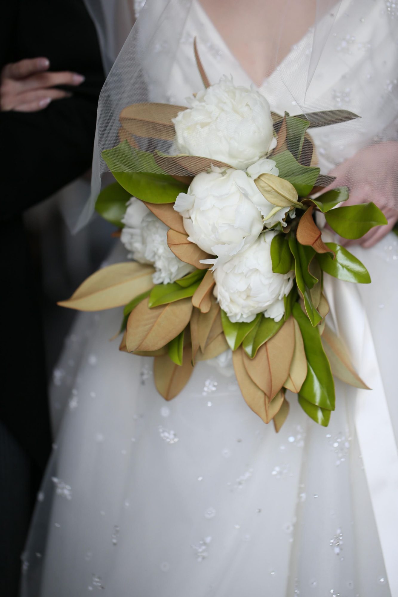 純白のウエディングドレスを彩る、真っ白な芍薬のブーケ。