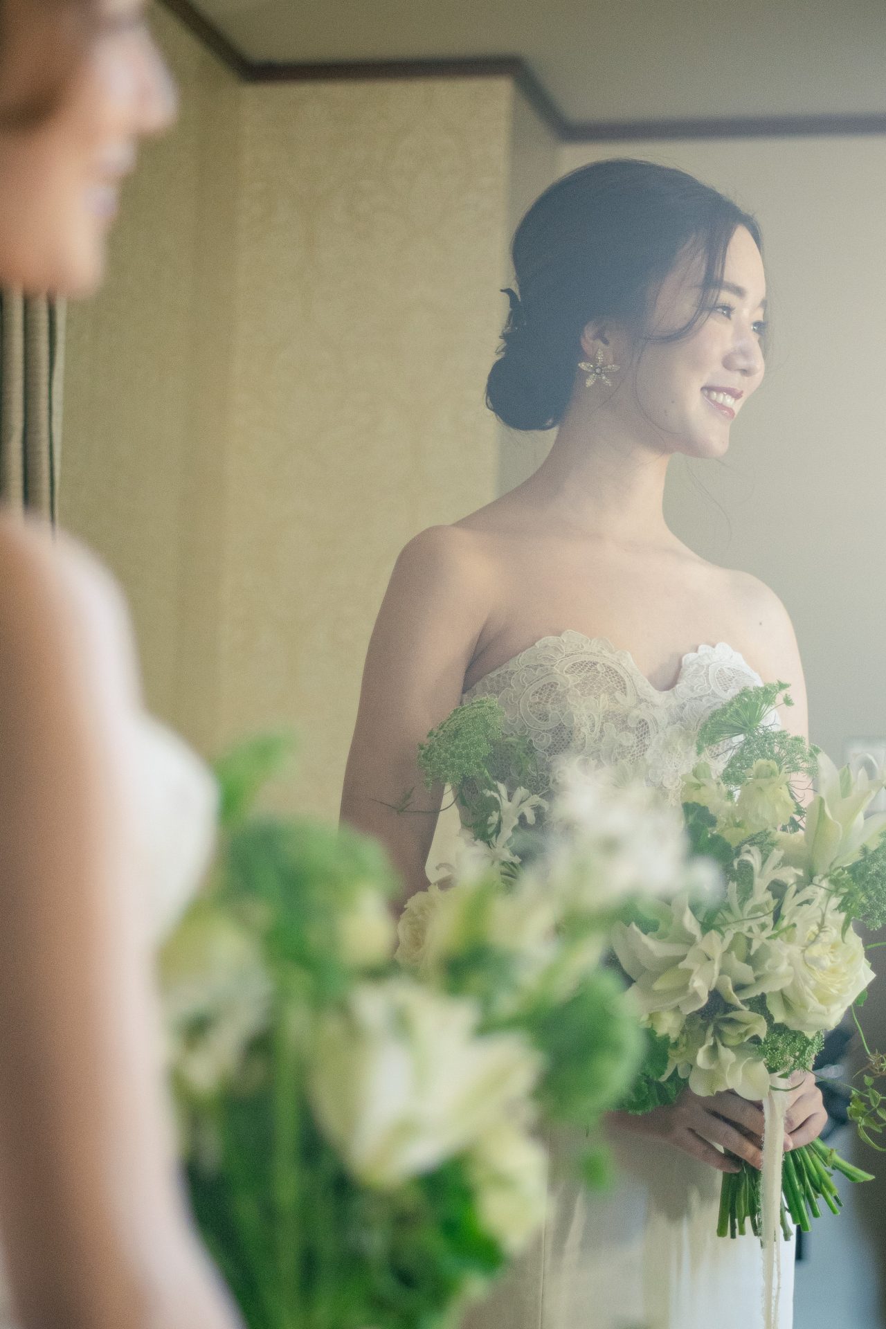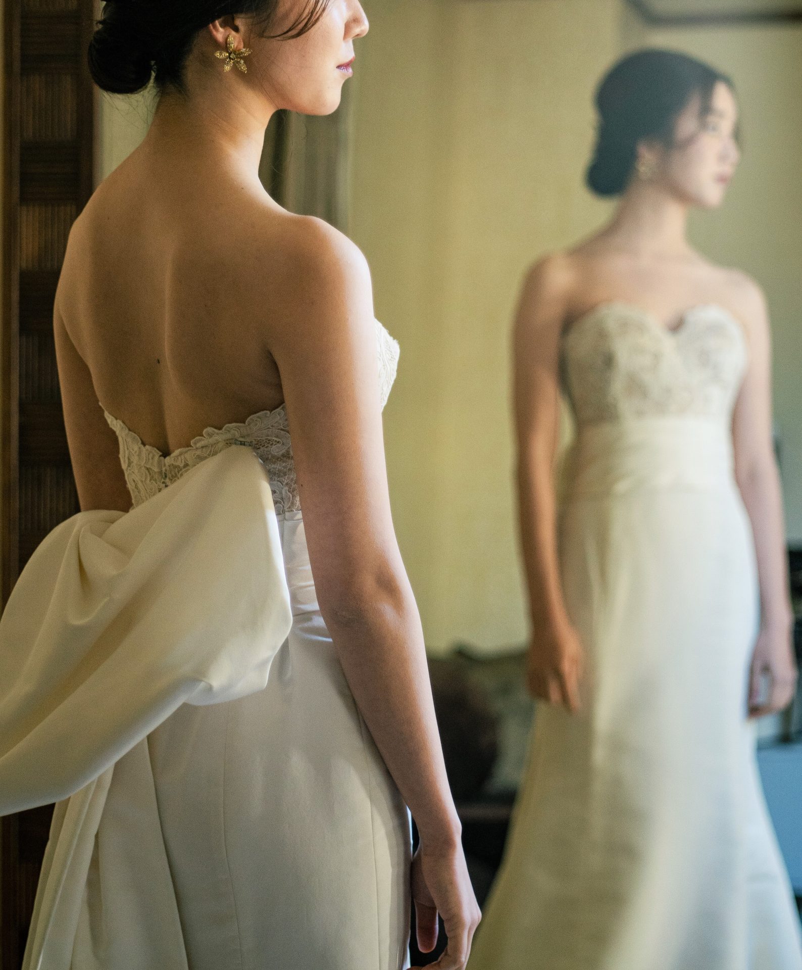 ファーストレディやセレブリティからも女性の憧れとして支持され続けるブランドOscar de la Renta(オスカー・デ・ラ・レンタ)。細やかなレースが施されたヌーディなシアータッチのトップ対して上質なシルクタフタを使用したハリ感のあるシンプルなスカート。背中には大きな片結びのリボントレーンが存在感を放ちシンプルながらもバックコンシャスなデザインは歩みを進める度にゲストの視線を集めることでしょう。そして、丁寧に仕立てられたドレスは女性の曲線美をより美しく魅せ上質な生地からクラシックな雰囲気が漂います。長く時代を超えて愛されてきたFORTUNE GARDEN KYOTO(フォーチュンガーデン 京都)の白と茶色を基調とした格式高い雰囲気にぴったりな一着です。ヌーディな色味のトップスにあわせてアクセサリーはゴールドでまとめアンティークな雰囲気に、コンパクトなサイズのアクセサリーを選び顔まわりをスッキリとした印象に仕上げました。お手元には白と緑の大ぶりなお花をメインとした大きなブーケがコーディネートのバランスをまとめてくれます。
