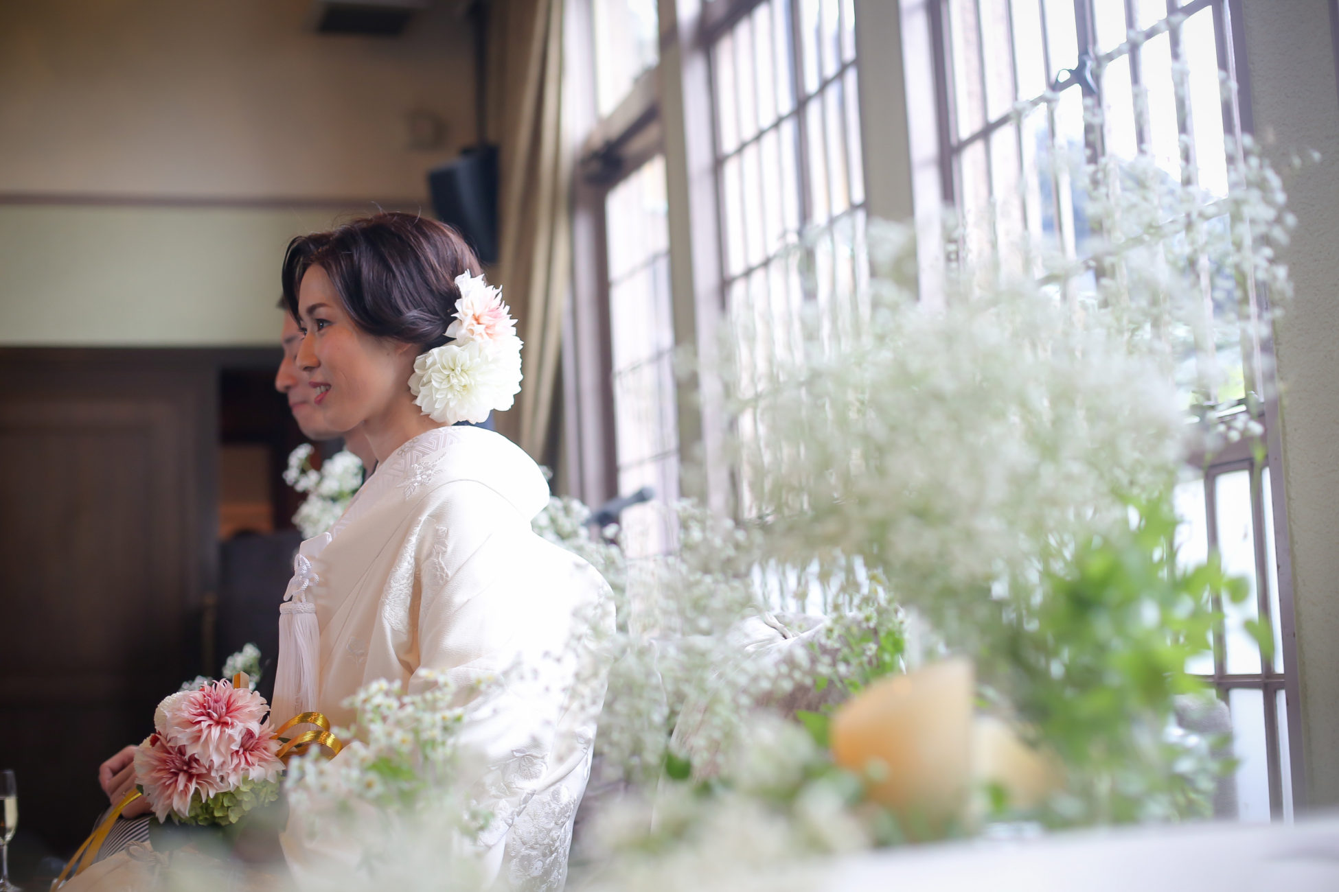 披露宴からは、綿帽子から生花にテイストチェンジされ少しモダンな印象に。