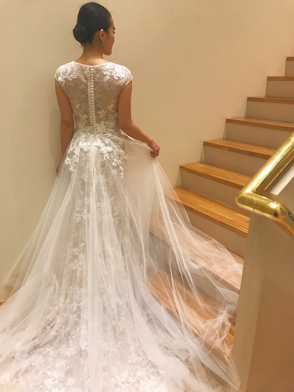 くるみボタンがあしらわれたバックスタイルには、ドットチュールを使用しており、