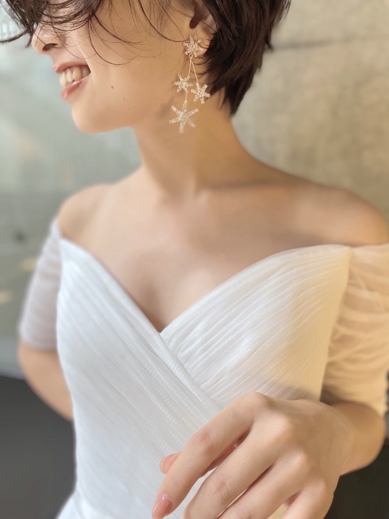 洗練されたシンプルなドレスに、大振りな星のイヤリングを合わせることで