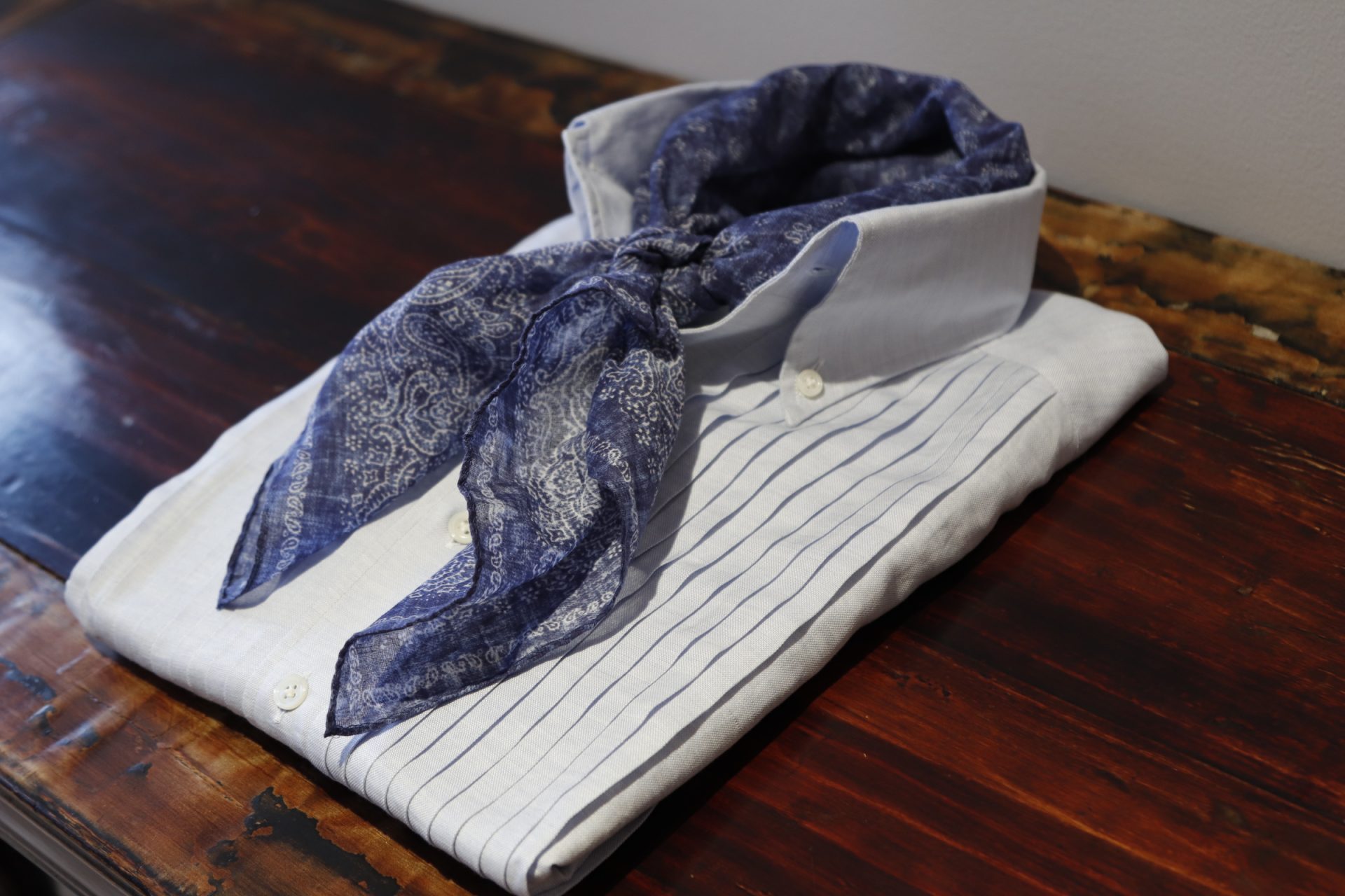 カジュアルなシャツにスカーフをコーディネートいただく事もお勧めです。
