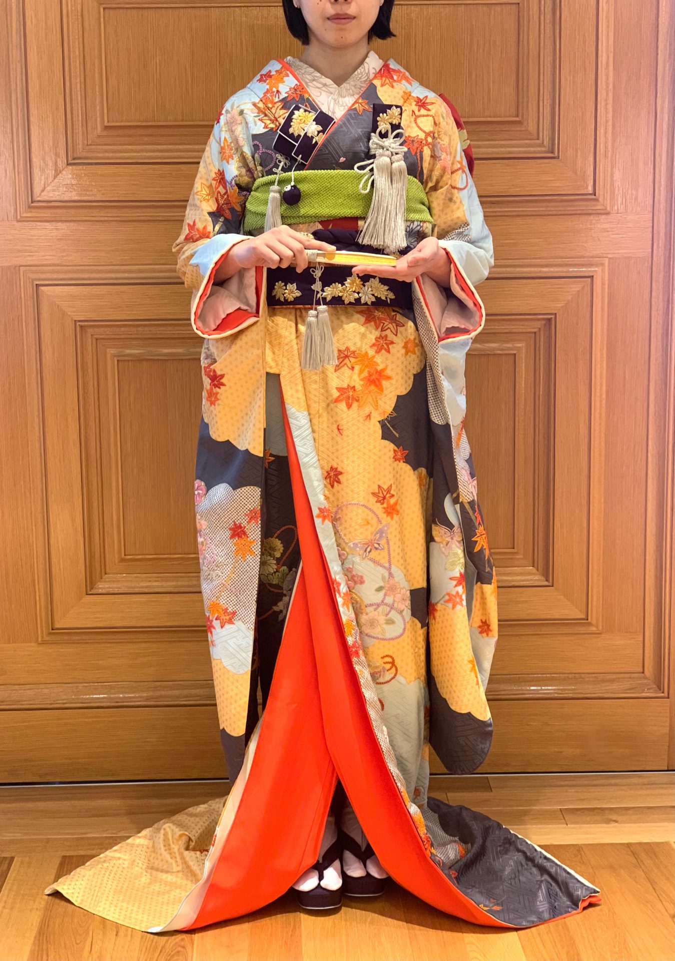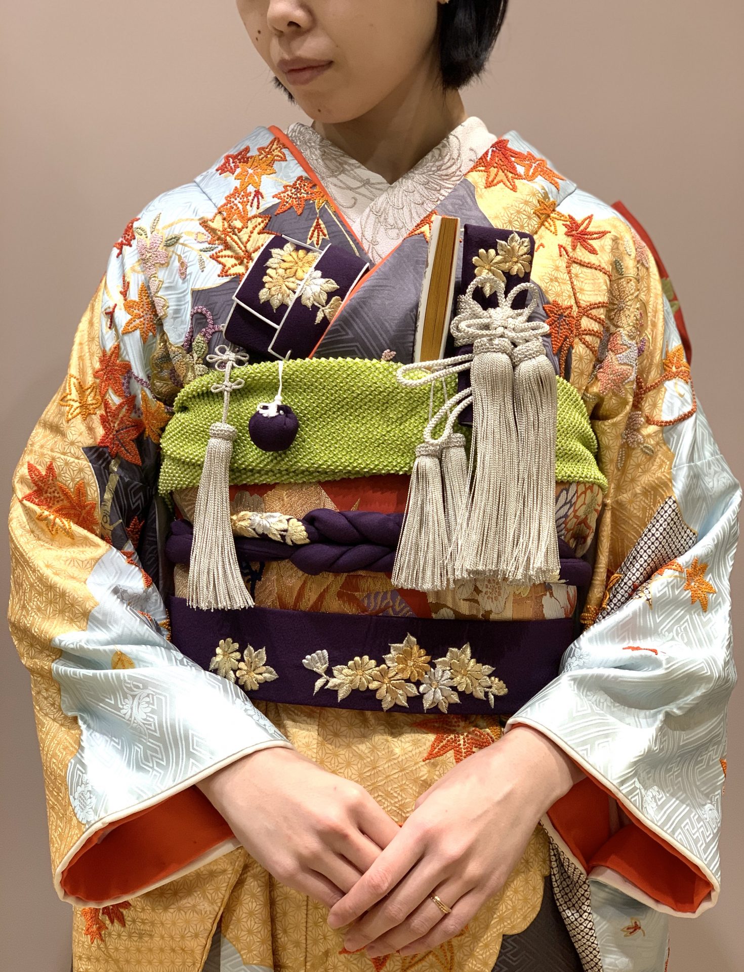 爽やかな色に黒色の染めで仕立てられたこちらの本振袖には深みのある紫色の小物を組み合わせ上品で淑やかなコーディネートに。落ち着いた印象になりすぎないように、鮮やかな黄緑色の帯揚げをアクセントに色鮮やかなスタイルを作り上げました。紅葉の柄は、楓の葉が赤く色付き紅葉に変化する様に季節により色を変え美しい色で人々を喜ばせることから世渡りが上手く幸せになれるという意味があります。秋の季節を象徴する葉ですが、柄に込められた想いから通年お召しいただける柄行きとなっています。