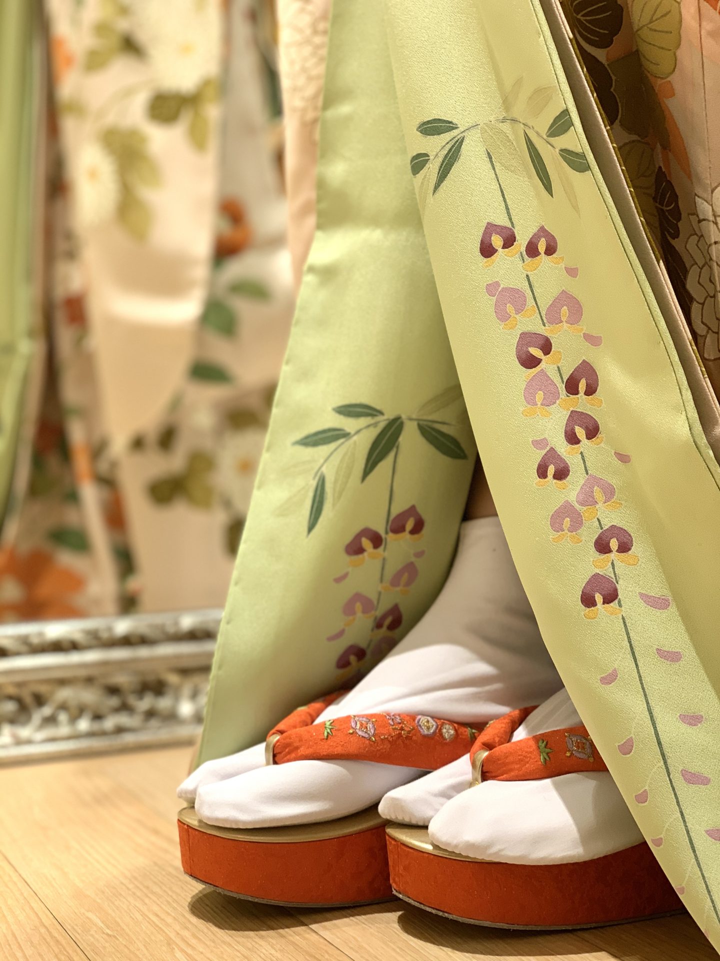 丸ぐけ、抱え帯と同じ橙色の草履を合わせ優しい色味の本振袖に華やかさをプラス。裾元には日本の代表的な染め工芸の友禅染めで丁寧に描かれた藤の花。古来日本では藤の花の紫は高貴な色とされており、花言葉は「あなたを歓迎します」。結婚式でゲストをお迎えするとき、藤の文様は格式があるだけでなく素敵な意味合いがあり大切な一日を彩ります。