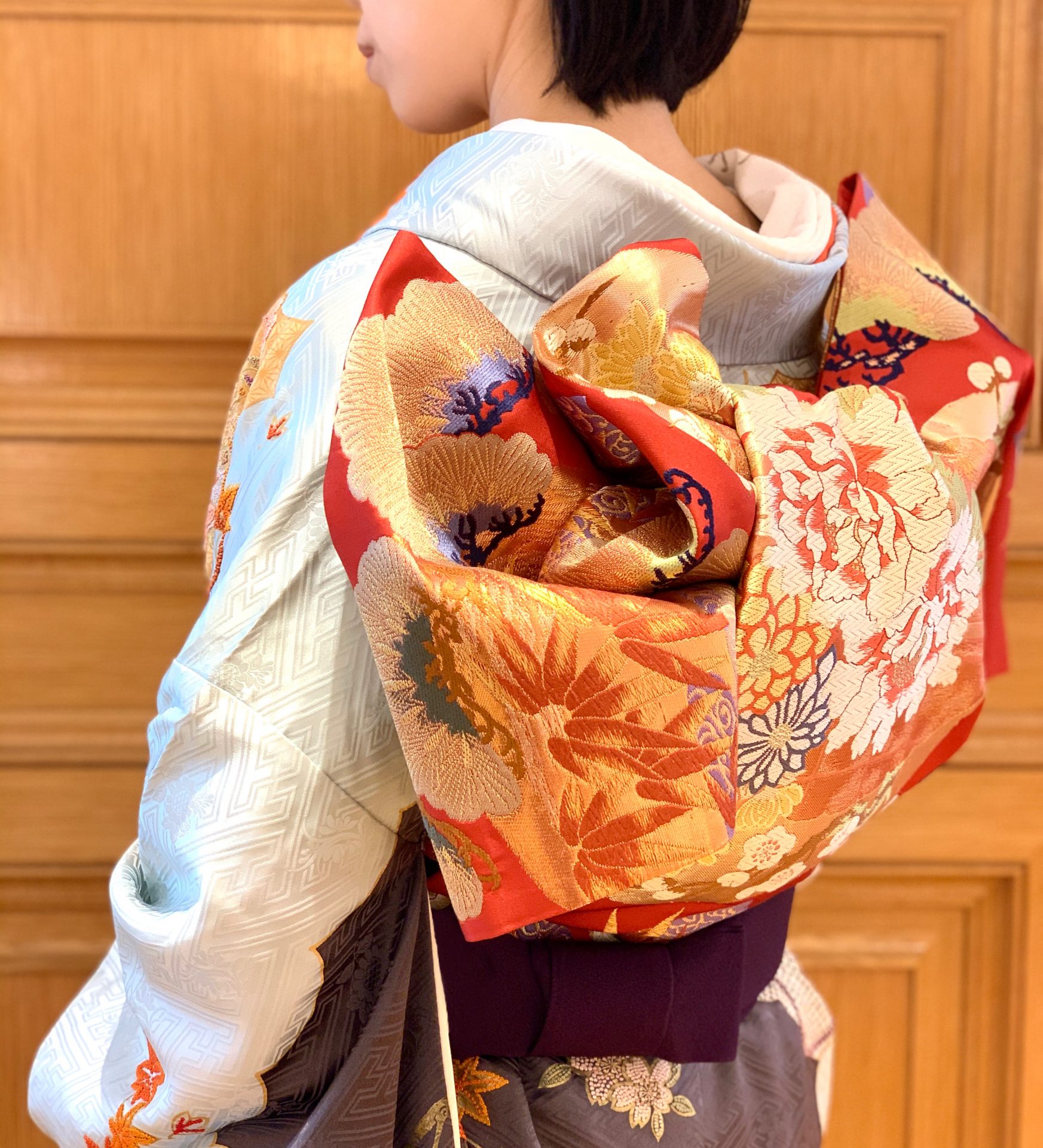 また赤色は魔除けの意味があり善きものを呼び込む力があるとされており、厄を払い今後の幸せを祈るという意味も込められています。そして帯だけでなく気品溢れる帯結びで古典的なムードをコーディネートに添えていただくのもおすすめです。