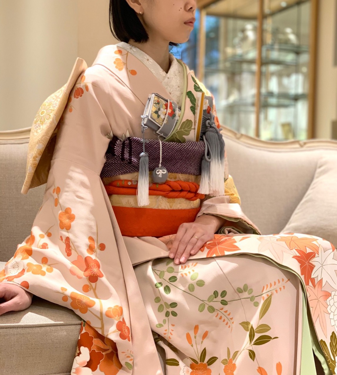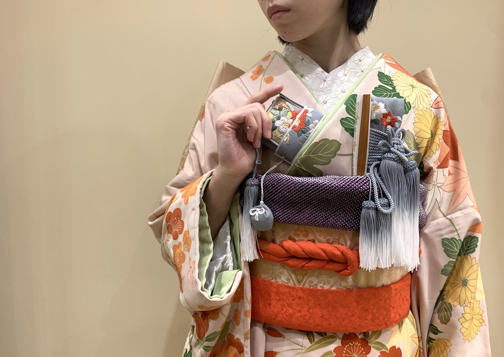 引きずる程長い裾をもつ本振袖は江戸時代後期に上流階級の花嫁衣装として愛され、昭和初期には一般的な階級の花嫁衣装として親しまれました。春夏秋冬それぞれの季節を代表する草花が描かれたこちらの本振袖。四季の移ろいを感じられる柔らかい淡地の振袖には濃地の小物を組み合わせそれぞれが際立つメリハリのある装いに。橙色と紫のように反対色をコーディネートに取り入れることでモダンな印象を与えます。