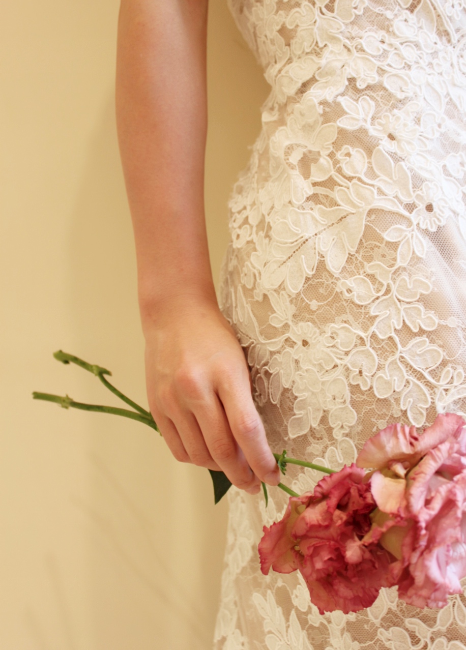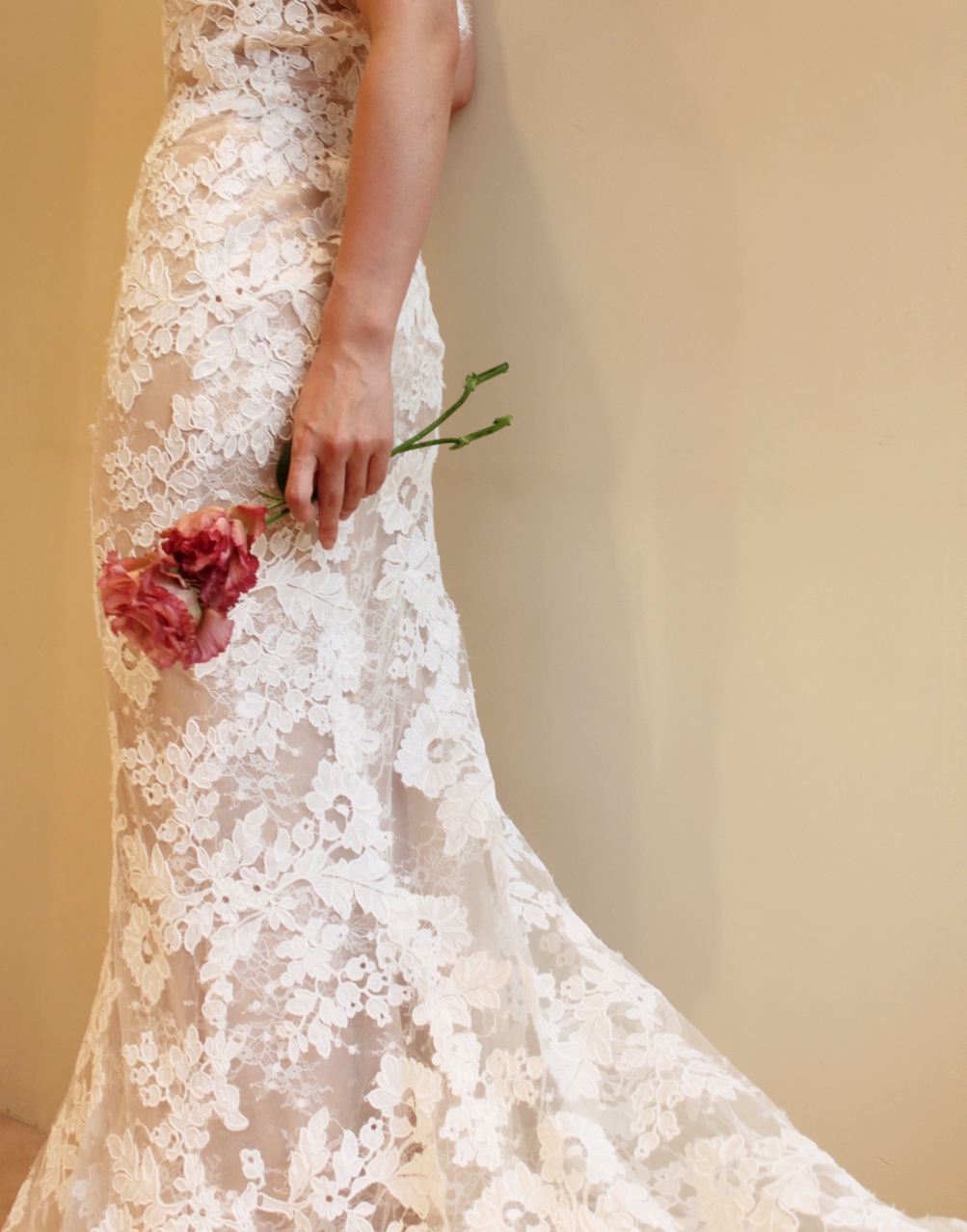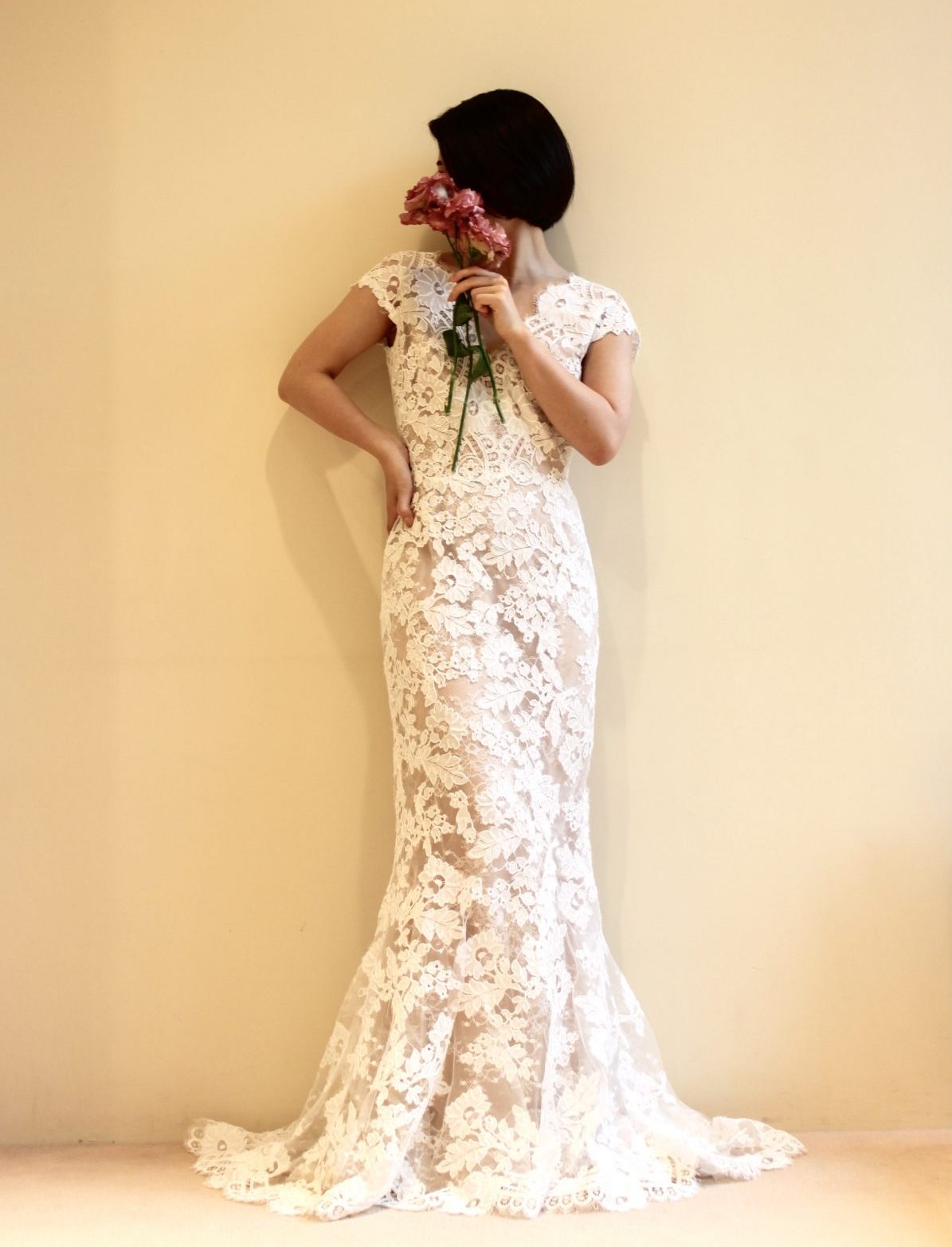 女性の持つしなやかな曲線が優美な印象を与えるマーメイドラインは身体に優しく寄り添い、Iラインを美しく魅せるように計算しつくされたもの。そのエレガントなシルエットは重厚感さの感じるレースをも軽やかに、リラクシーにお召頂ける一着です。バックコンシャスなVバックデザインではアーチを描くようにレースが施され、センシュアルさを感じさせます。袖を通した方のみが感じられるシルク生地は上質で柔らかく、肌にそっと触れる度に着心地の大切さを感じられることでしょう。コーディネートでは、はっきりとした色味のリップをアクセントとしシンプルなスタイリングに仕上げてみるのはいかがでしょうか。あえて会場の装飾やブーケなども極力シンプルにまとめ、花嫁とドレスの持つ魅力を最大限に引き出してくれるようなスタイルをおすすめです。