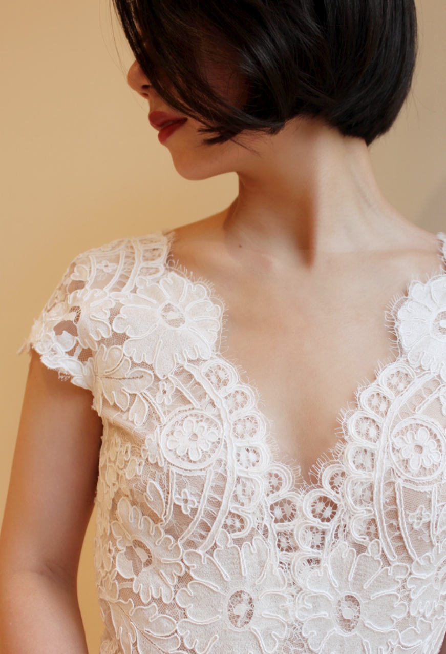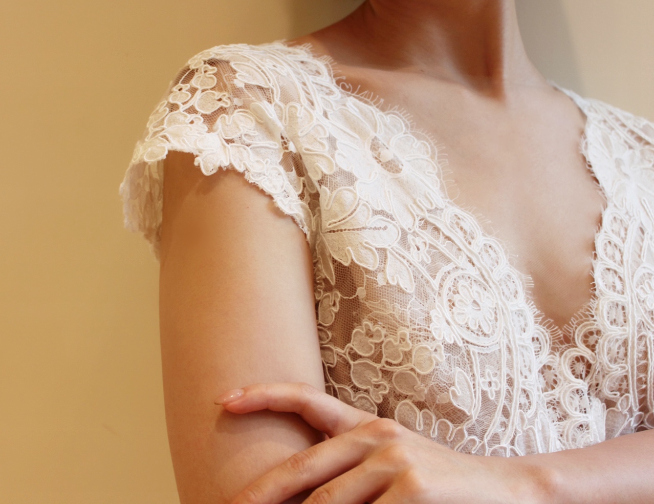 レース生地の中でも最も格が高いと言われているコードリバーレース。繊細なレースの周りに立体的な糸で縁取りされたデザインは長年かけて培った職人たちが手作業で一針一針、命を吹き込むように作りあげています。肌に馴染むように施されたヌードカラーと立体的なレースを組み合わせは、レースがより引き立って見えクラシックな雰囲気に。スッと背筋を伸ばしたその姿にゲストは心奪われ美しい佇まいに魅了されることでしょう。ブランドの真骨頂でもある「真のある美しい女性」を演出しながらもシャープな印象になりすぎないよう、レースは丸みのあるカッティングに仕立てられています。敢えて肩を覆うデザインにし身に纏う花嫁をそっと温かく包み込んでくれ、麗しくもリラックスしたムード溢れるお姿に。ゲストと距離近くアットホームに楽しみたい、けどお式らしくクラシックな雰囲気を堪能したい。そんな想いをお持ちの花嫁におすすめのウェディグドレスです。