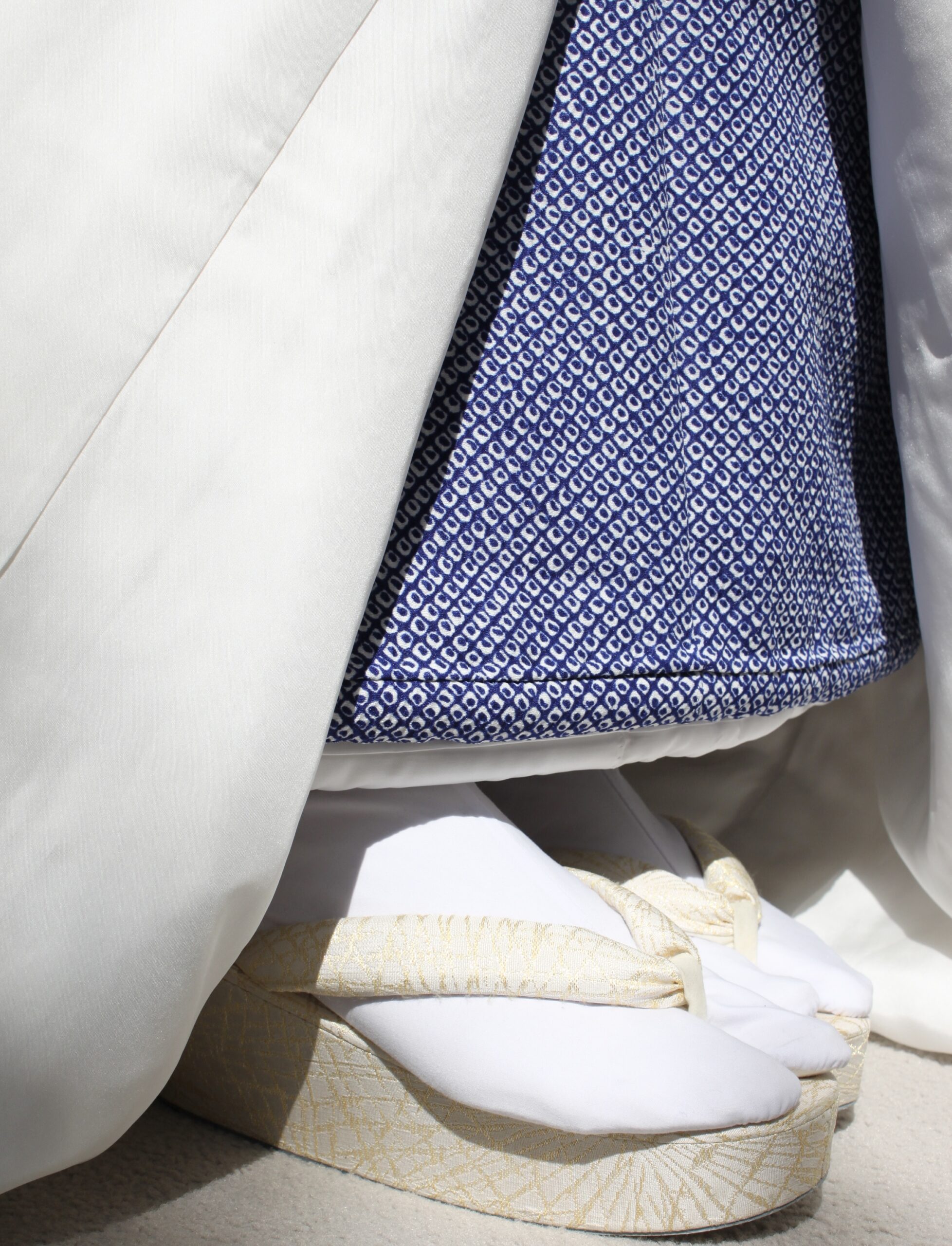 先程ご紹介した赤の色掛下の色違い、青の総絞りの掛下をセレクト。空や海を連想させる爽やかな色の青は古来より日本人にも馴染みのある色です。品のある青の色掛下には、金が控えめに施された麻の葉のお小物と草履を選ぶことで上品かつ凛としたコーディネートに。奥ゆかしさが感じられる繊細な柄や色のお小物ですが、そこに施されたインパクトのある金の房が鮮やかな青の色掛下と相まって、全体の優美さの中に引き締まった印象を与えます。落ち着き感のある青を基調とした爽やかなコーディネートで、これからの夏の時期に緑溢れる京都の前撮りや結婚式を過ごしていただくのも素敵ですね。