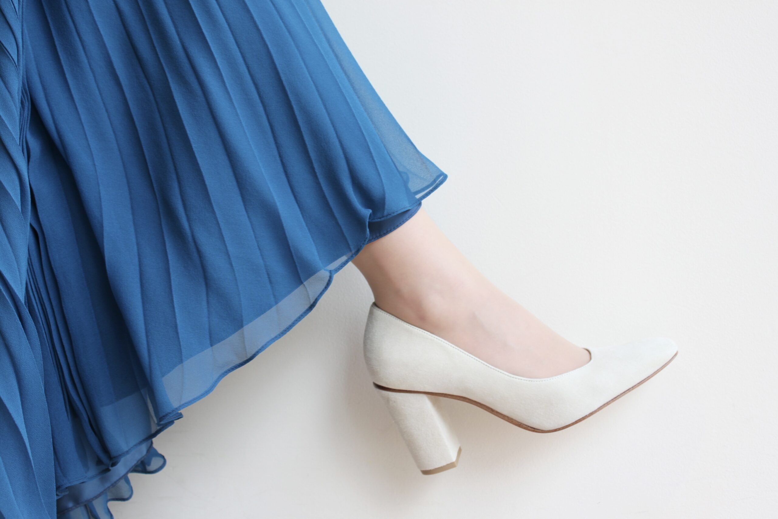 煌びやかなビジューが施されたドレスに合わせるアクセサリーは、艶やかなゴールドとクリスタルが施されたリーフのイヤリング。華美すぎないミニマルなデザインは花嫁の横顔にそっと華やかさをプラスしてくれます。ヘアは背中のデザインを魅せるため、シンプルにキュッと纏めたタイトなシニヨンスタイル。その凛とした佇まいにゲストも思わず心を奪われることでしょう。足元はドレスの柔らかなジョーゼットの生地に合わせ、自然に溶け込むのHAAVE(ハーヴェ)のスウェードシューズを合わせます。全身を煌びやかに彩ったぶん、ヌーディなシューズでバランスをキープしたコーディネートに仕上がりました。