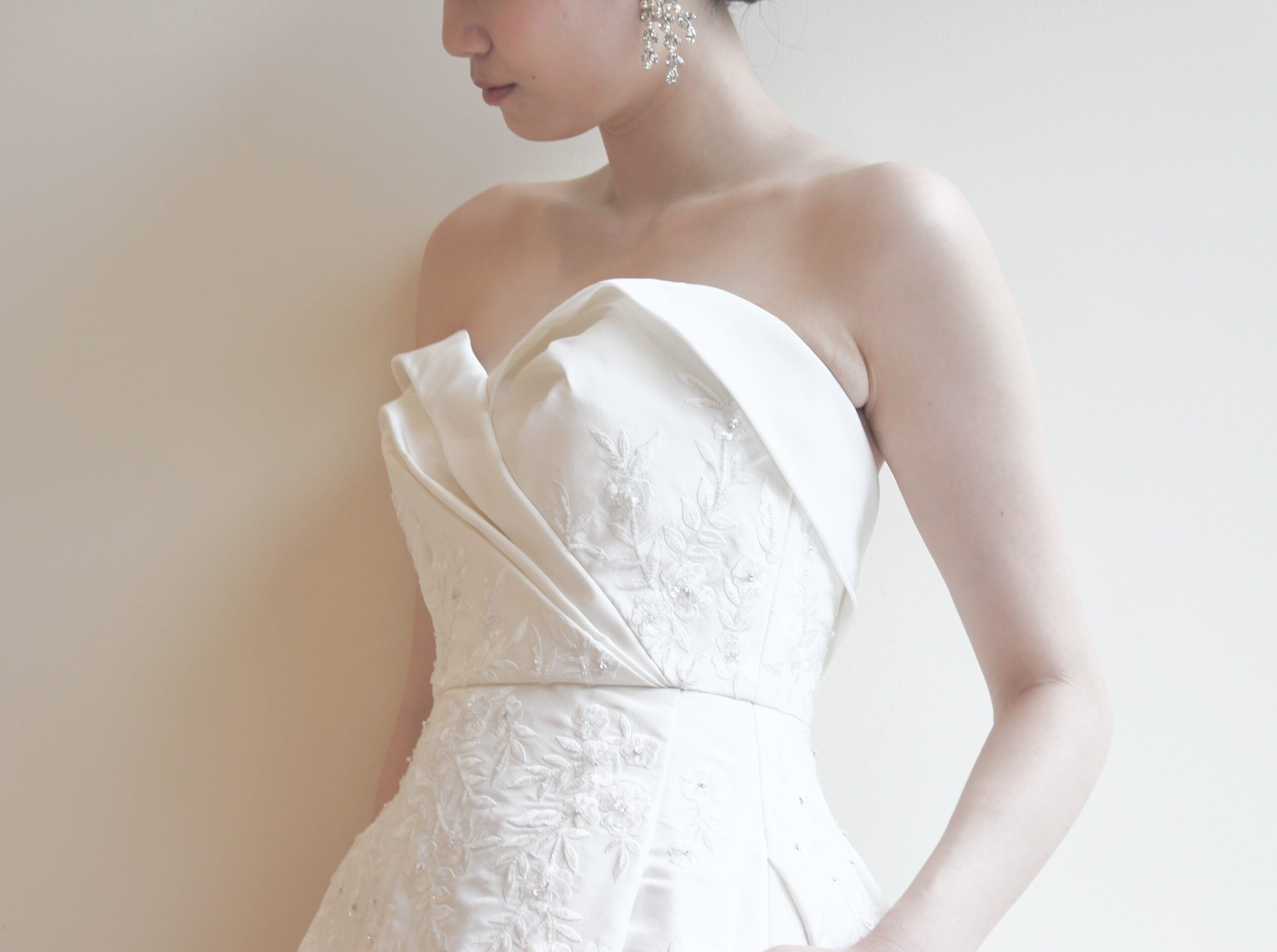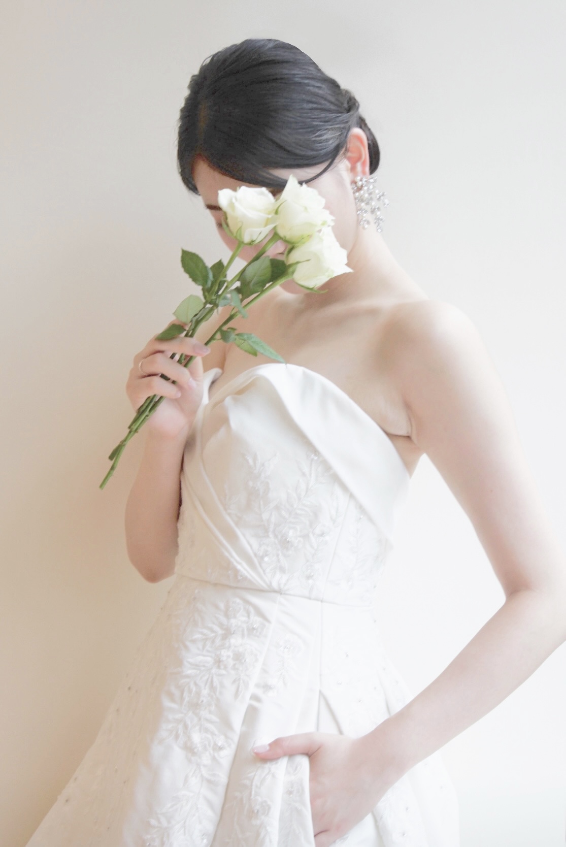 胸元は身体にフィットしやすいハートカップなので、ビスチェタイプのドレスでありながらも安心感があり、気兼ねなく美しい所作とともに大切な人達との時間を過ごすことができます。ビスチェ部分の折り返しになったデザインや綺麗に寄せられたギャザーが身体のラインに立体感を与え、女性らしいシルエットを創り出してくれます。流行り廃りのないシルエットでありながらも、そこにモダンさが加わることでフレッシュな抜け感を感じさせます。