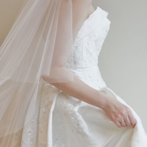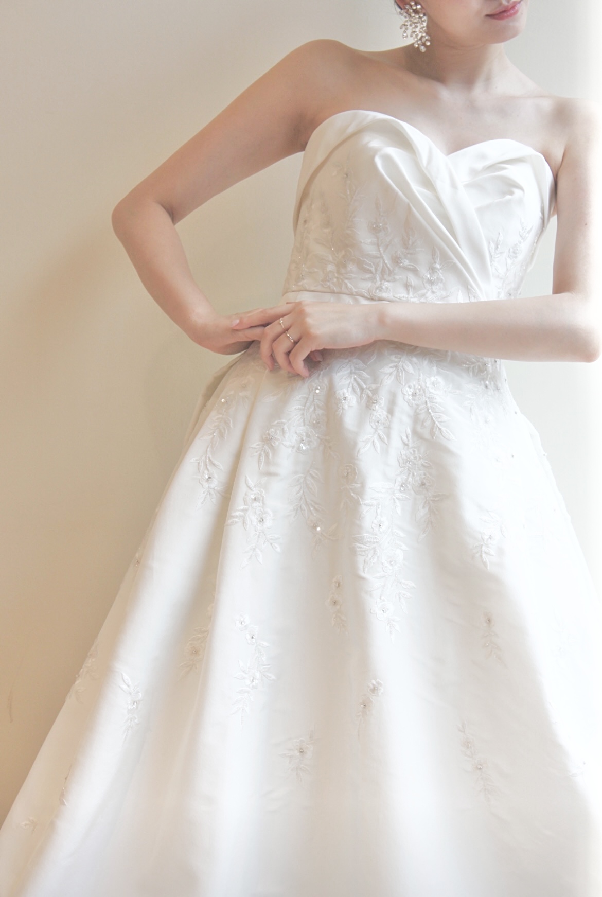 また、流れるように施された刺繍は自然な動きを生み出し、シルエットとデザインのバランスが絶妙にとられています。計算して配置されたボタニカル模様の刺繍も大きすぎず、小さすぎず、上品さと可憐さを全面に演出します。レースの装飾とはまた違い、刺繍には刺繍にしか作り出せない立体感があり、どこか和装を彷彿させるその姿はまさに京都エリアのクラシカルでモダンな結婚式場にぴったりです。