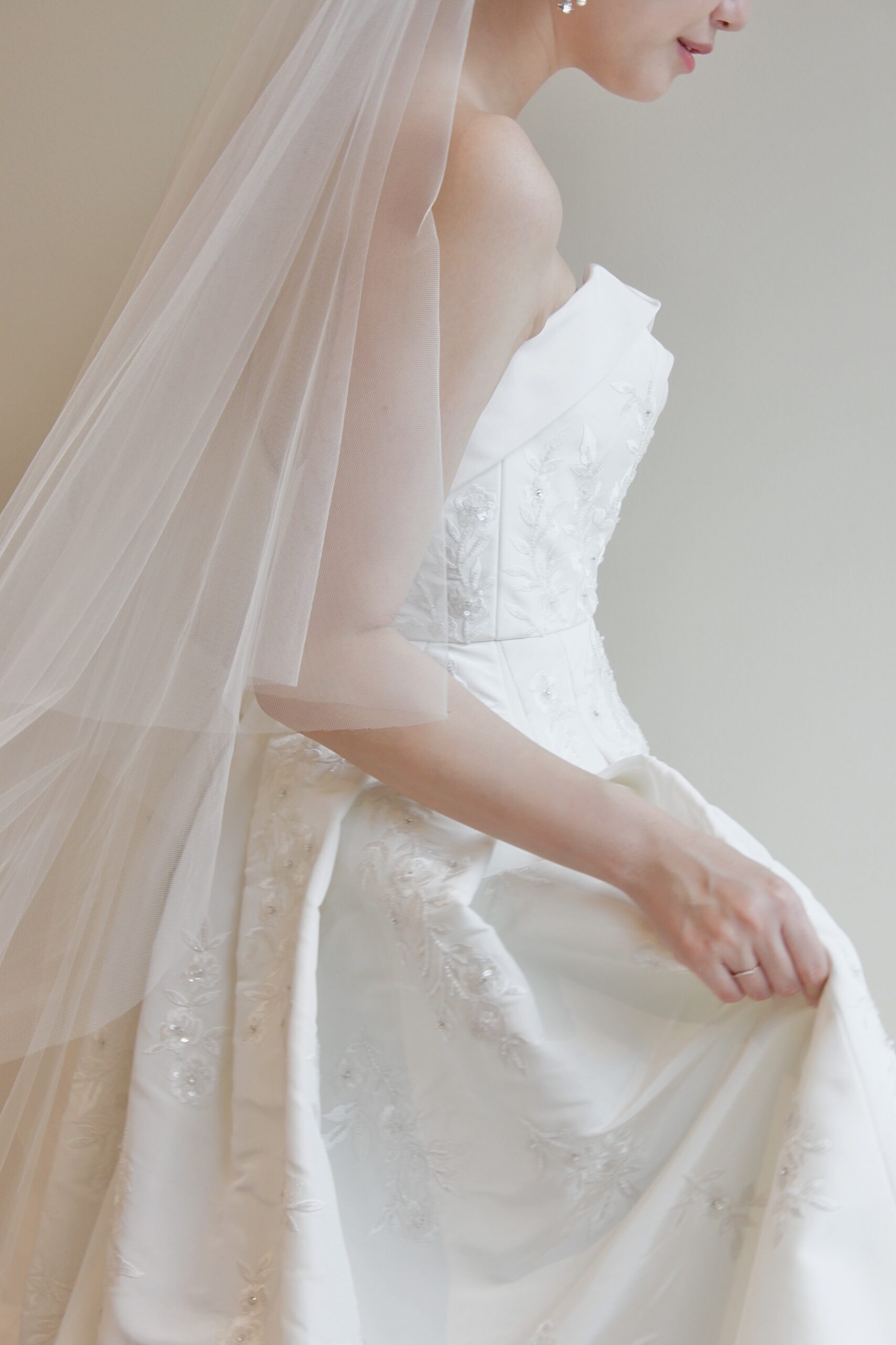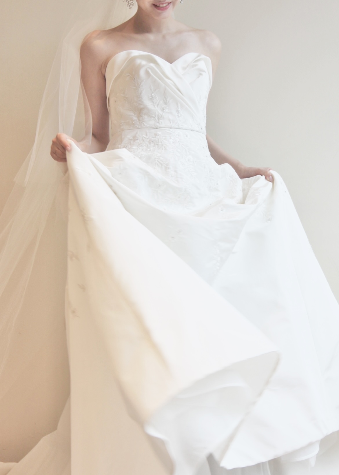シンプルながらも圧倒的な上品さと存在感を放つこちらのウェディングドレス。凛とした佇まいが、まさに花嫁の憧れが詰まった神秘的なチャペルでの挙式にぴったりです。シルクファイユという軽やかな素材を使用しながらも、見た目には重厚感を感じるので、大切な人達とのこれまでの思い出を振り返りながら歩むバージンロードでの一歩一歩に重みが加わります。愛する人とこの先も手を取り合って幸せに溢れた時間を過ごしていくという花嫁の真っ直ぐな決意を感じる一着。