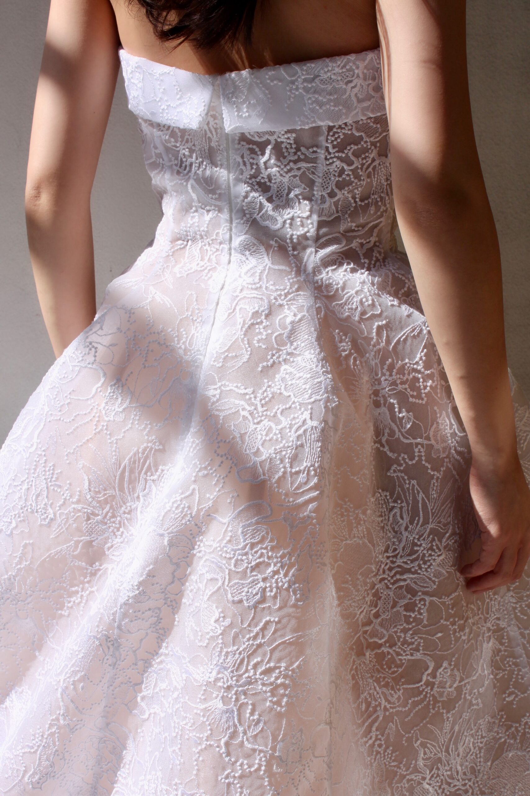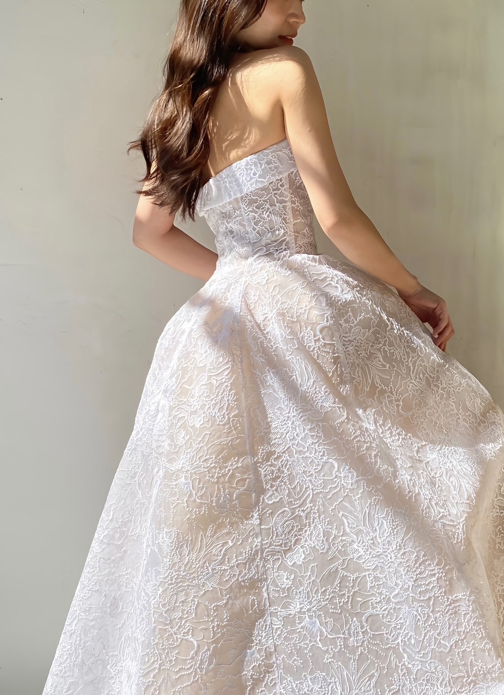 女性が一度は憧れを抱く、ふんわり広がるシルエットは時代を超えて愛されてきました。そんなボリュームのあるシルエットに中東らしさを感じる立体的で細やかな総レースが心奪われるこちらのウェディングドレス。レースはデザイナー、リズの審美眼によりセレクトされた繊細な手刺繍レースを贅沢に使用しております。どこかボタニカルテイストなレースは中東らしさを感じながらもご新婦様をエレガントな佇まいへと導きます。また艶感のある純白の糸で紡がれたレースは、チャペルであたたかな日の光に包まれることで洗練された気品ある印象を与えることでしょう。レースの内側にはあえて少しピンクがかったヌードベージュのライニングを重ねることによりレースの模様を存分に引き出すのはもちろん、女性の内側から溢れ出す自然体な美しさやモダンな雰囲気を感じますね。