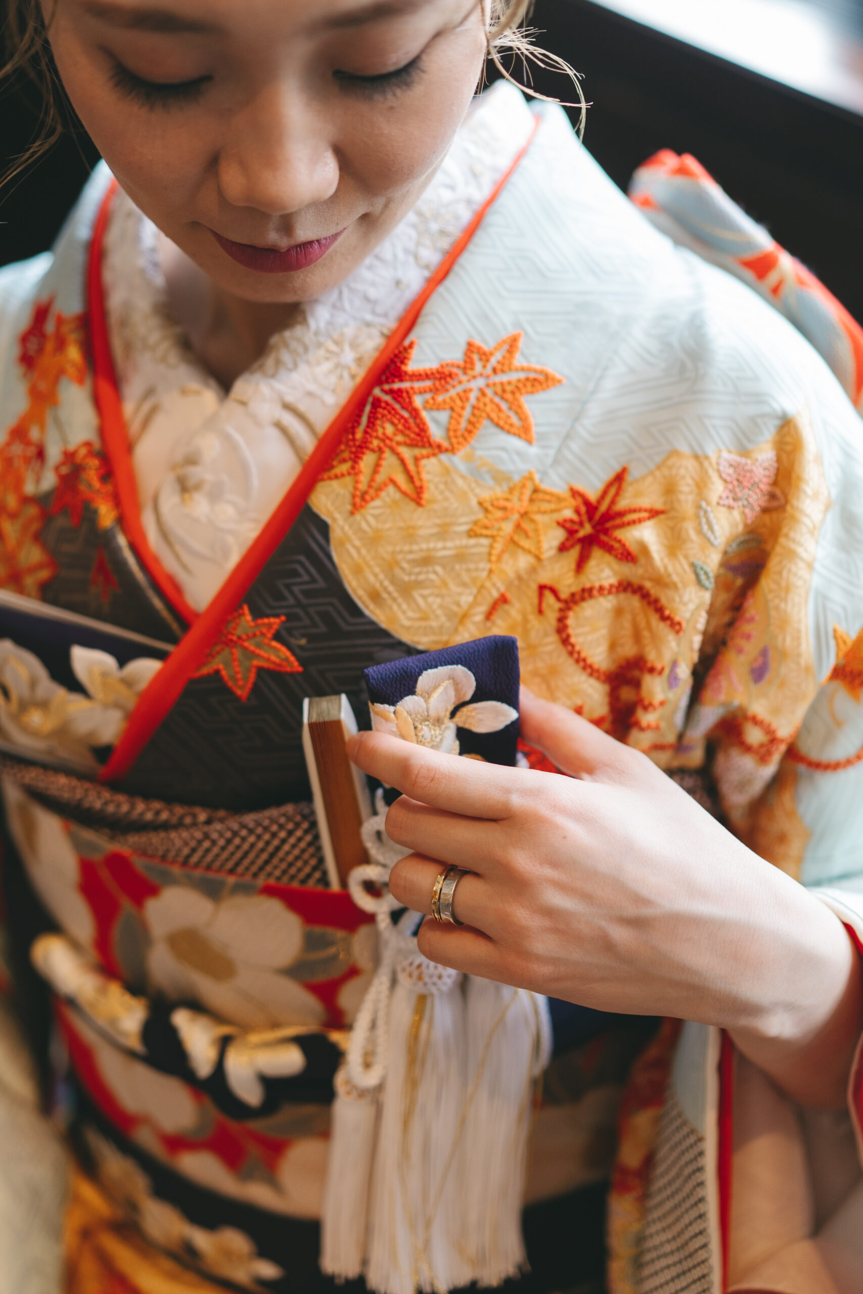 前撮りでご新婦様がお召しになったのは水色や灰色、朱色や桃色のは配色が柔らかさの中にも凛とした印象を与えます。柔らかな手描き友禅に相良刺繍の紅葉と桜が立体的に施されている本振袖。本振袖はおはしょりをせず裾を引いて着付けられることから別名「引振袖」とも呼ばれています。袖を引く優美な姿が、女性らしく高貴な印象を放ち、江戸時代後期より上流階級の花嫁衣裳として愛されてきました。ご新婦様にお見立てしたこちらの一着は水色と灰色が目を惹く古典柄の本振袖。柔らかな水色と灰色がモダンな印象を与え、レトロモダンなフォーチュンガーデン京都にぴったりの一着です。そして裾にあしらわれた施(ふき)の色が朱色で仕立てられており、柔らかな色味の水色と相まって上品な印象を与えます。美しく描かれた柄行には様々な意味が込められお二人の門出を祝福します。紅葉は桜と並んで、秋の季節感を象徴する柄ですが、葉の色が変わることから変化を表す文様でもあり季節を問わず通年でお召しいただくことができる吉祥文様として古来から愛されてきました。紅葉の柄行は楓が色づく様子から季節により色を変え美しい色で人々を喜ばせることから「世渡りがうまく幸せになれる」という意味があります。桜はたくさんの花が芽吹く春の花の象徴として「繁栄」「豊さ」を表しており、花嫁の幸せを願った柄が施されている本振袖なのです。このように一つひとつ意味が込められお二人の幸福に寄り添うように描かれた柄行は周りを明るくするような愛らしい笑顔が溢れ、そして内面から溢れる優しさと美しさがあるお人柄のご新婦様だからこそお召しいただきたい一着でした。永く愛されてきた歴史あるフォーチュンガーデン京都には本振袖のような伝統的な衣裳も相性がよく、洋館×和装というフォーチュンガーデン京都だからこそ叶えられる、和モダンで他にはないテイストは一目見た瞬間に人々を魅了することでしょう。