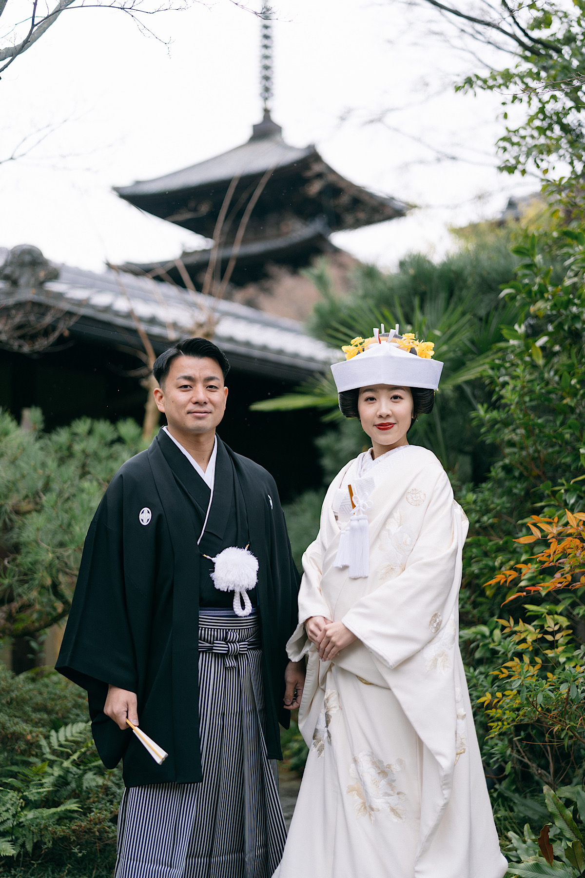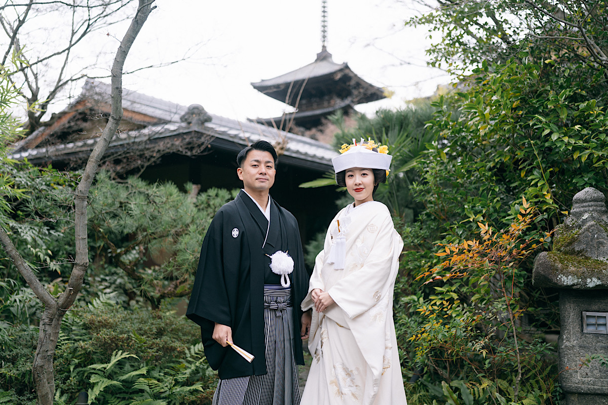 日本の伝統衣裳の白無垢と紋付袴を身に纏い執り行う八坂の塔が見える京都の結婚式会場ザ ソウドウ 東山 京都で叶える和装結婚式人気のドレスショップ ザ トリート ドレッシングがおすすめする京都らしさや和を堪能できる着物で過ごすお色直し衣装