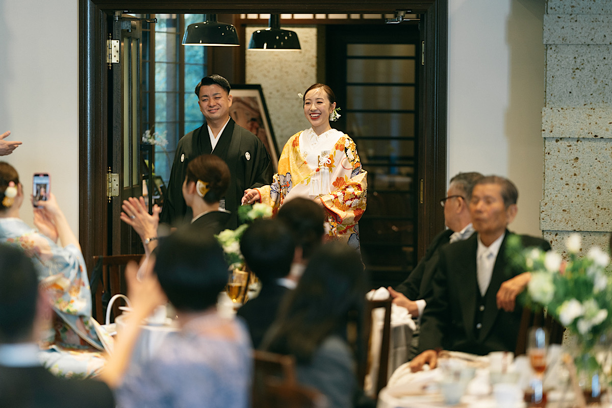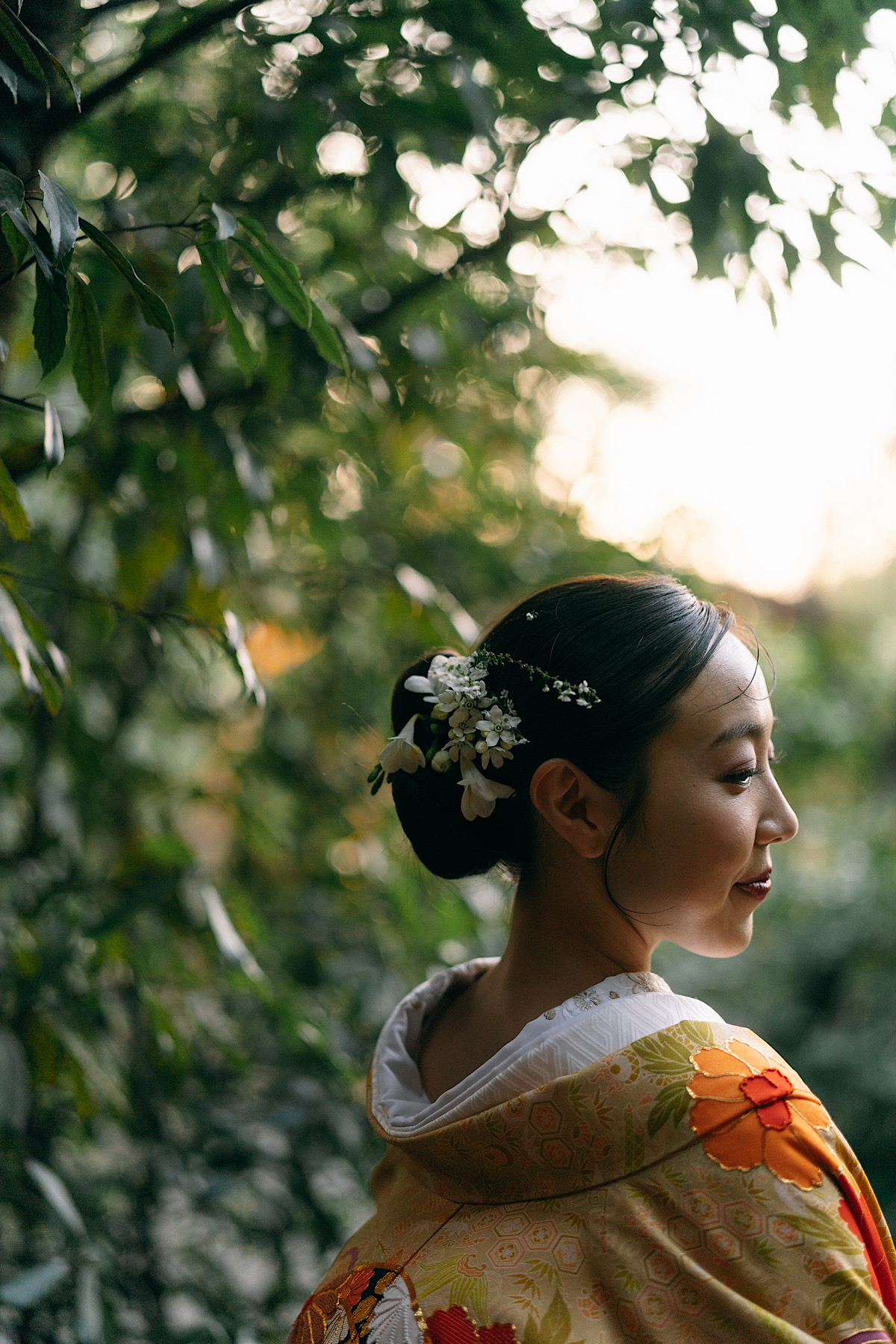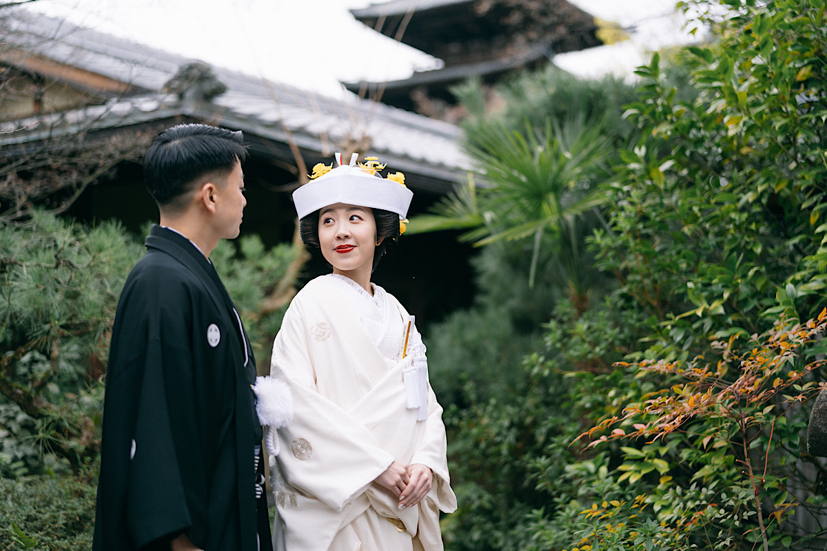 そして、白無垢の着こなしとして日本の伝統を大切にされたご新婦様は、角隠しを合わせました。角隠しとは、頭を覆う形で被る帯状の布を指します。日本髪を結い角隠しを被るご新婦様は、品格があり、淑やかな佇まいに。お隣に並ぶご新郎様は、最も格式の高い黒の紋付袴をお召しになりました。この京都の土地で、古き良き日本の伝統に敬意を払うお二人の着こなしは、時代を超えて美しく皆様の記憶に残るものとなったことでしょう。