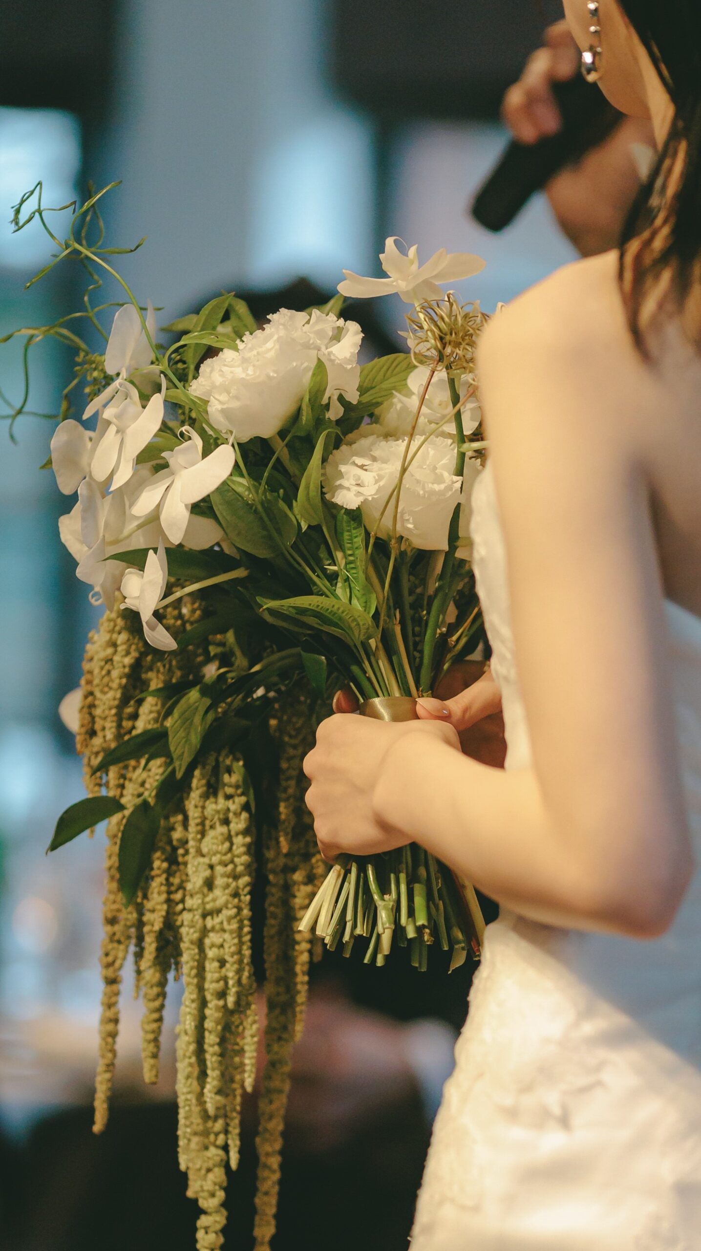 クラシックなウェディングドレスには、タイトにまとめたシニヨンヘアにグリーンとホワイトの躍動感あるブーケを合わせ、洗練さとモダンさが掛け合わされたコーディネートに。