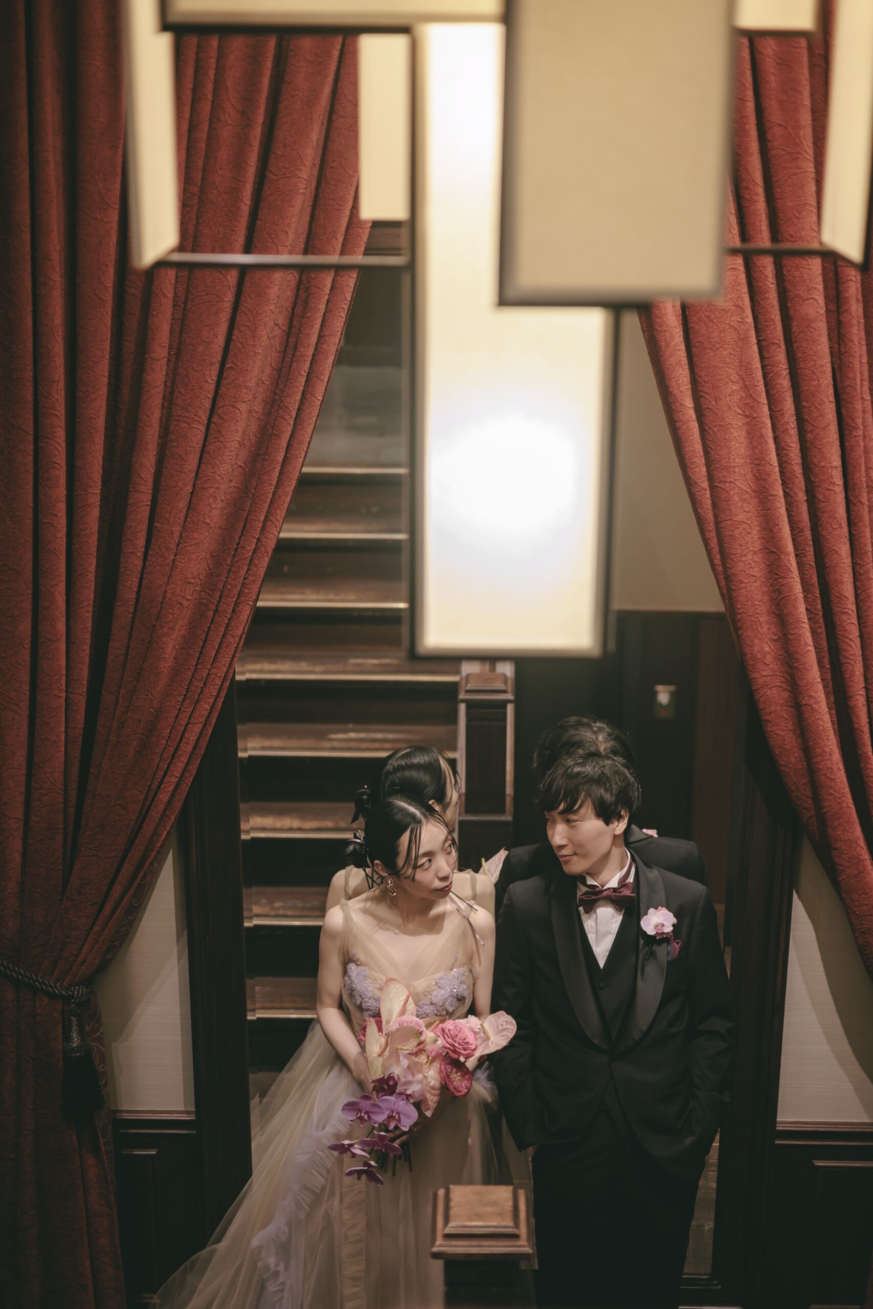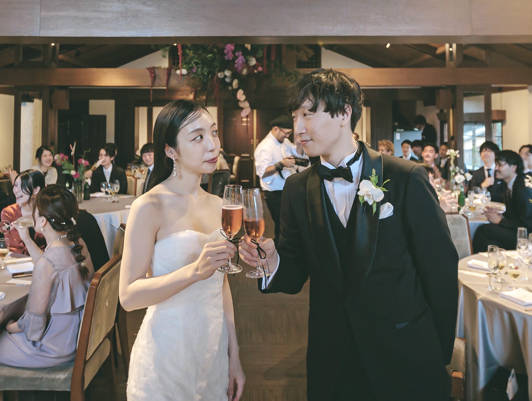 挙式のクラシックな着こなしとは一変、エレガントかつモダンな着こなしを叶えられました。
