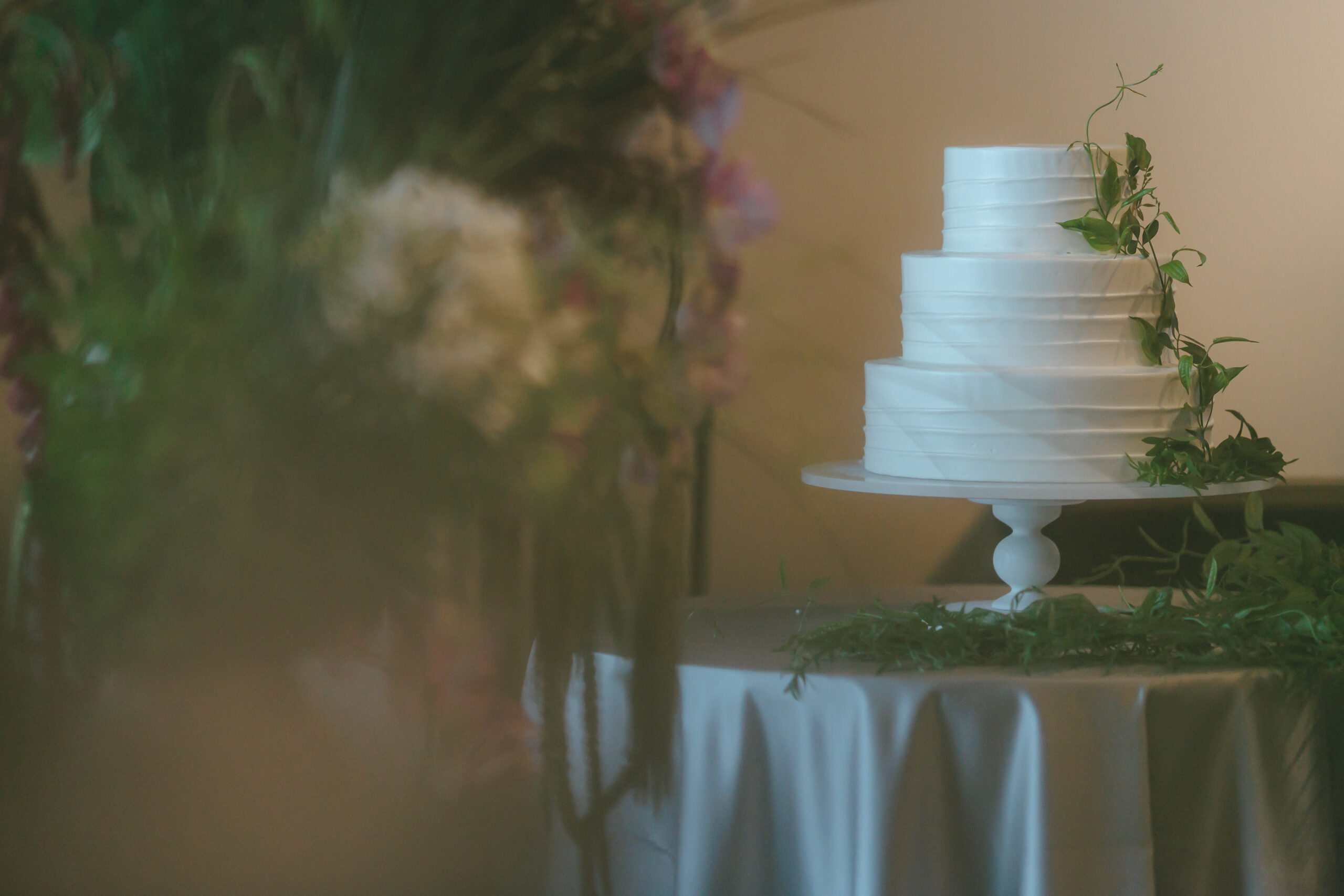 会場の中心に配置されたダイナミックな装花、洗練されたカラトリーやペーパーアイテム、シンプルさを追求したウェディングケーキ…